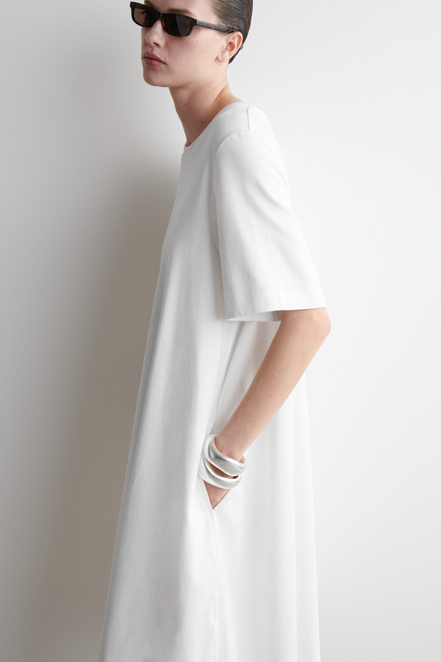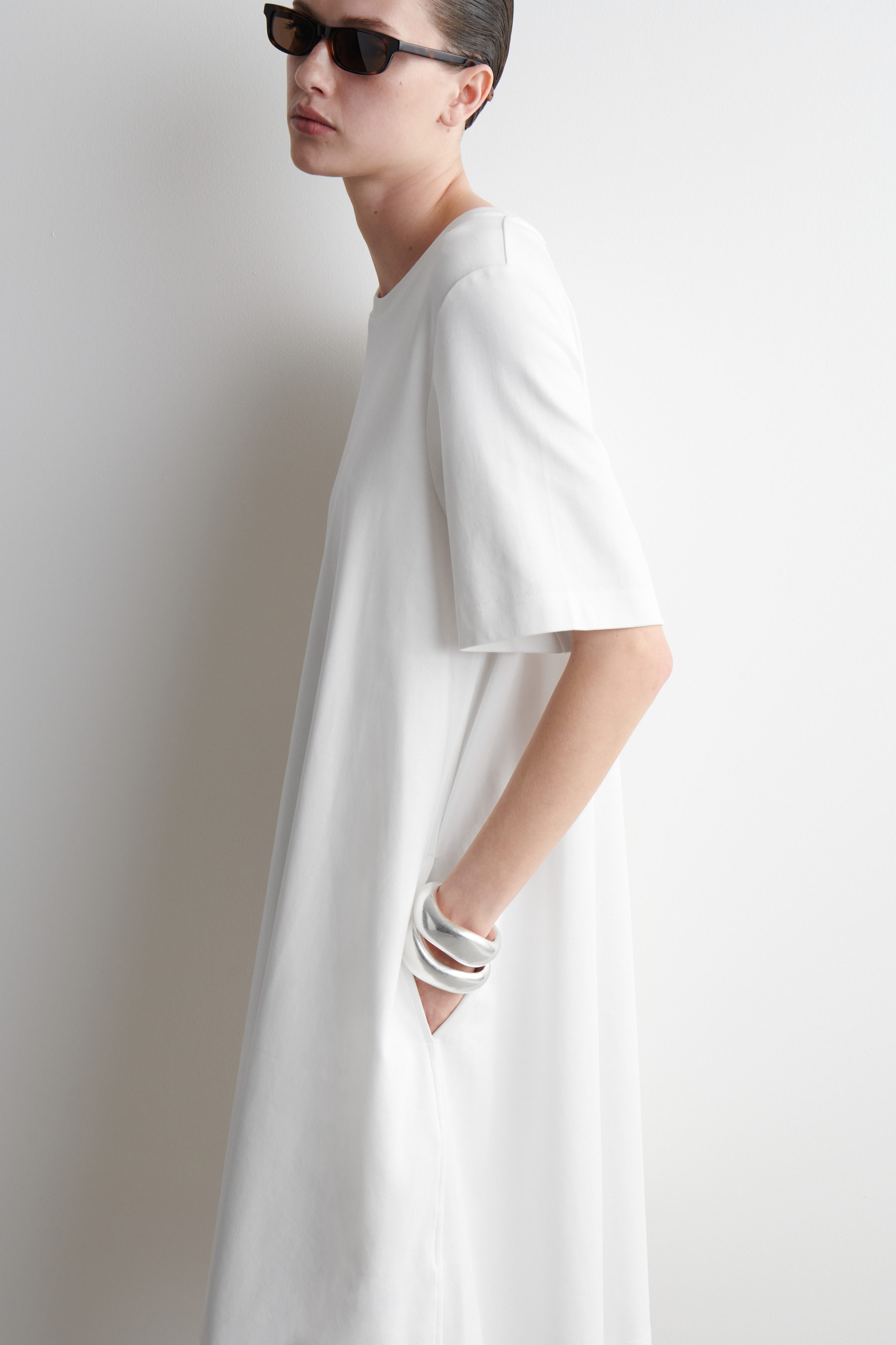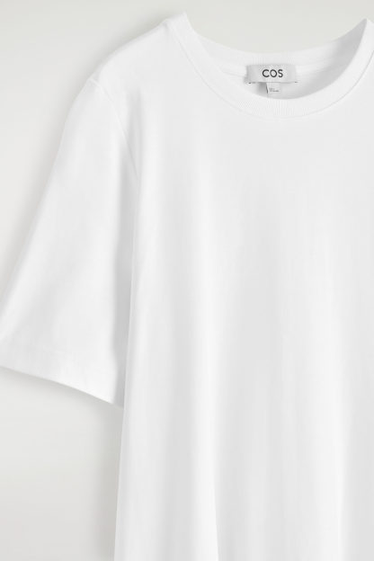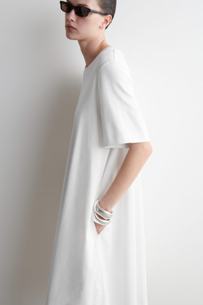 The perfect piece for balmy days, this modern T-shirt dress is made from naturally breathable cotton and cut in a relaxed silhouette. It has an A-line shape that adds to its airy feel and is finished with subtle slip pockets at either side.