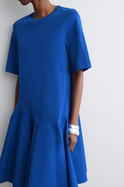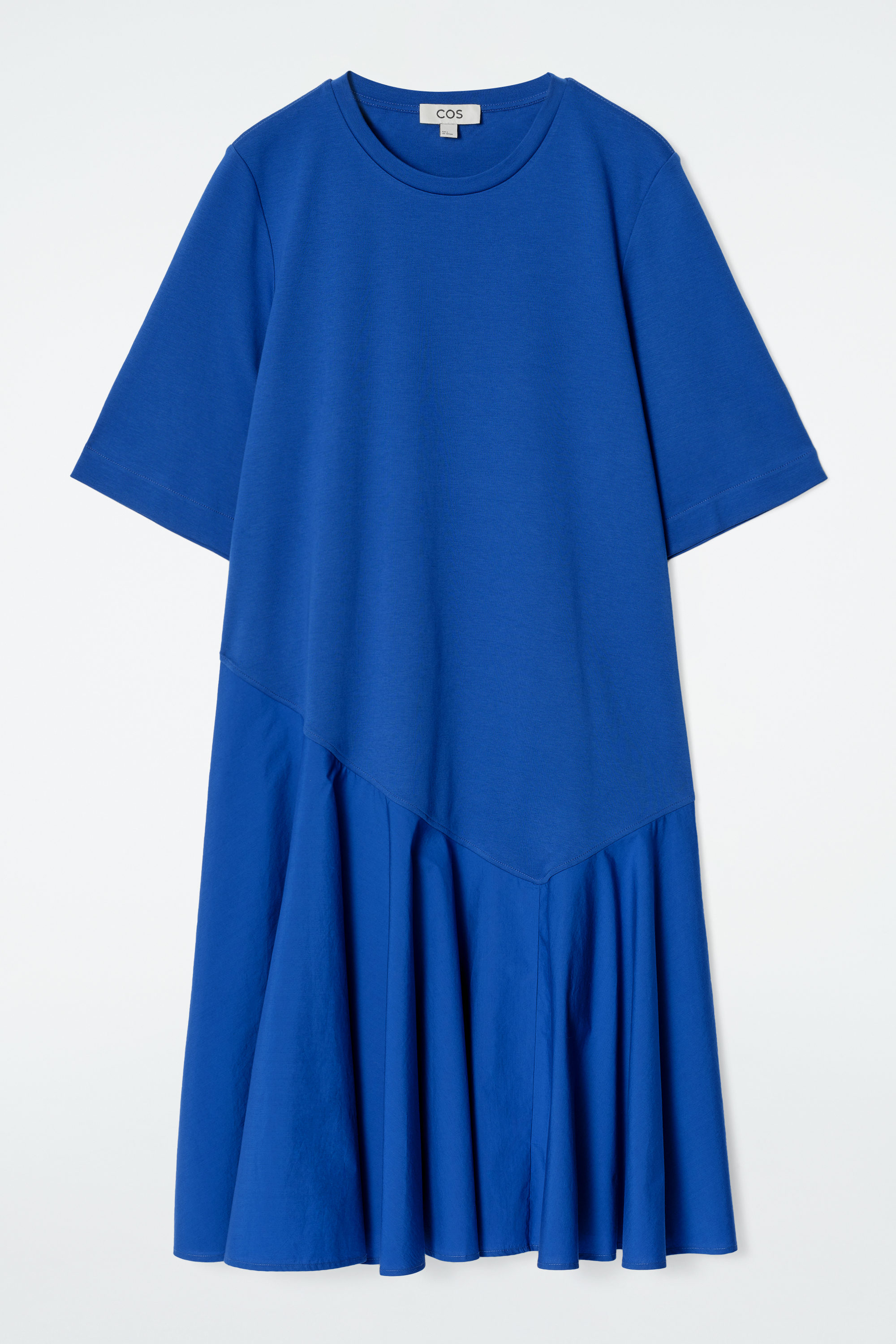 This season, the womenswear team reimagine the classic T-shirt dress with a fresh point of view. It's designed with a cotton-jersey top half that drops into an asymmetric poplin hem. Style it with knee-high boots to highlight the mini length.