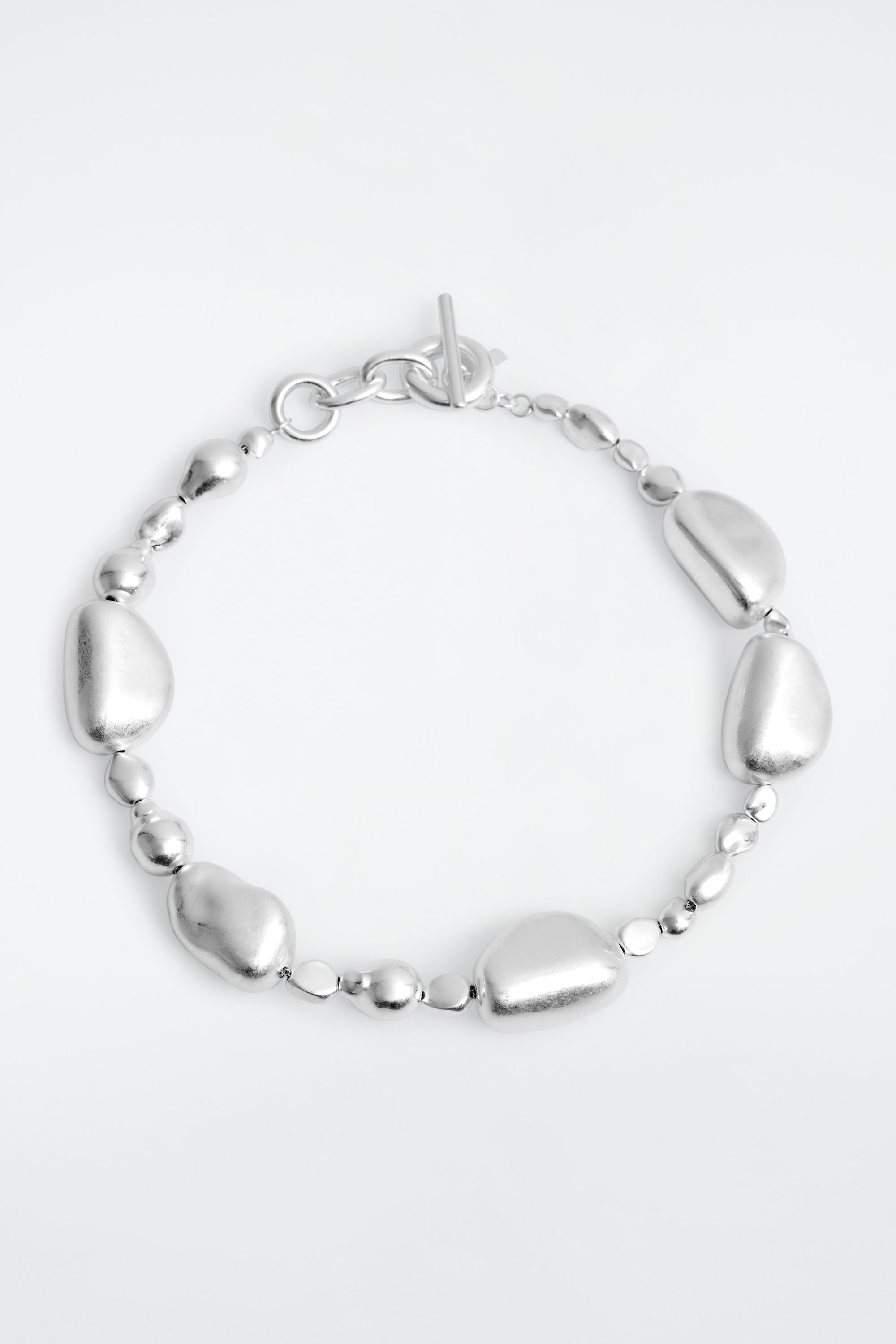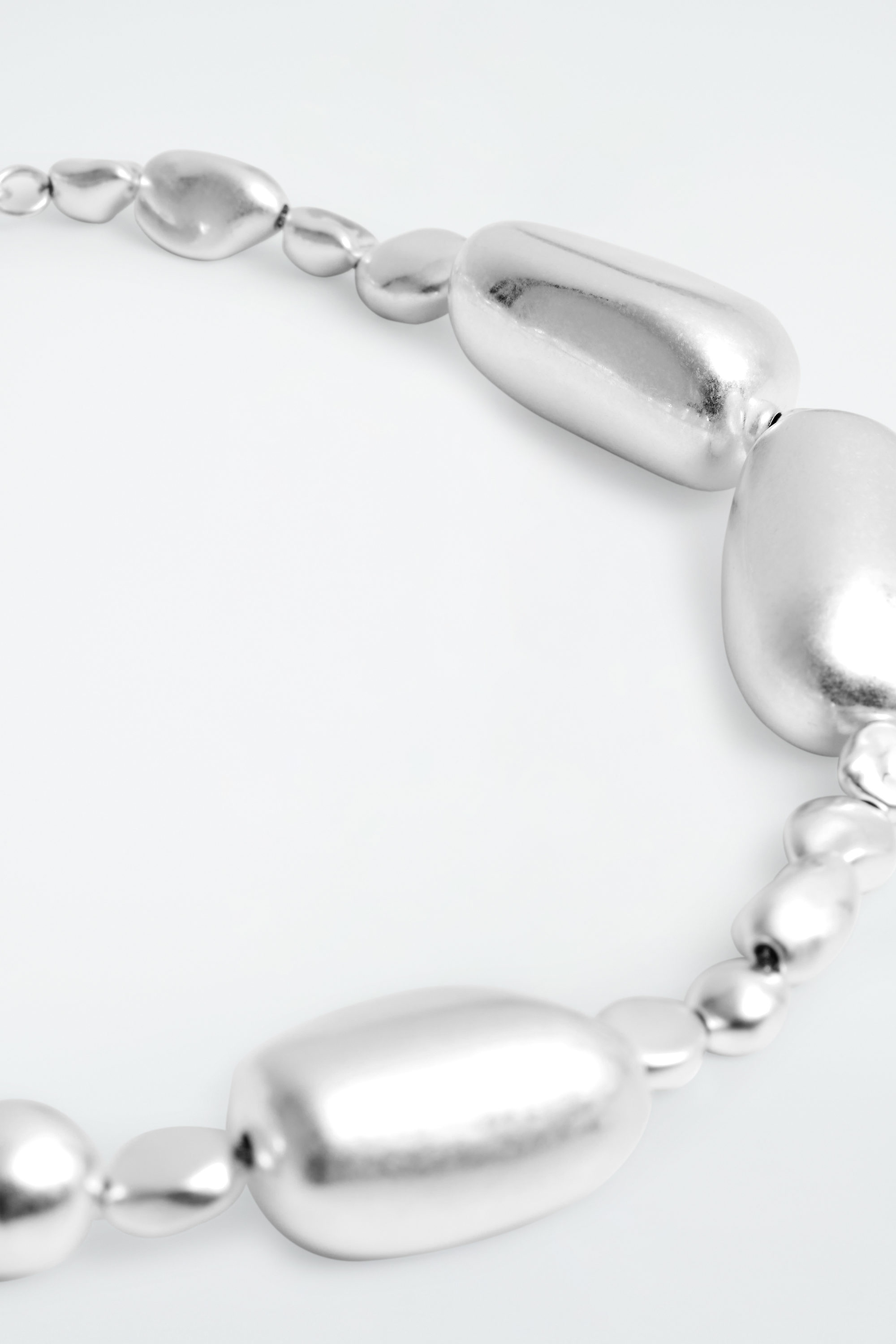 Detta pärlade halsband har en arkitektonisk design och en texturerad yta som uppnås med en hantverksmässig stämplingsteknik. Det är tillverkat av silverpläterad, återvunnen mässing och skulpterat i omatchande former för en oregelbunden look.