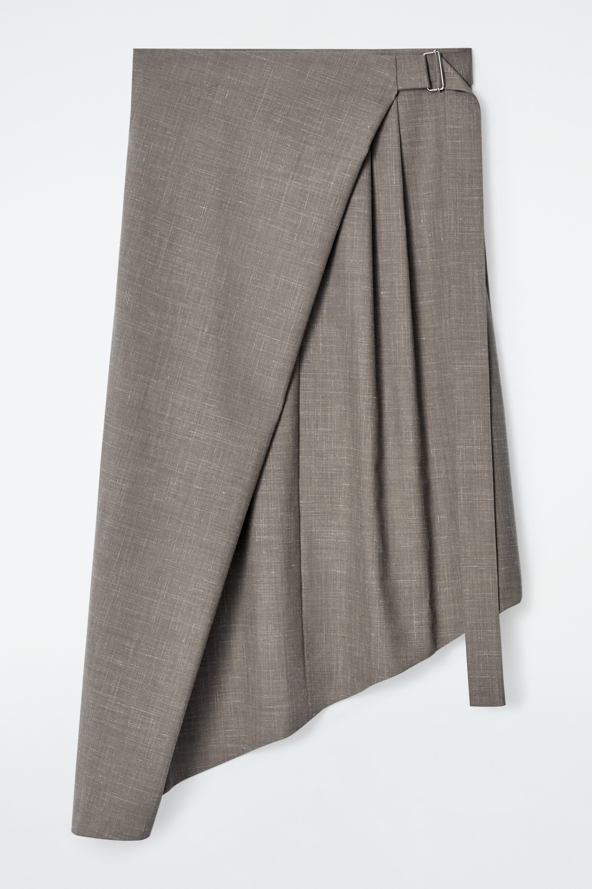 Denna midikjol moderniserar klassiska skrädderikoder med en asymmetrisk omlott-design som hålls på plats av ett bälte med D-ringar. Den är tillverkad av RWS-ull i en texturerad vävd kvalitet och har detaljer i form av prydliga veck längs ena sidan och en passpoalficka bak som en hyllning till den traditionella kostymen.