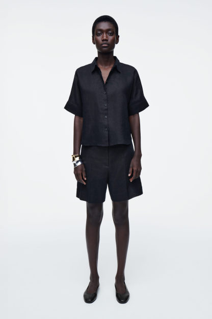 En arkitektonisk skjorta som är en avslappnad tolkning av den klassiska sommarklänningen. Den är tillverkad av marinblått, rent linne med naturligt lätthet samt har en spetsig krage och korta ärmar.