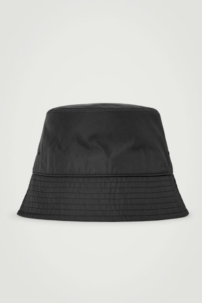 Den här fiskarhatten är en modern klassiker tillverkad av återvunnen nylon i en svart nyans. Ett brätte med detaljsömmar skyddar ansiktet från solen och ett band i bomullsjersey på insidan gör passformen bekväm.