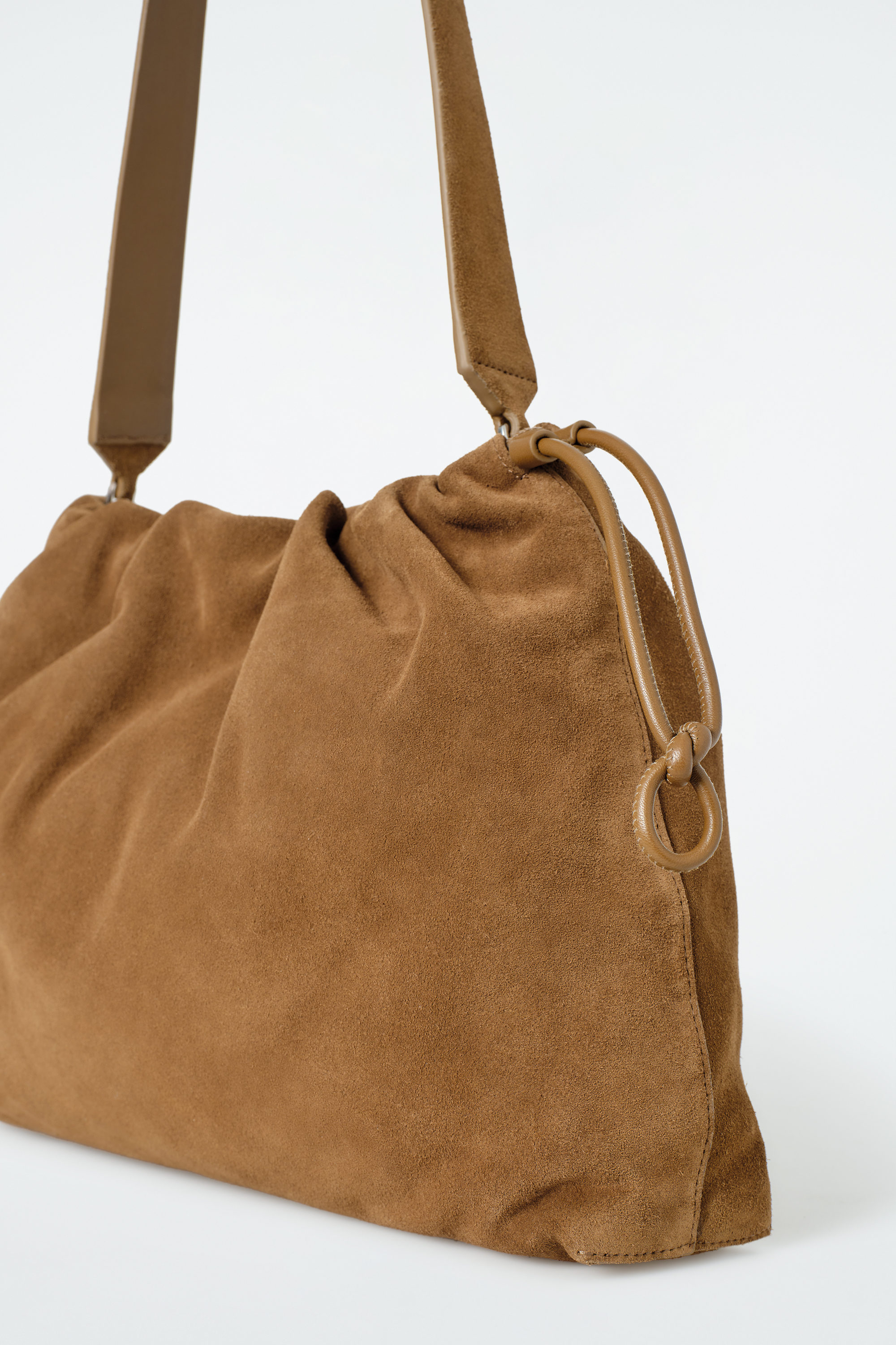 Denna moderna kuvertväska i bucket bag-stil är tillverkad av mjuk mocka och har en lågmäld karamellfärg. Designen har knutna dragskor på vardera sida som skapar en överdriven, mjukt rynkad profil samt ett smalt axelband i läder.