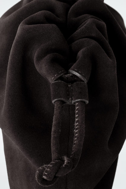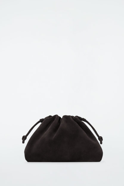 Denna minivariant av kuvertväskan Cavatelli är tillverkad av smidig mocka i en djup chokladton. Designen har knutna dragskor på vardera sida som skapar en överdriven, mjukt rynkad profil. Våra stylister rekommenderar att du stoppar den under ena armen.