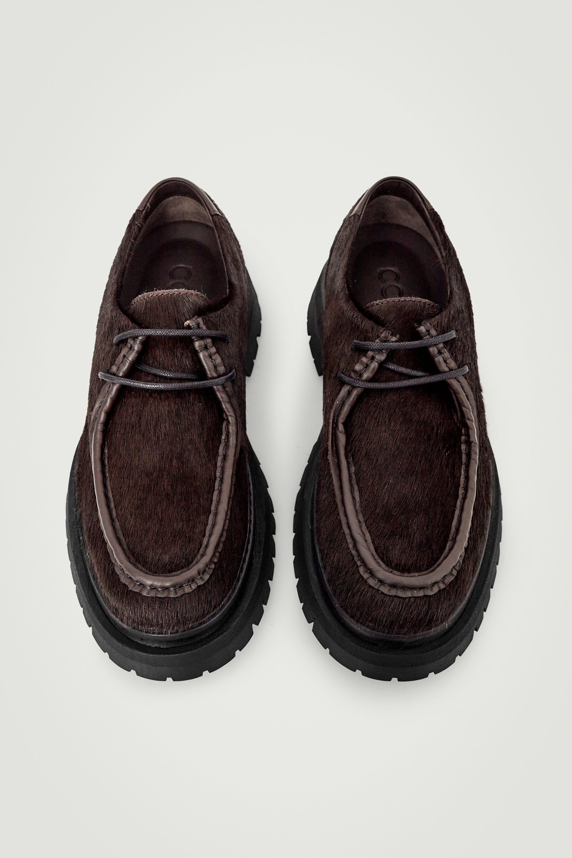 Dessa skor är tillverkade av borstat ponny-läder och har en klassiska derbyform med kraftig sula för en modern charm. De är trädda med vaxade snören i bomull och fulländade med handsydda detaljsömmar.