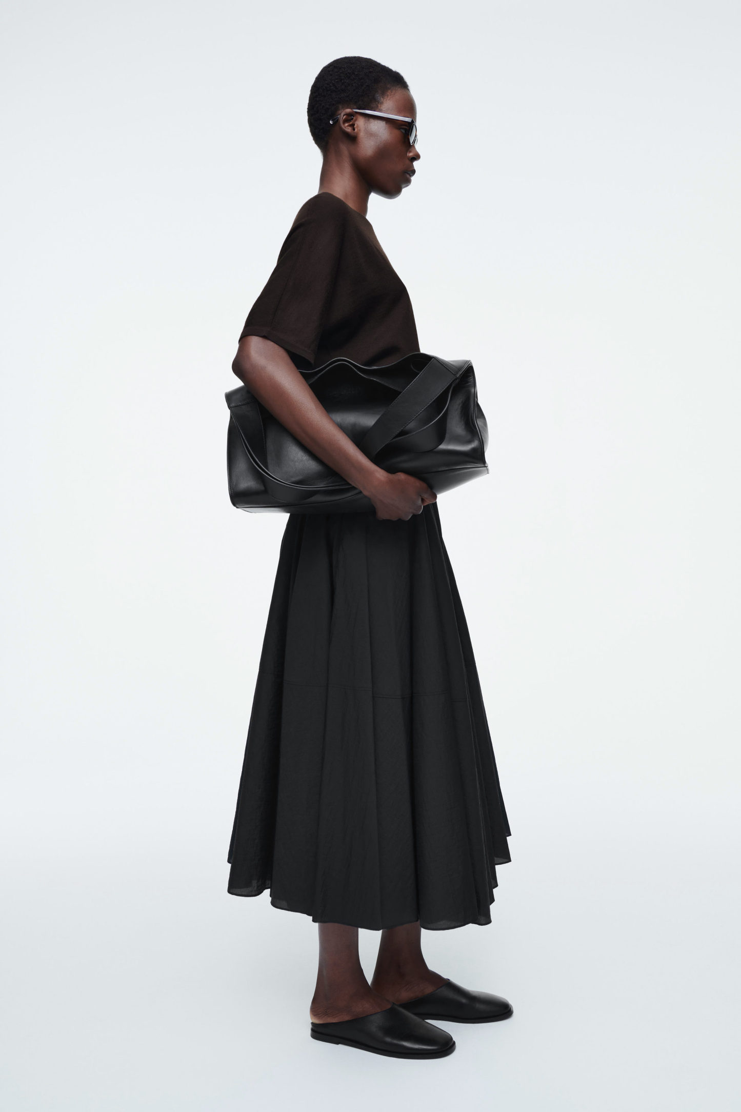 Med en känsla av modern feminitet är denna midikjol cirkelskuren för en voluminös silhuett med en mångsidig, svart nyans. Den är designad med rynkade detaljer som skapar en lekfull form och har diskreta sidfickor. Styla den med mules och en linne för en sofistikerad look.