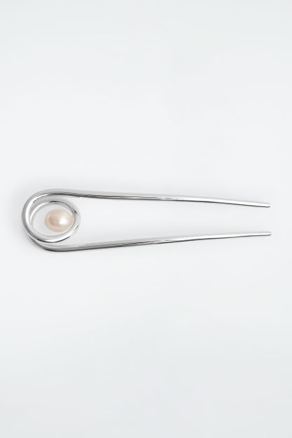 The sculpted lines and clean forms of this hair pin channel a modern elegance. It's crafted from silver-plated recycled brass that's coiled and entwined with a baroque freshwater pearl. Twist it into your hair to create an effortless updo.
