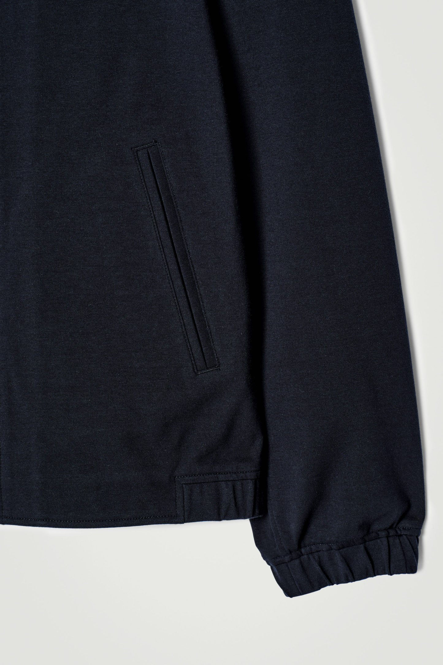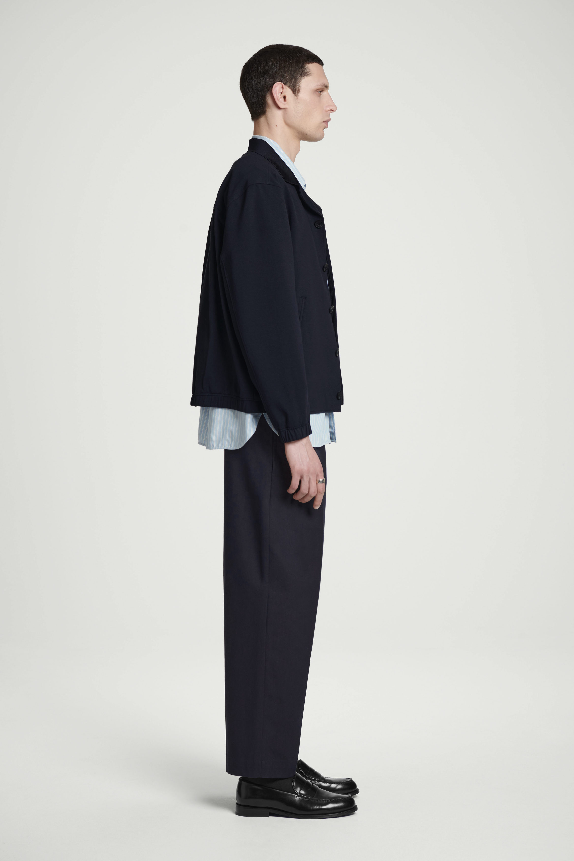 Offered in versatile navy, this jacket is crafted from interlock cotton-blend jersey for a substantial, premium hand feel. It's cut in a relaxed shape that layers well over tees and features a ribbed camp collar, welt pockets and elasticated trims at the cuffs and hem.