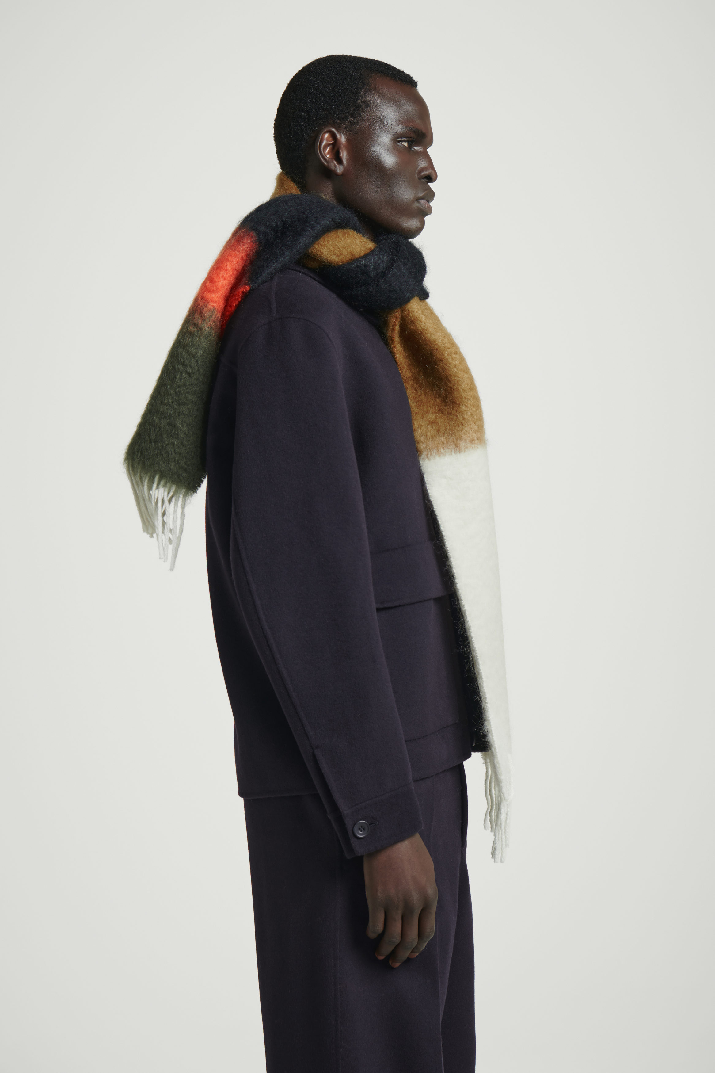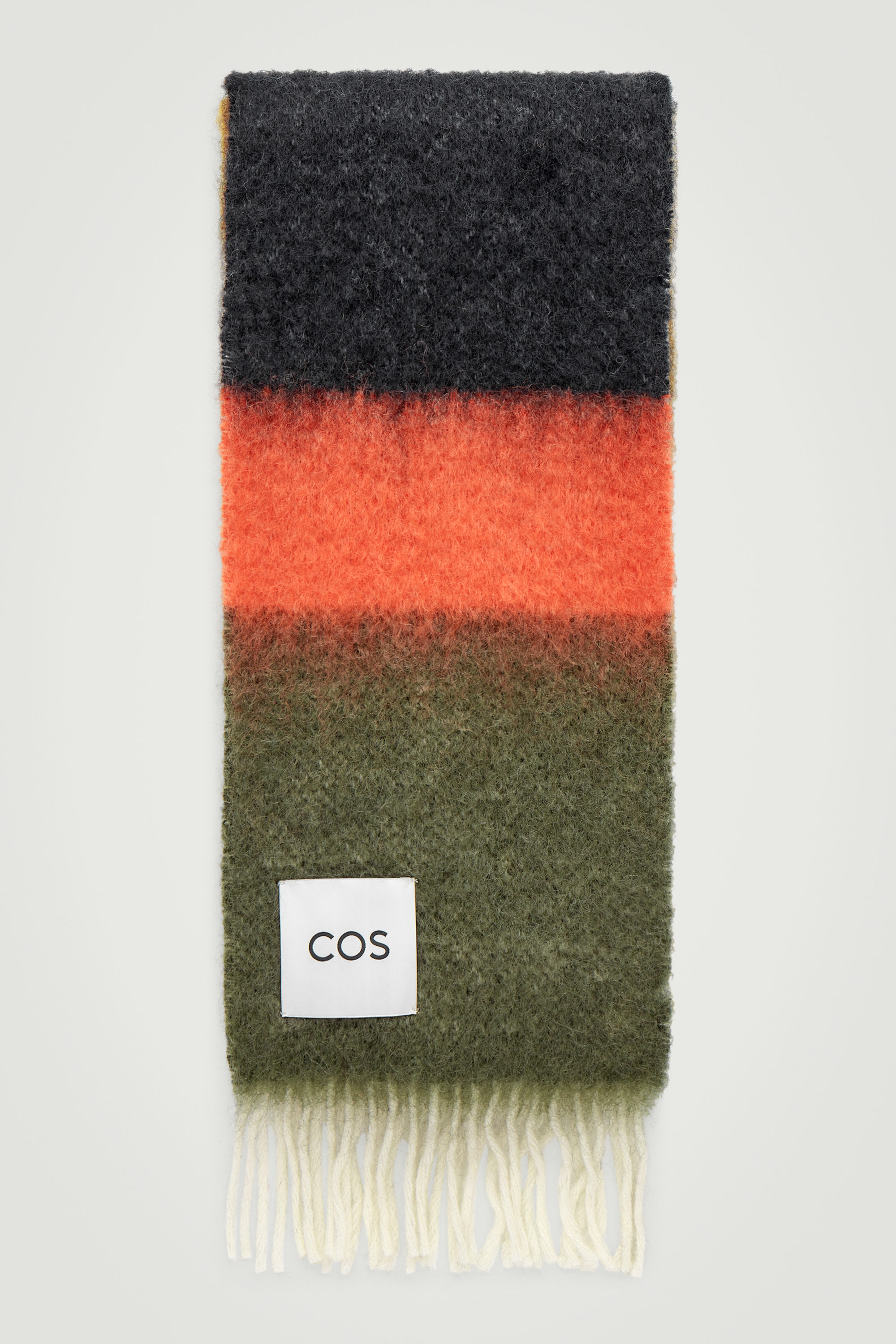 Den här extra långa halsduken är stickad i en blandning av mohair och ull med en borstad, taktil struktur. Den är dekorerad med blockränder i en jordnära palett och har fransar i vardera ände.