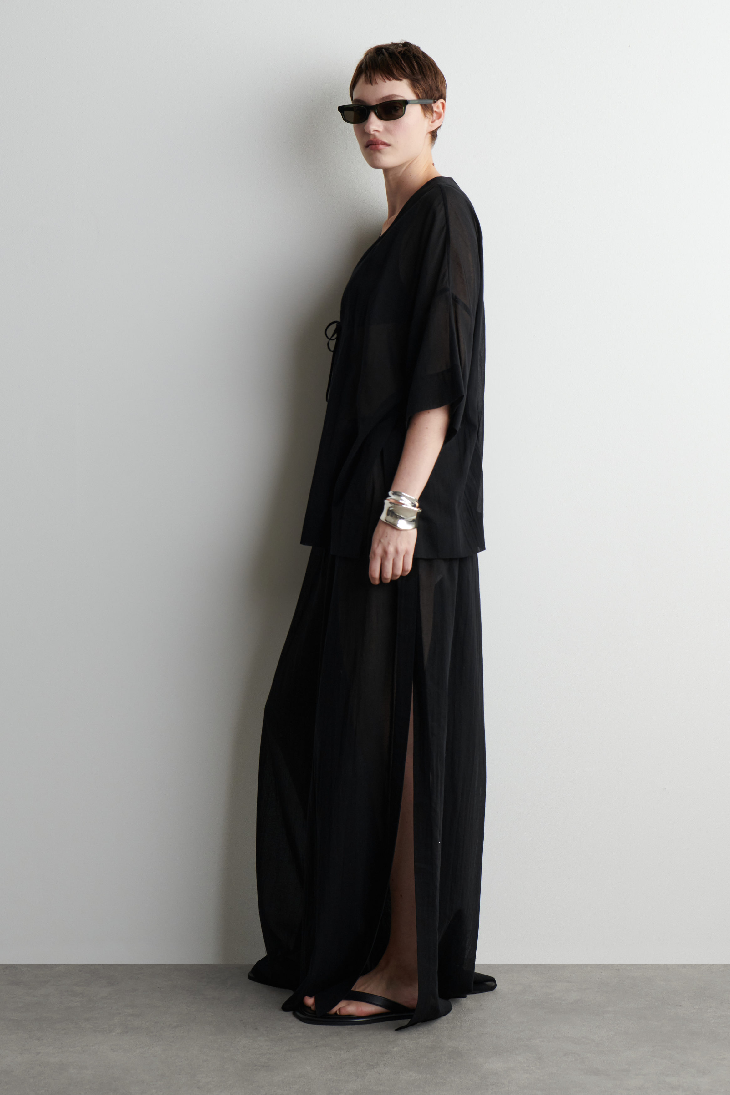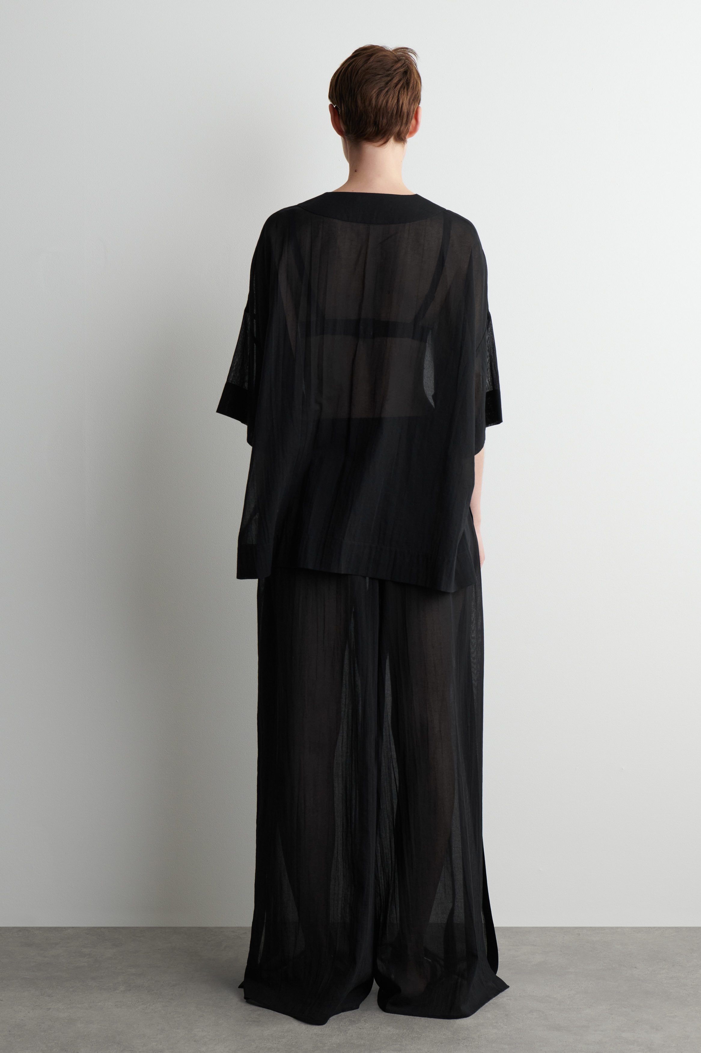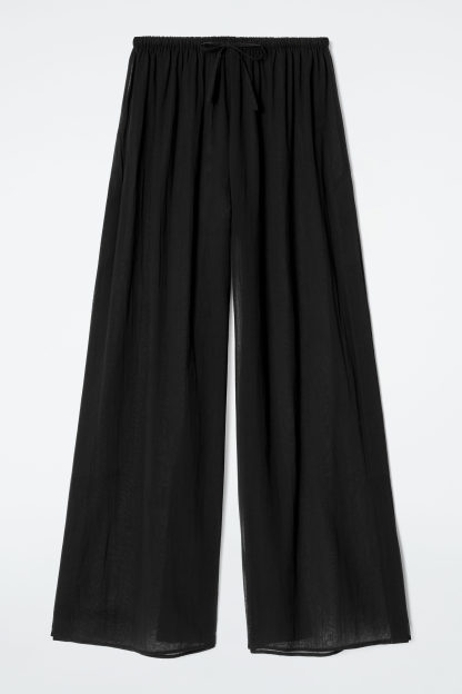 Dessa krinklade byxor är perfekta för varmare dagar vid havet. De är tillverkade av lätt, luftig bomull med en böljande silhuett, dragsko i midjan och öppna sidsömmar som gör dem lätta att styla över badkläder. Bär dem som ett set med den matchande skjortan.