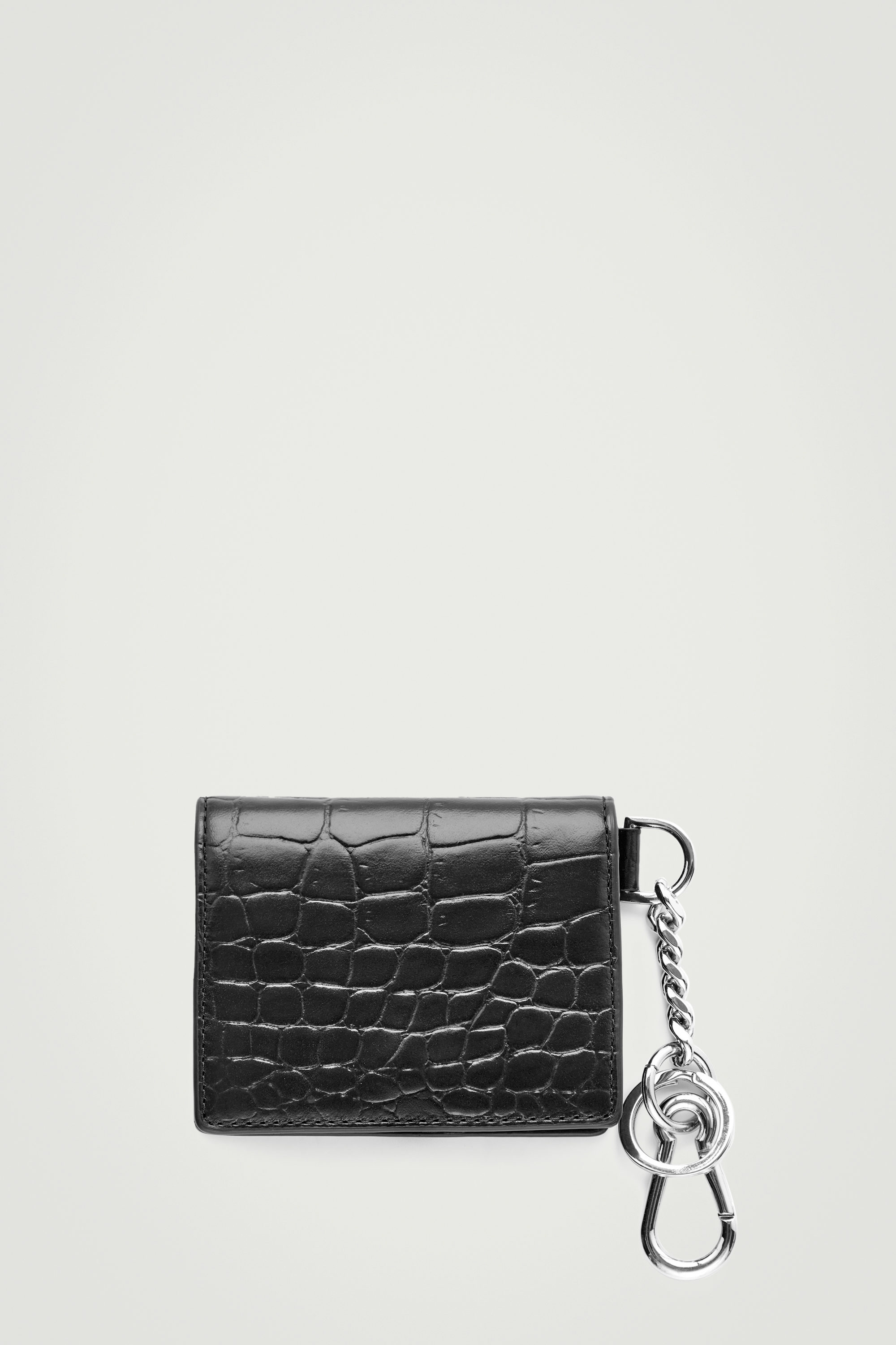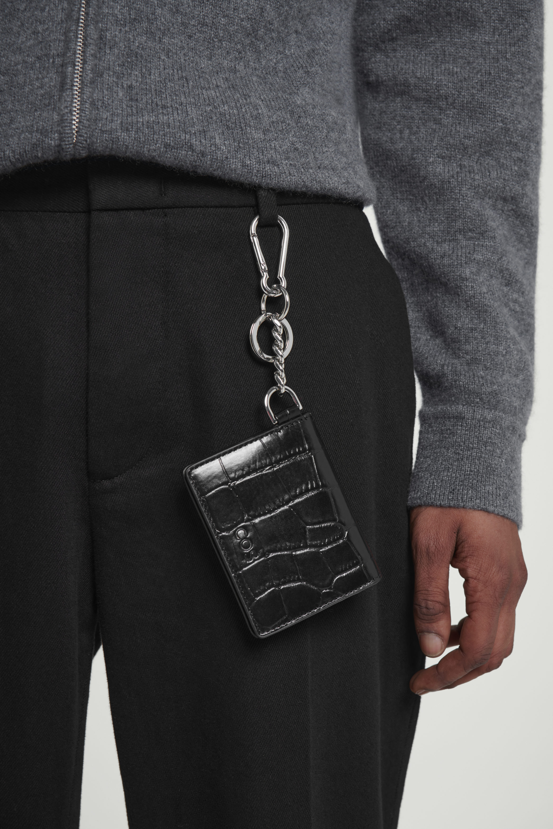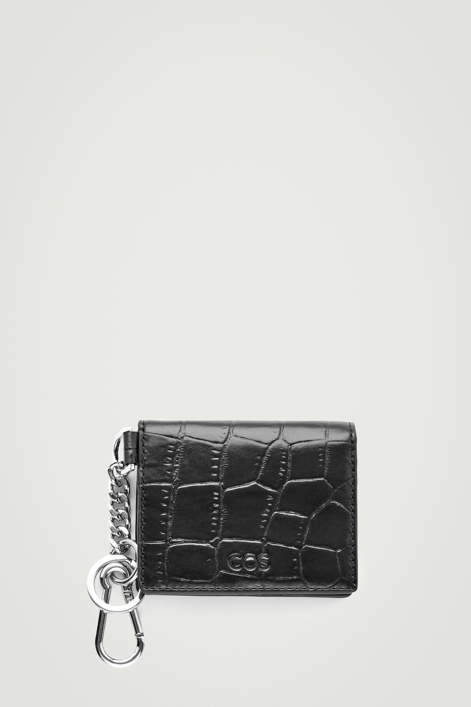 Embossed with a crocodile-effect pattern, this leather wallet features a practical key fob and opens to six secure card slots. Attach it to your bag or belt loops using the silver-tone carabiner chain.