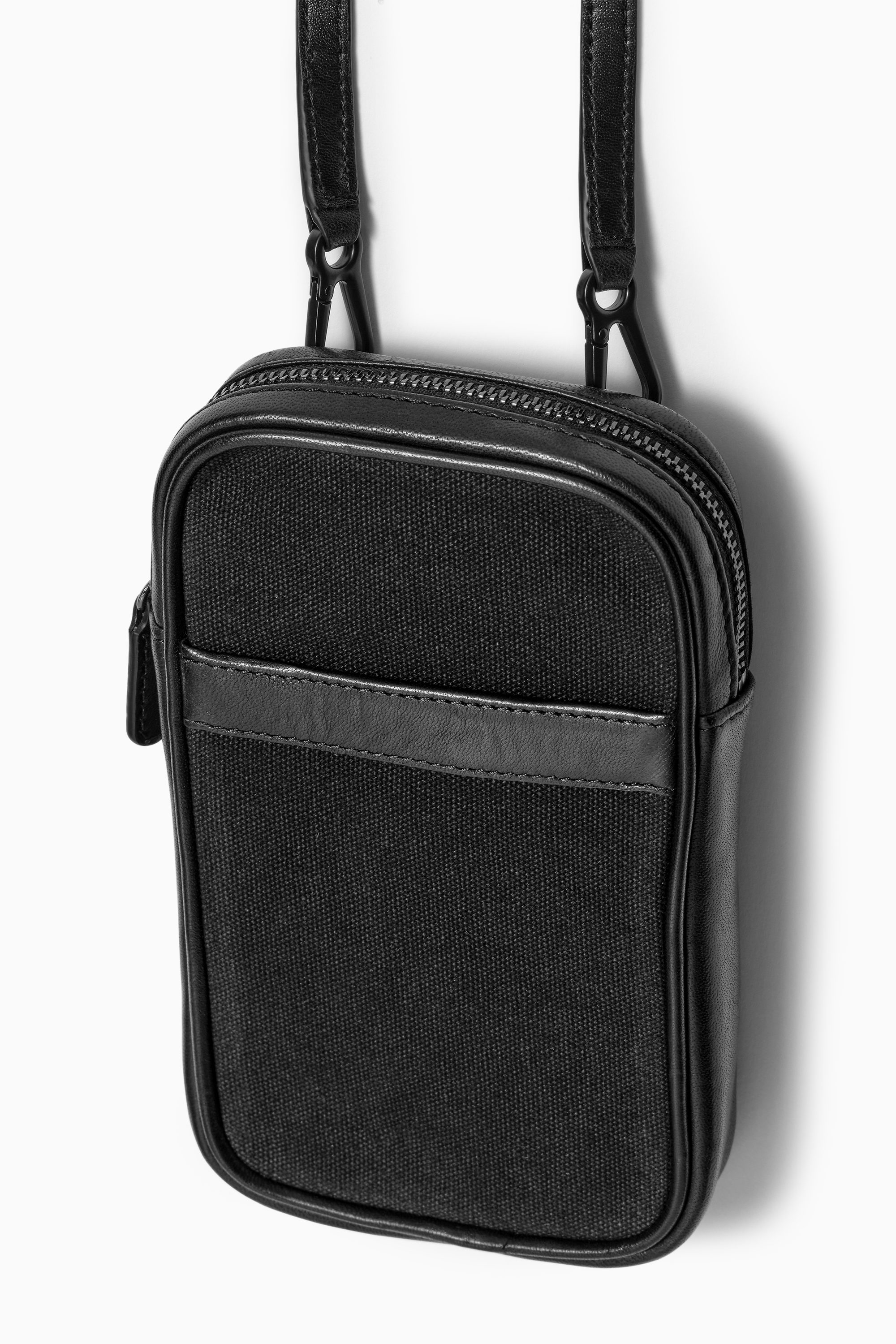 Built for modern living, this pouch is crafted from durable cotton-canvas with leather edges for a premium finish. It features an adjustable crossbody strap and a zipped compartment with enough room to hold your phone, keys and cards.