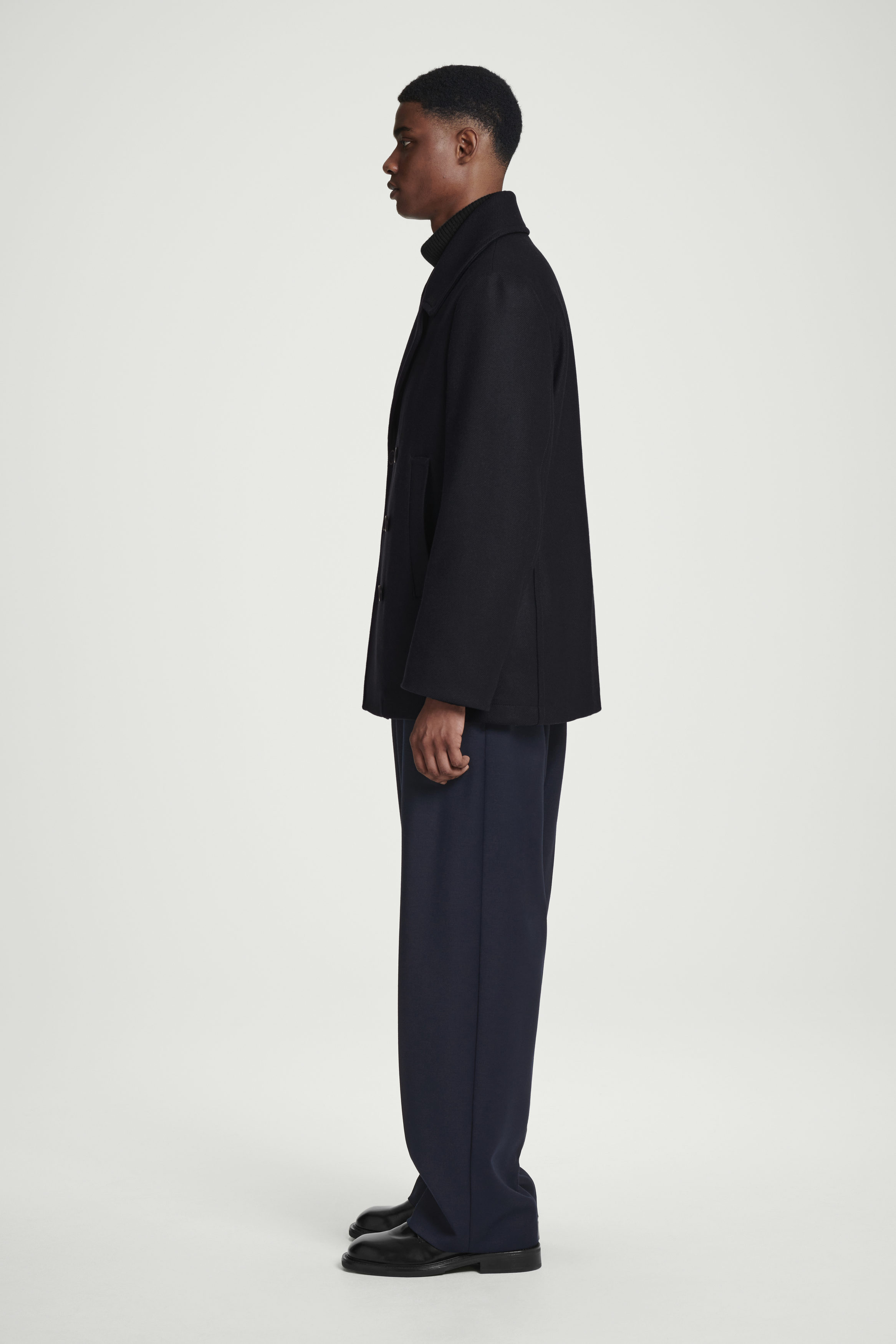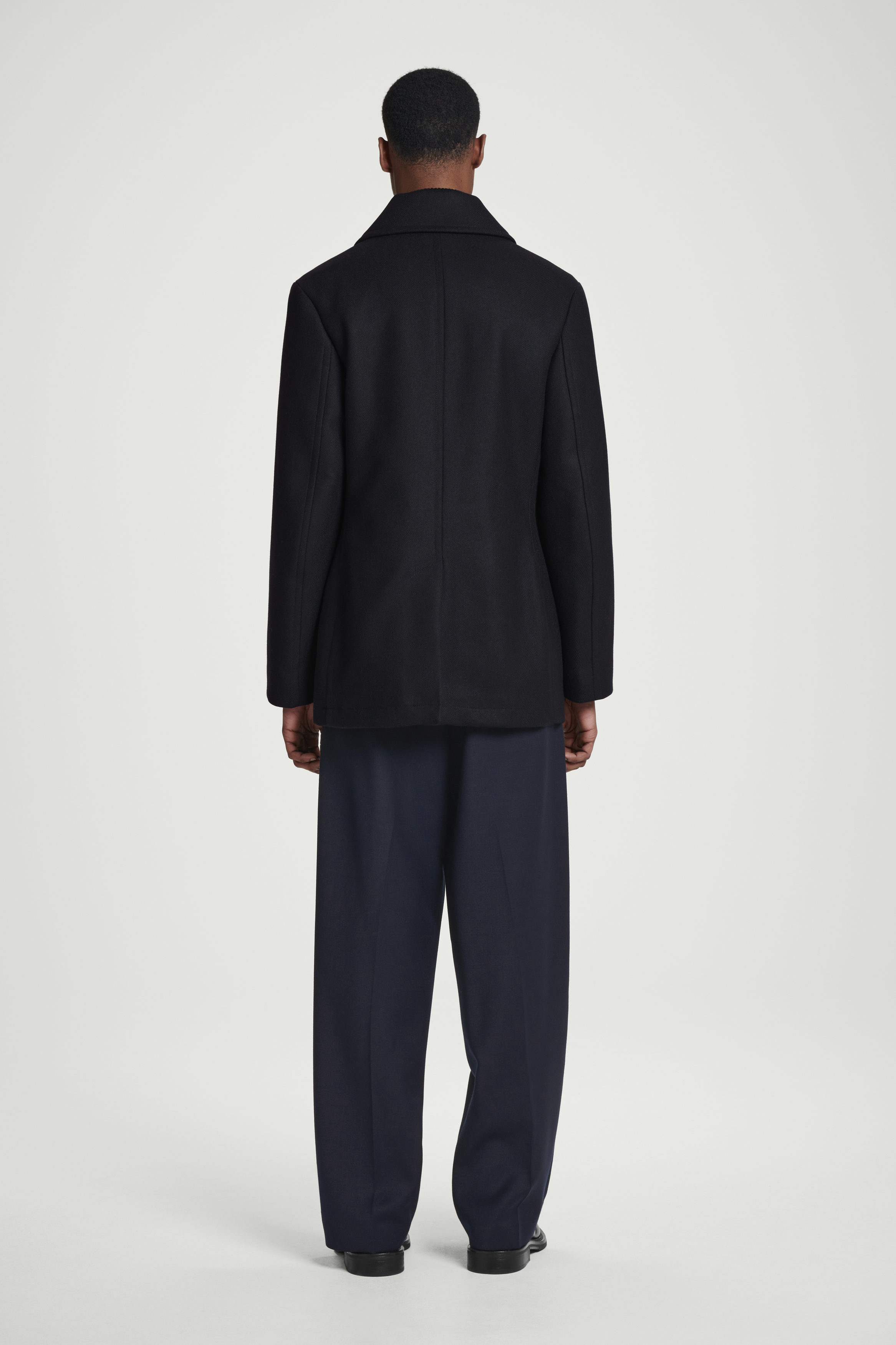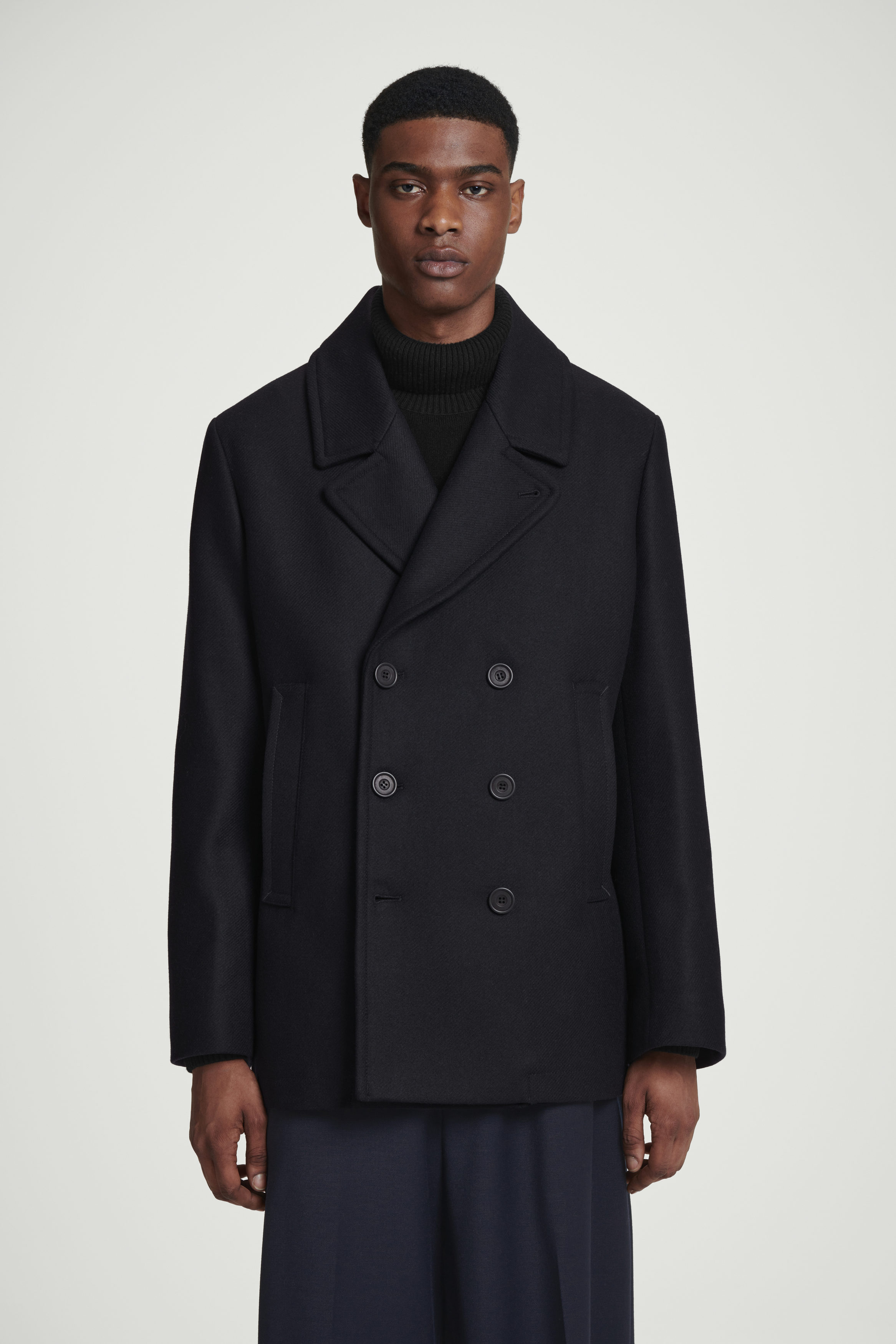 The classic pea coat is a foundation of the menswear wardrobe. Crafted from a recycled-wool blend, this double-breasted piece features a pointed collar that can be styled folded up and a quilted lining that offers additional warmth. The relaxed shape allows tailoring to fit neatly underneath.