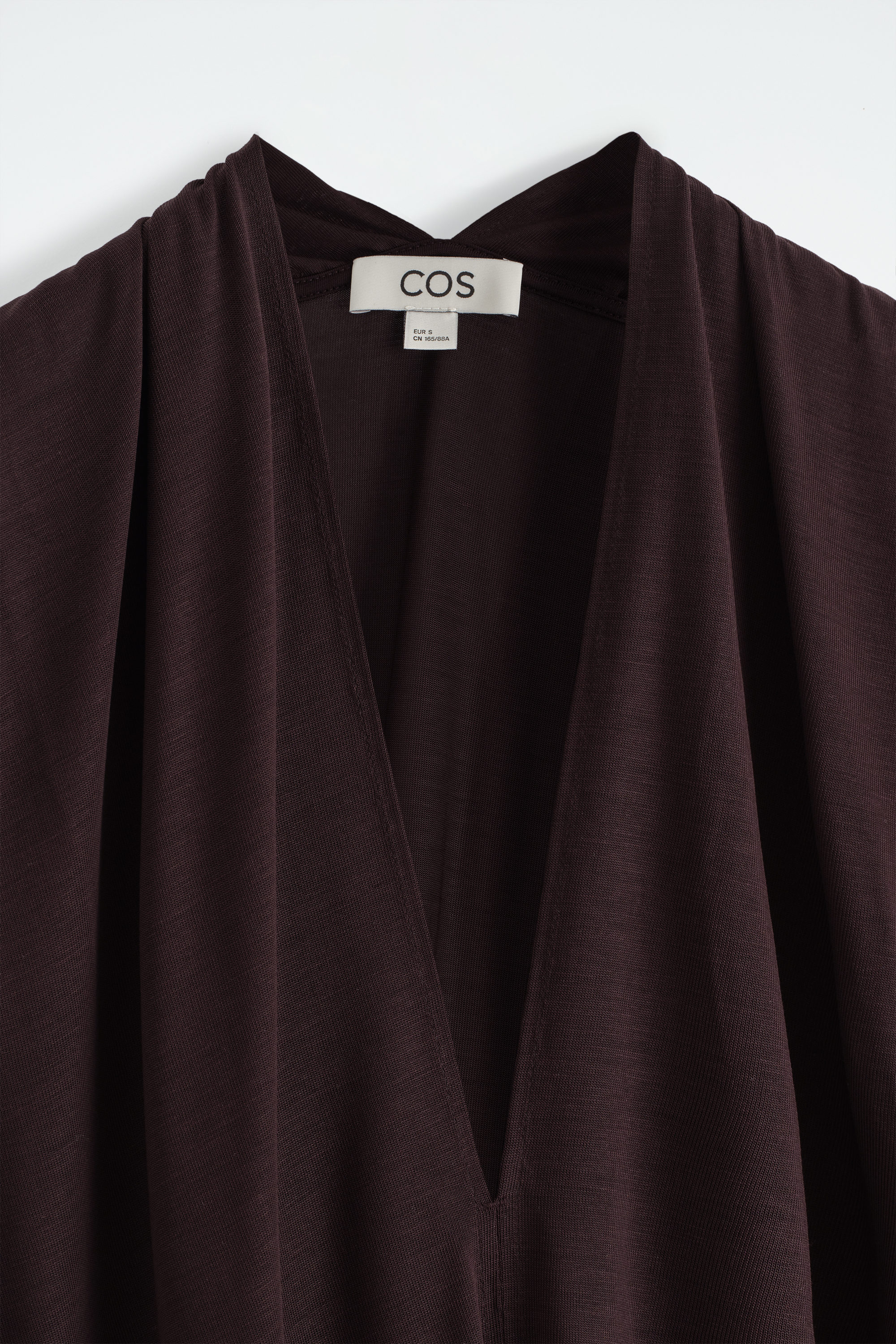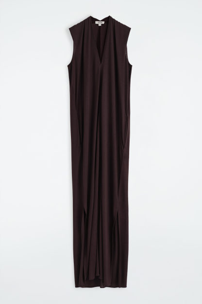 This refined dress presents a modern view of occasionwear codes. Offered in a rich espresso tone, it's crafted from fluid TENCEL™ Lyocell and designed with draping that wraps around the shoulders and V-neckline. Style it with sandals and a clutch for evening soirées.
