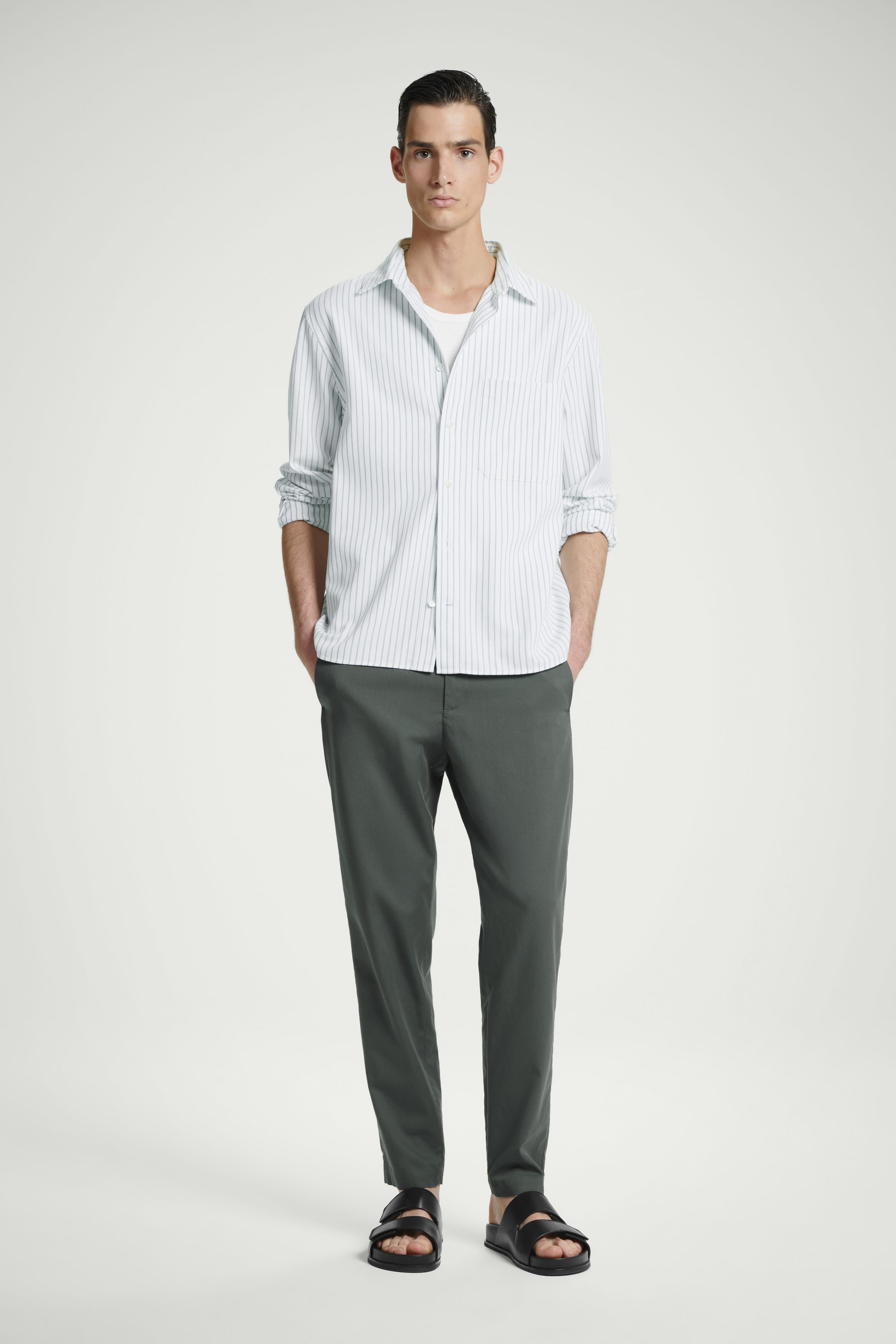 De här byxorna i svart är skräddade för en något avsmalnande silhuett i TENCEL™ lyocell och en bomullsblandad twill som garanterat håller formen. De har en midja med stretch för en smidig passform och fickor både fram och bak.