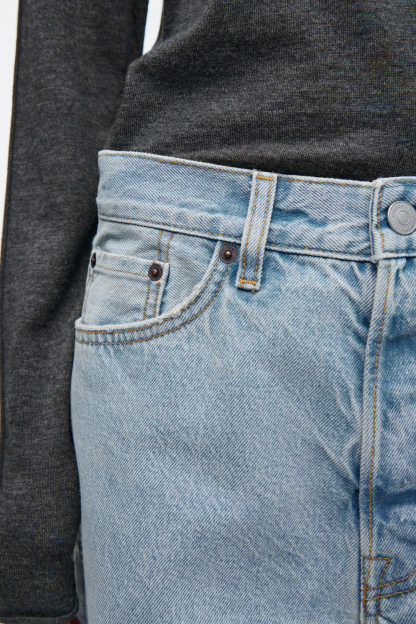 Med rötter i 2000-talet har jeansen Facade den nostalgiskt låga midja som är synonym med årtiondet. De är tillverkade av en denimblandning med ekologisk och återvunnen bomull. De raka benen har välvda sömmar för en dekonstruerad effekt, medan slitningarna ger plagget karaktär.