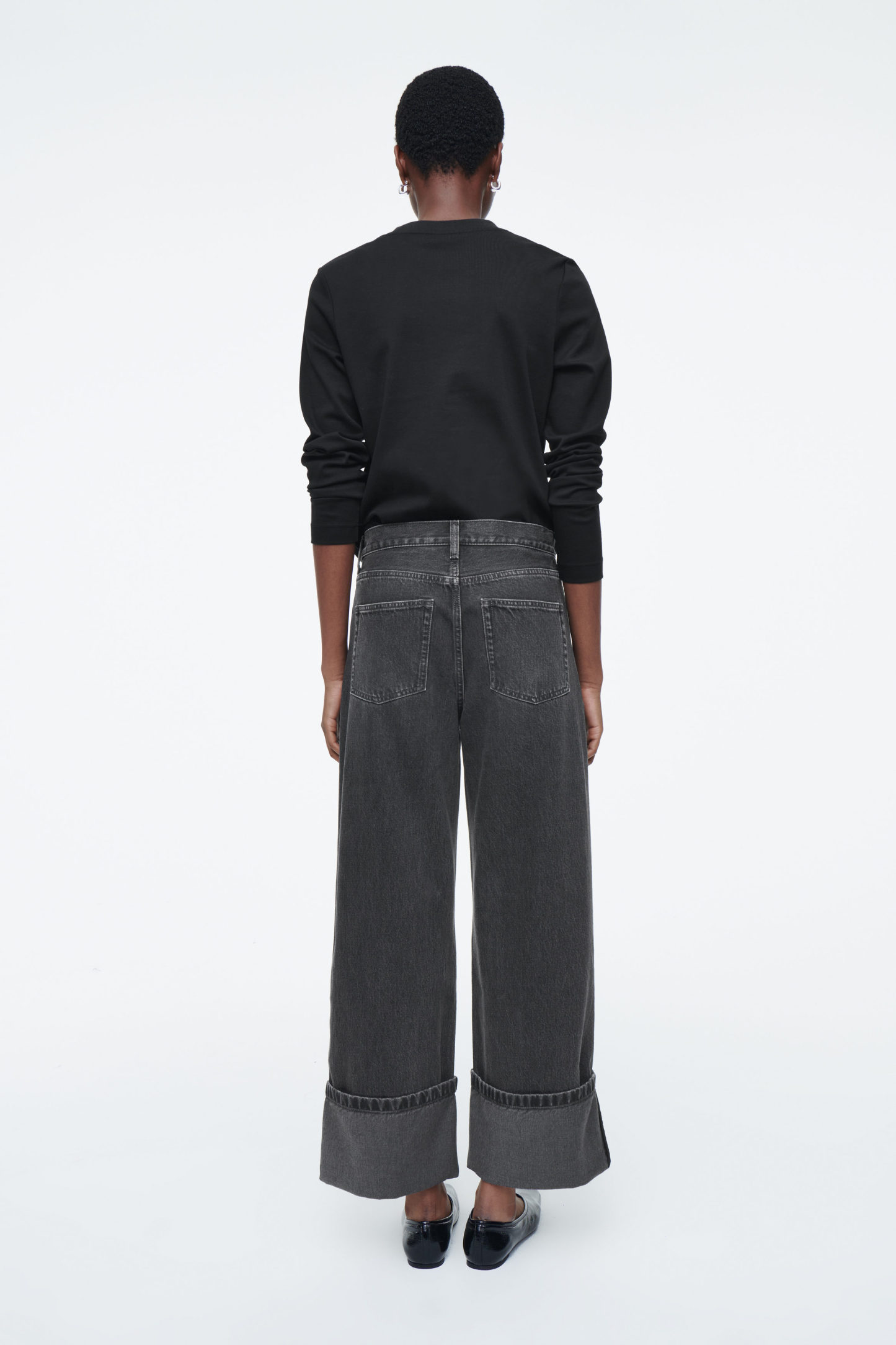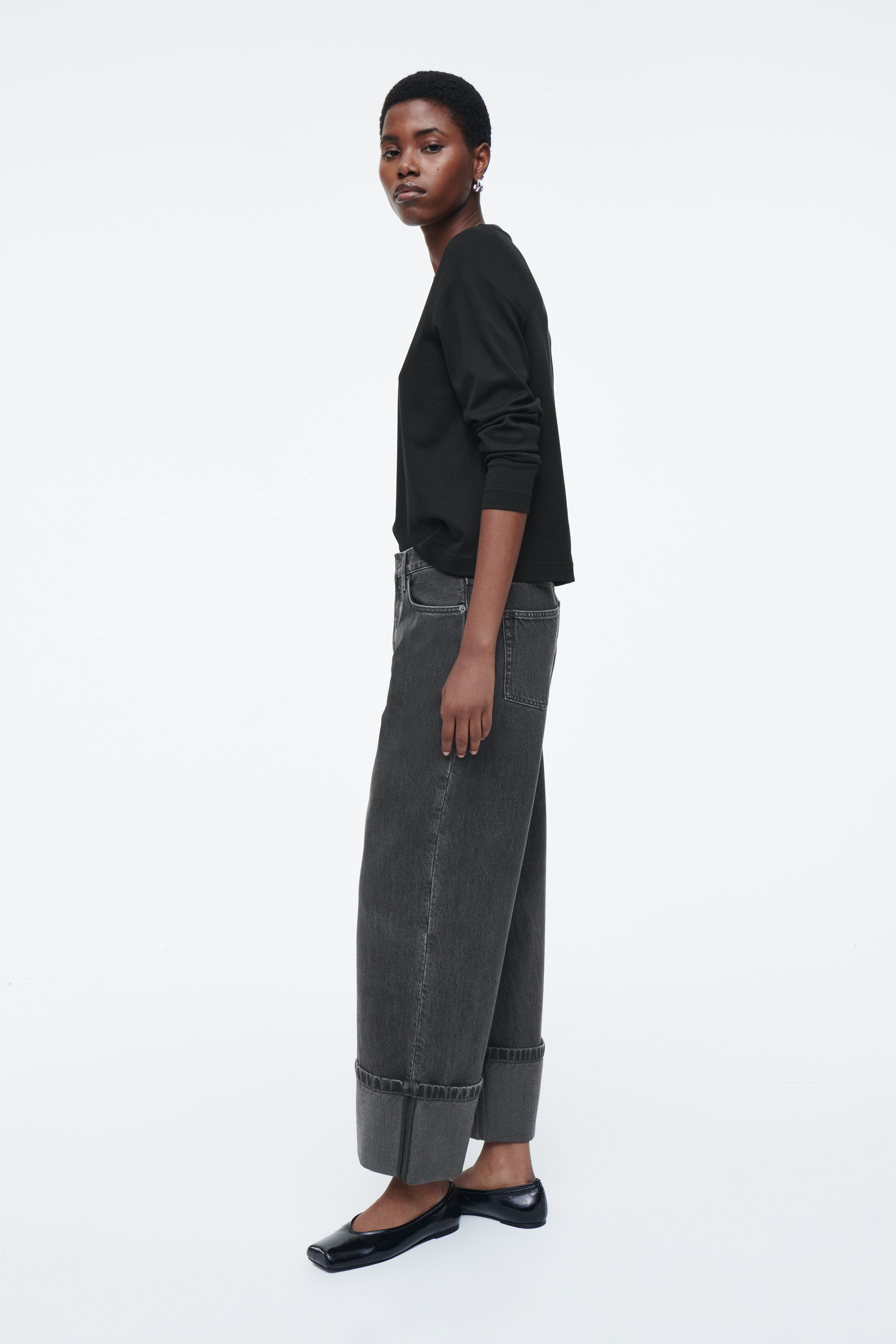 Med rötterna i 00-talsnostalgi har jeansen Facade samma låga midja som är synonym med årtiondet. De är gjorda av en denimblandning med ekologisk och återvunnen bomull i en svart tvätt som passar till det mesta i garderoben. De raka benen har uppvikta benslut som slutar vid ankeln, medan de ljusa slitningarna ger plagget karaktär.