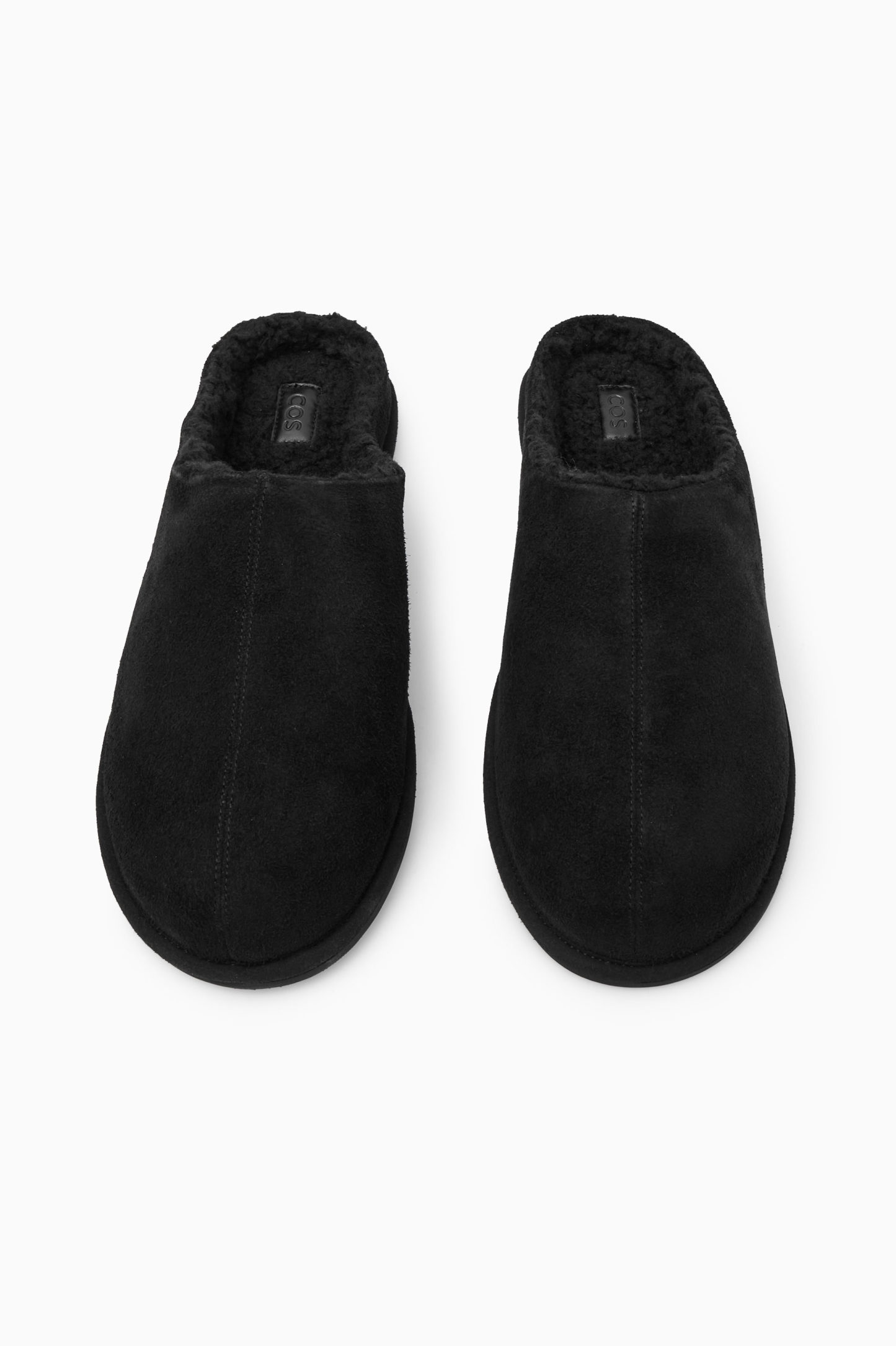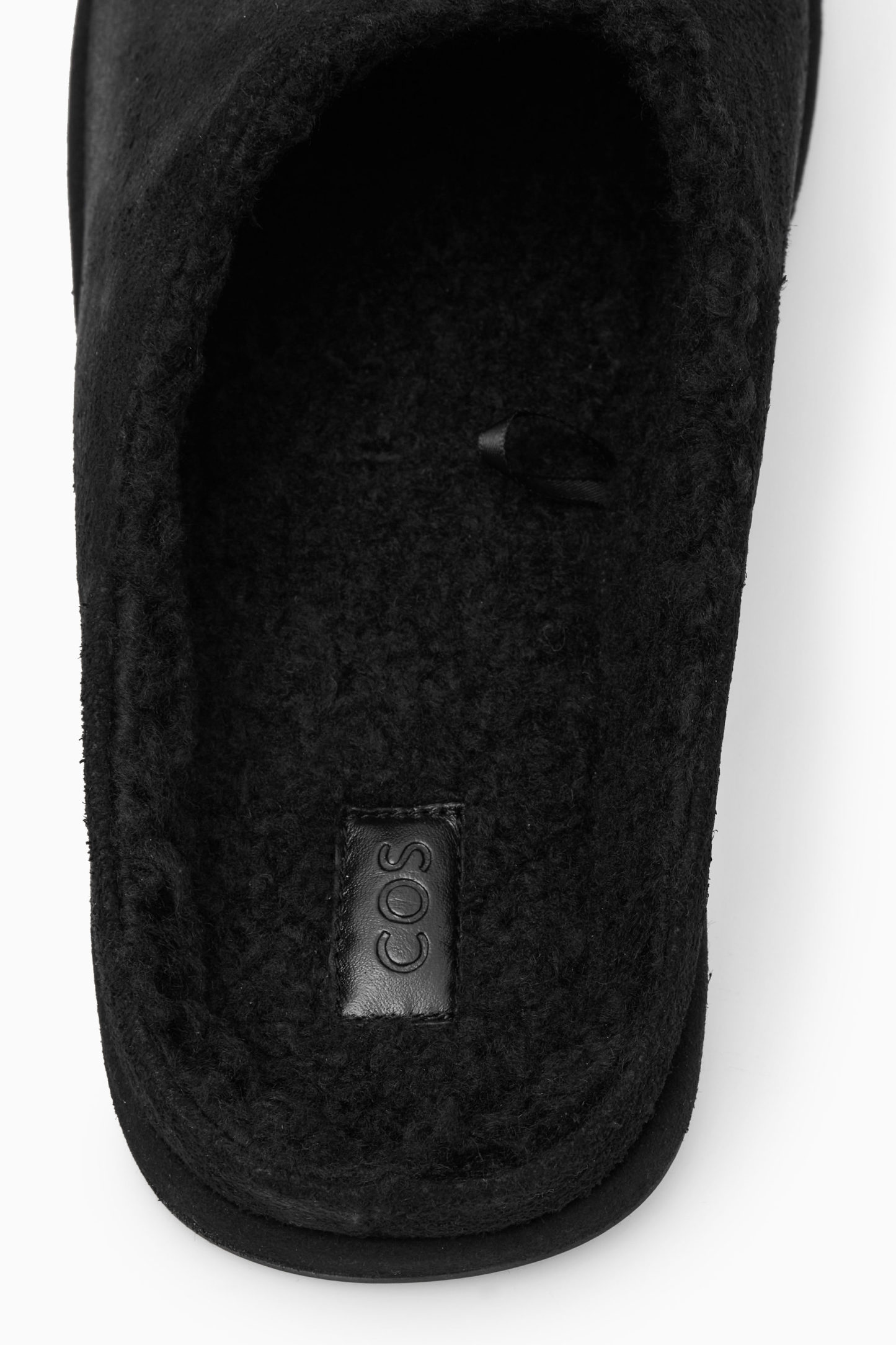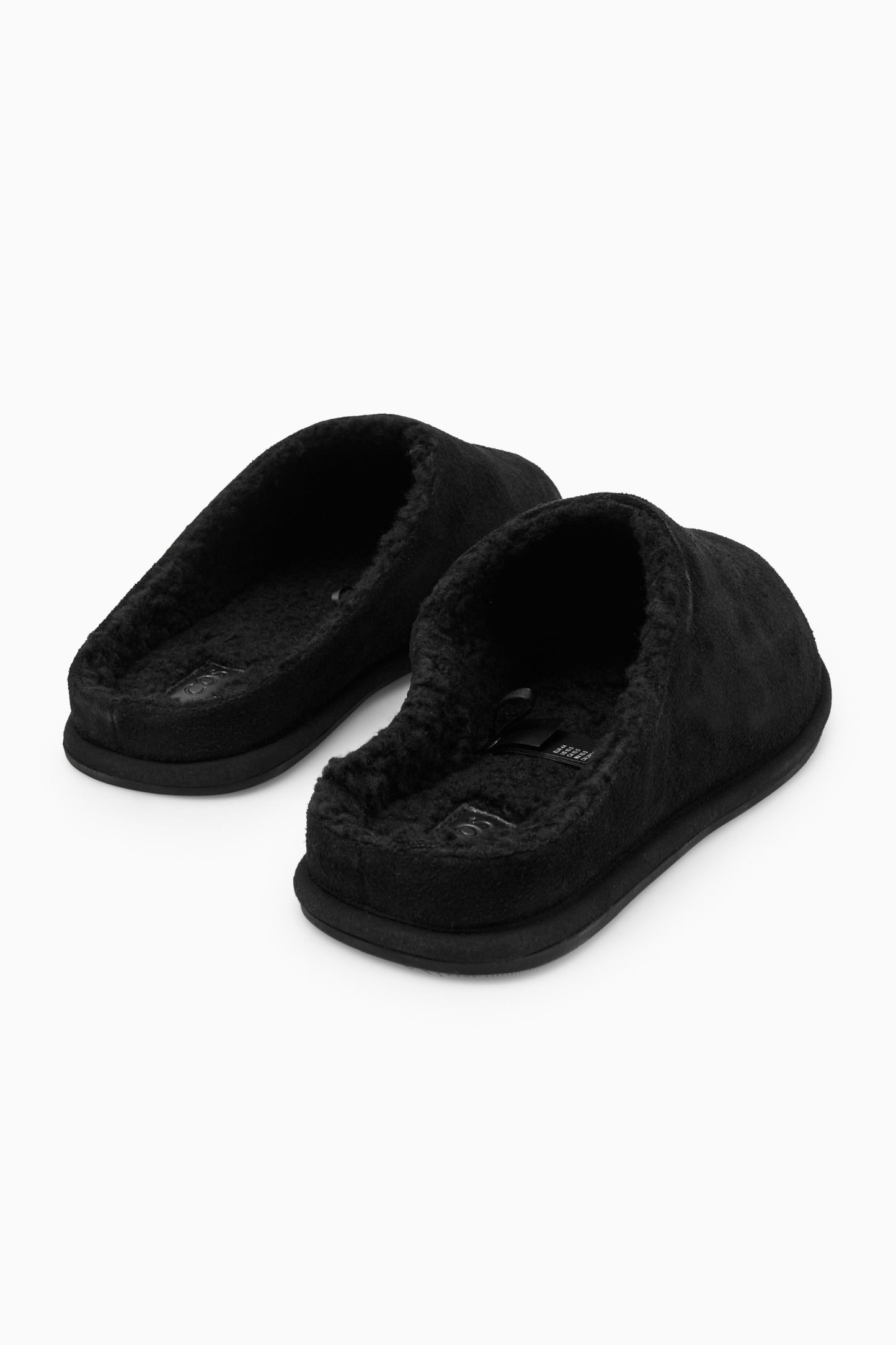 cthtos loungekläder är framtagna med precis lika mycket omsorg som vår ready-to-wear-kollektion. De här svarta tofflorna i mule-modell är klassiska och bekväma med mjuk mocka och ett fantastiskt mjukt fleecefoder som håller fötterna varma under frostiga vintermorgnar.