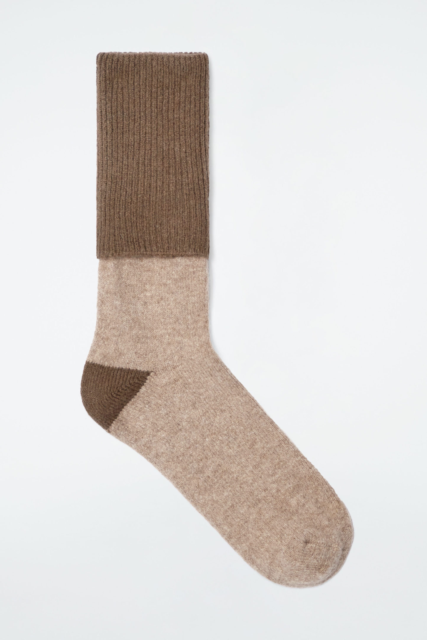 Dessa strumpor i en brun nyans är stickade av en blandning med RWS-ull och återvunnen kashmir för en extra mjuk känsla. Strumporna är förstärkta med inslag av nylon för slittålighet, har en ribbad ovandel som dubbelvikts för en lagereffekt.