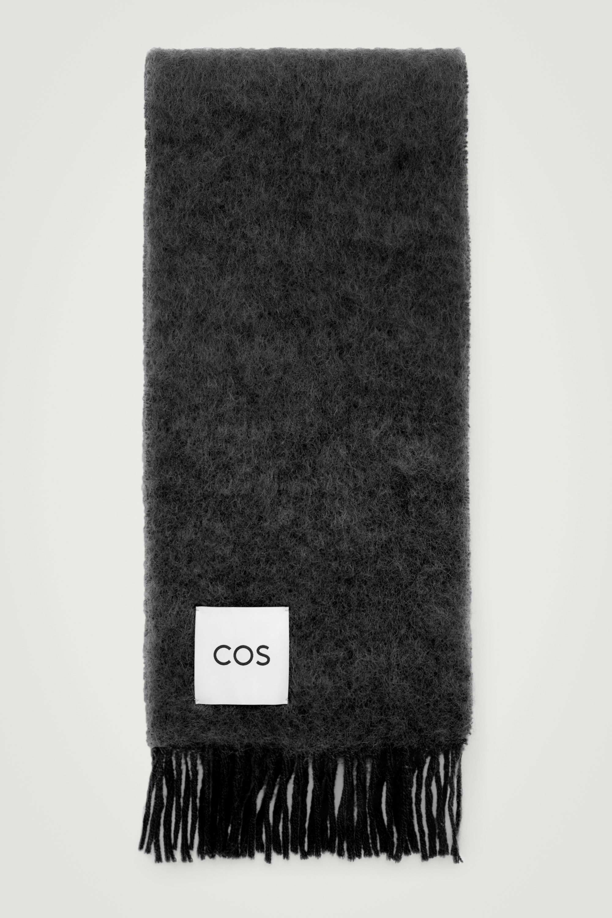 Denna halsduk är designad för de kallaste dagarna. Den är stickad i en mohair- och ullblandning med lätt borstad textur, fransade ändar och en cthtos-logotyp.