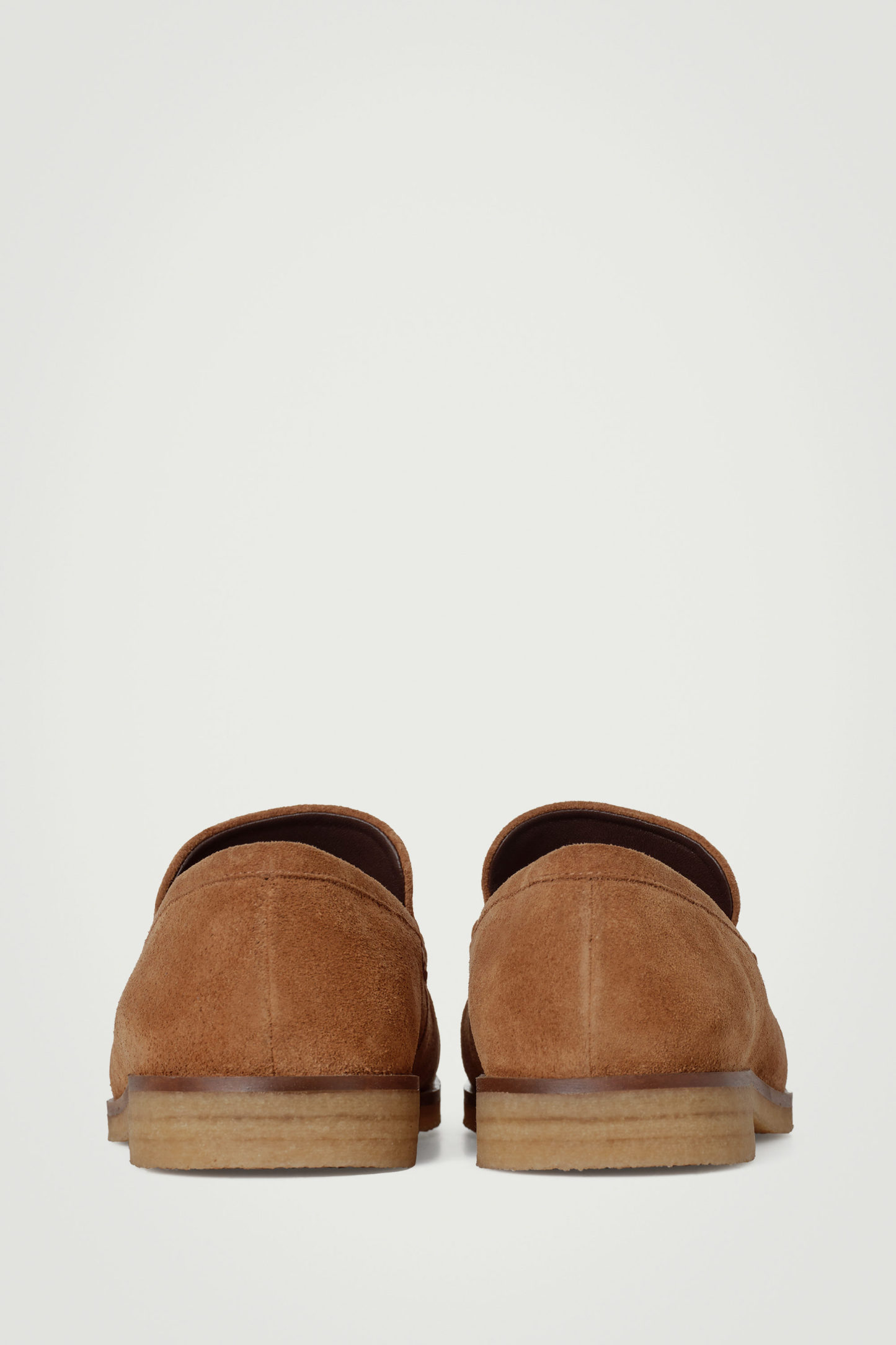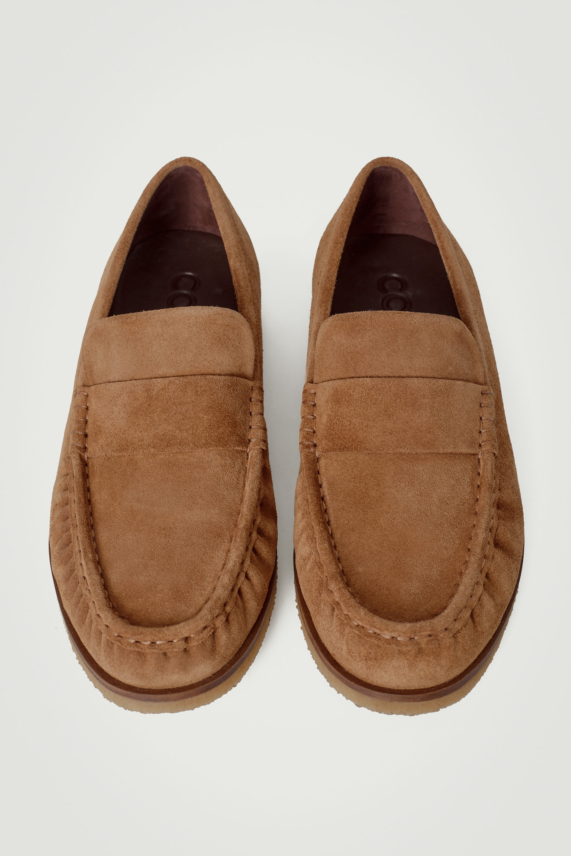 En sofistikerad variant av klassiska loafers. Dessa moderna skor är diskreta men eleganta och tillverkade av följsam mocka i en djup, ljusbrun nyans med mockasinliknande sömmar och gummisula.