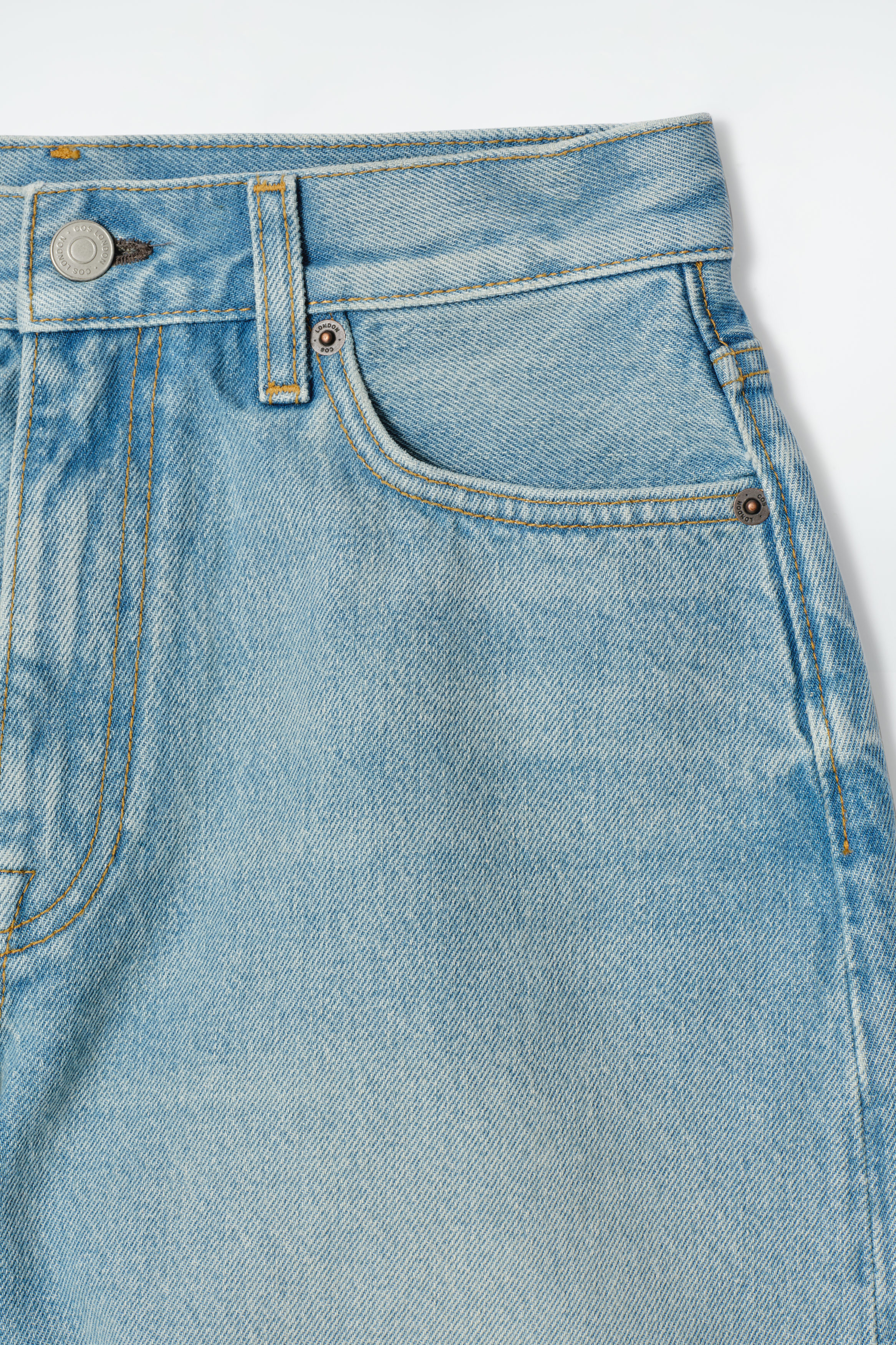 Few pieces signal summer quite like a pair of denim shorts. Offered in a washed-blue hue, this style is crafted from an organic- and recycled-cotton blend and shaped with a high-rise waist, an angled yoke and a slight flare to the leg. They're stamped with cthtos-embossed rivets.