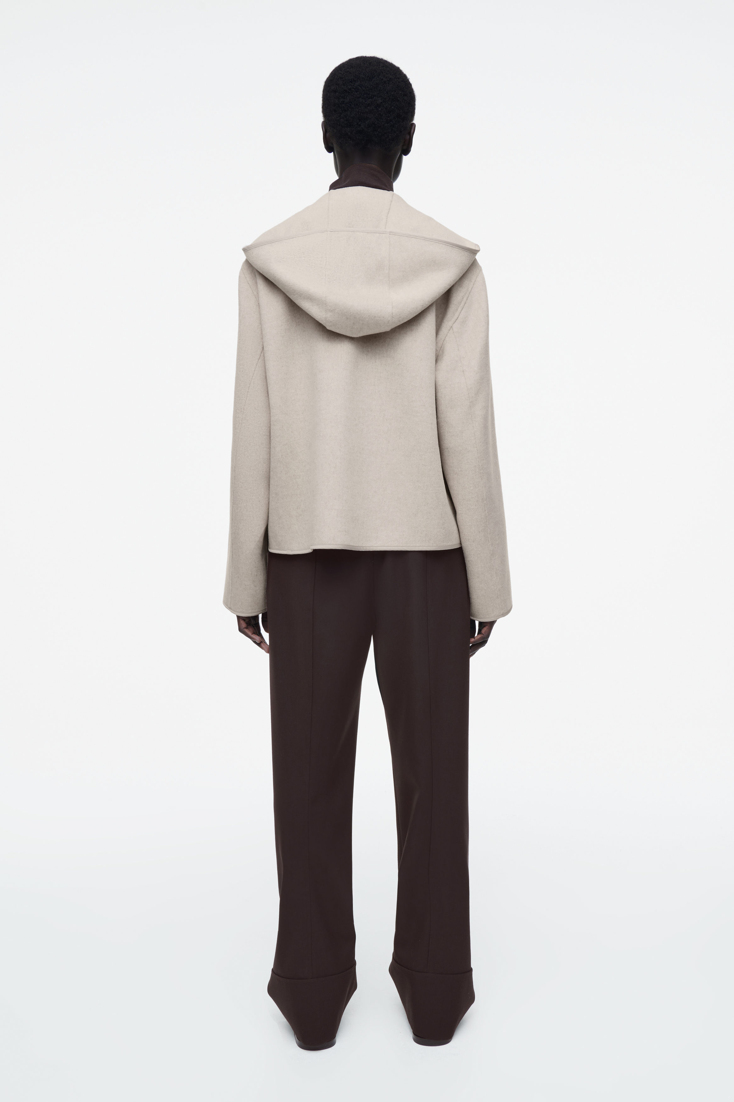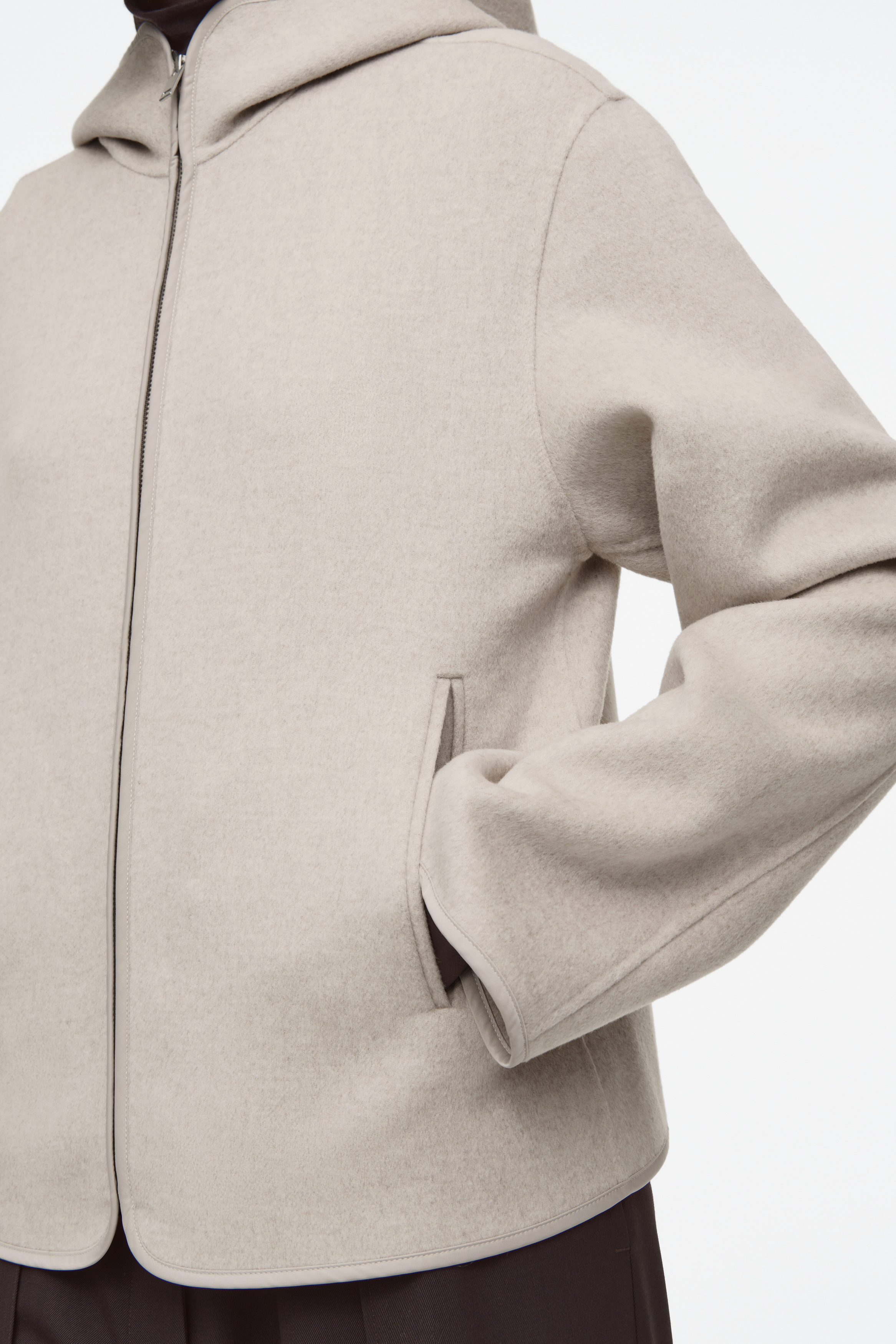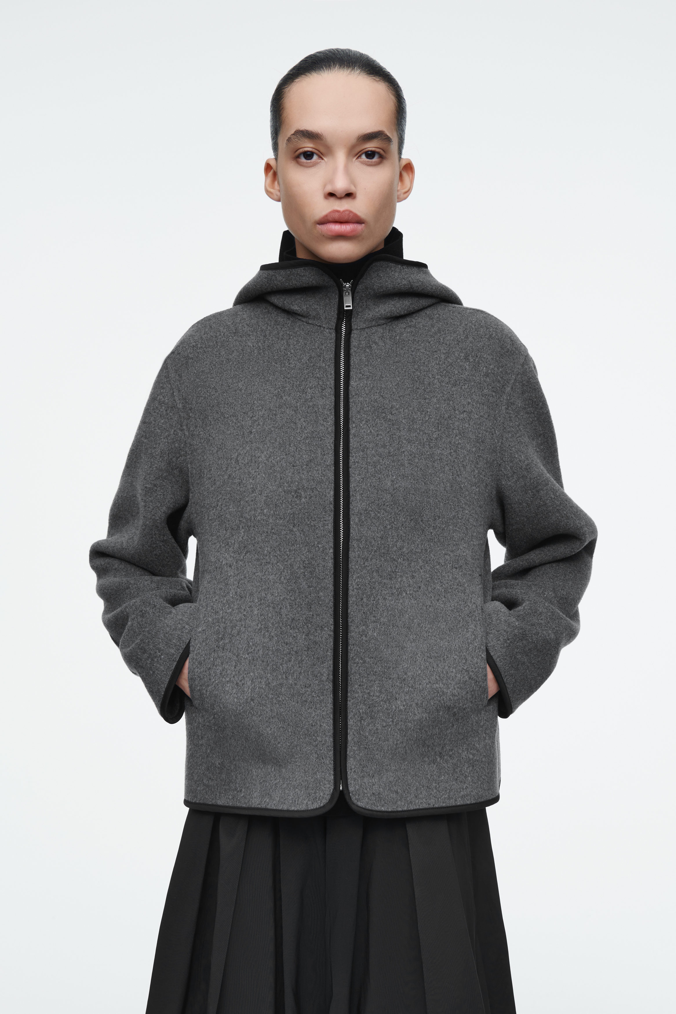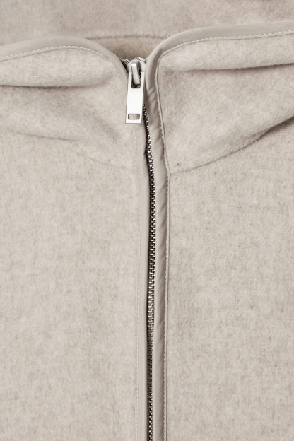En jacka som är perfekt för övergångsmånaderna. Den är tillverkad av ull och TENCEL™ lyocell som är dubbelsidig för en premium finish. Designen erbjuds i en dämpad, grå ton och har huva, dragkedja och muddar – var och en med kantband i nylon för en diskret kontrast. Stoppa in händerna i passpoalfickorna under de kallare månaderna för att hålla värmen.