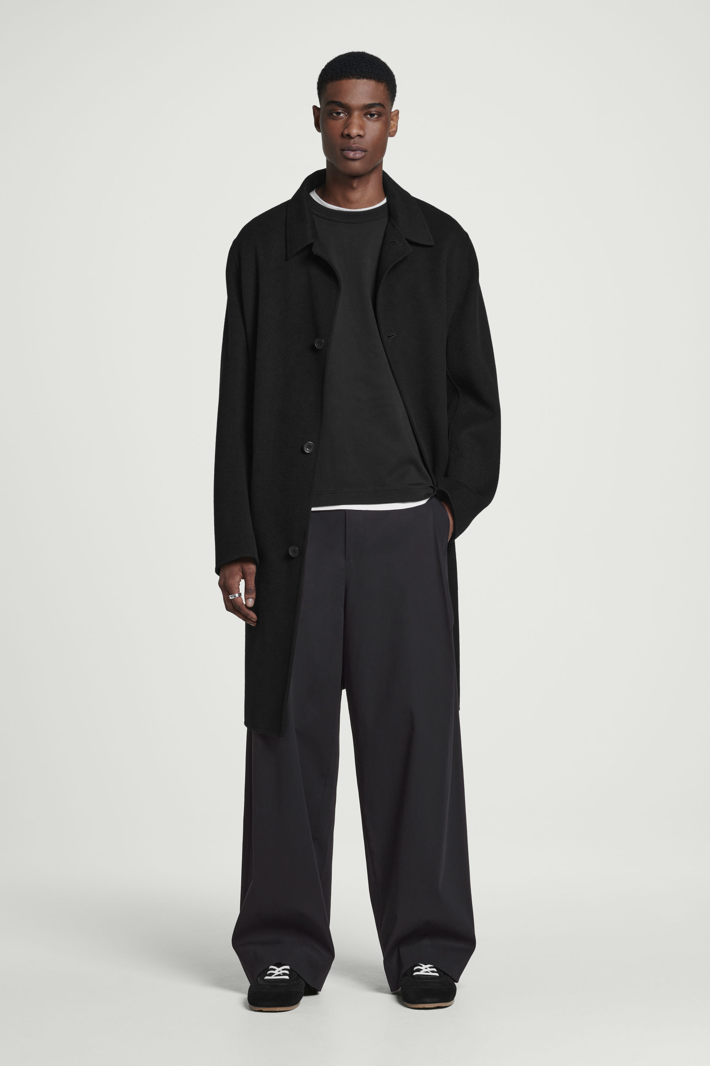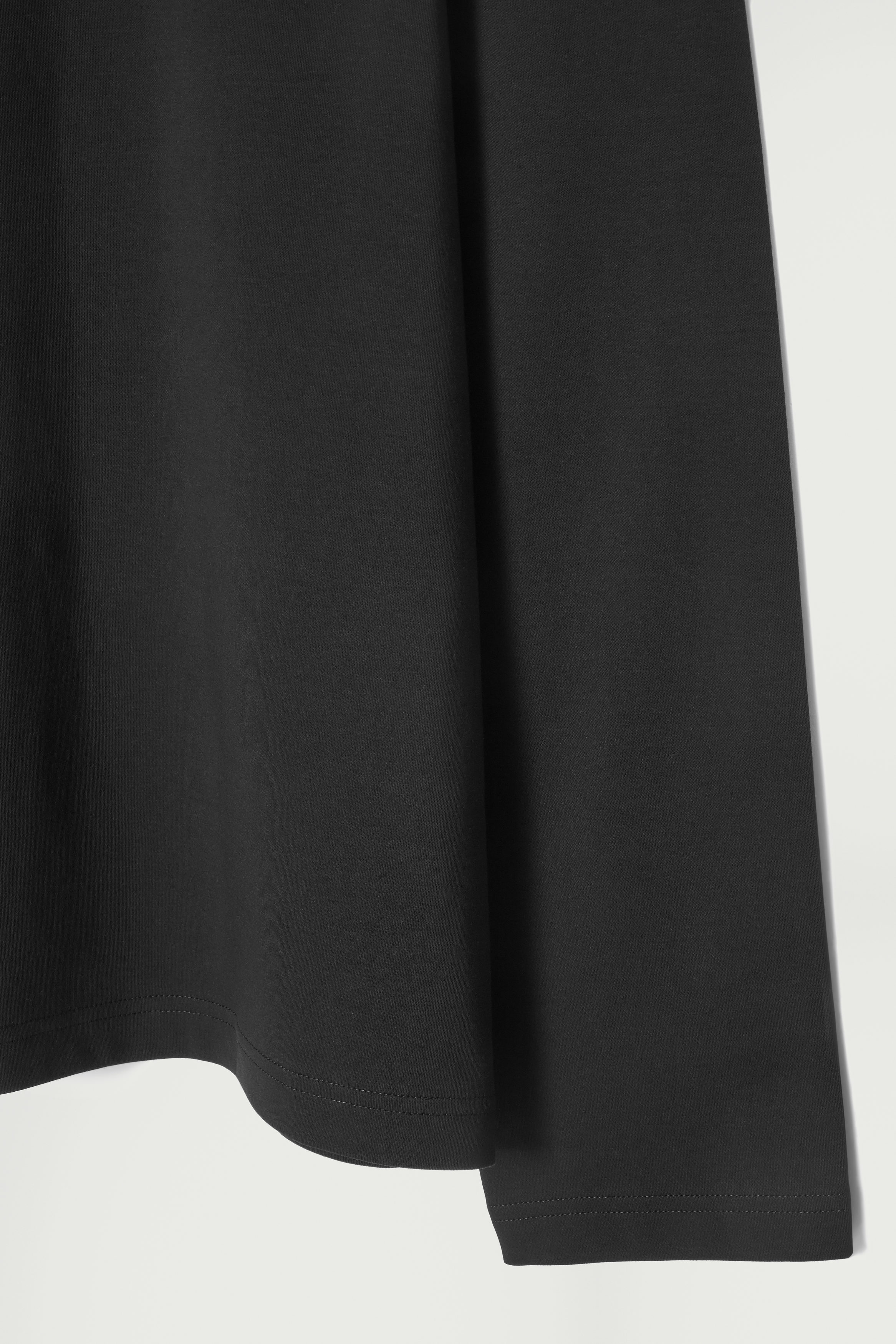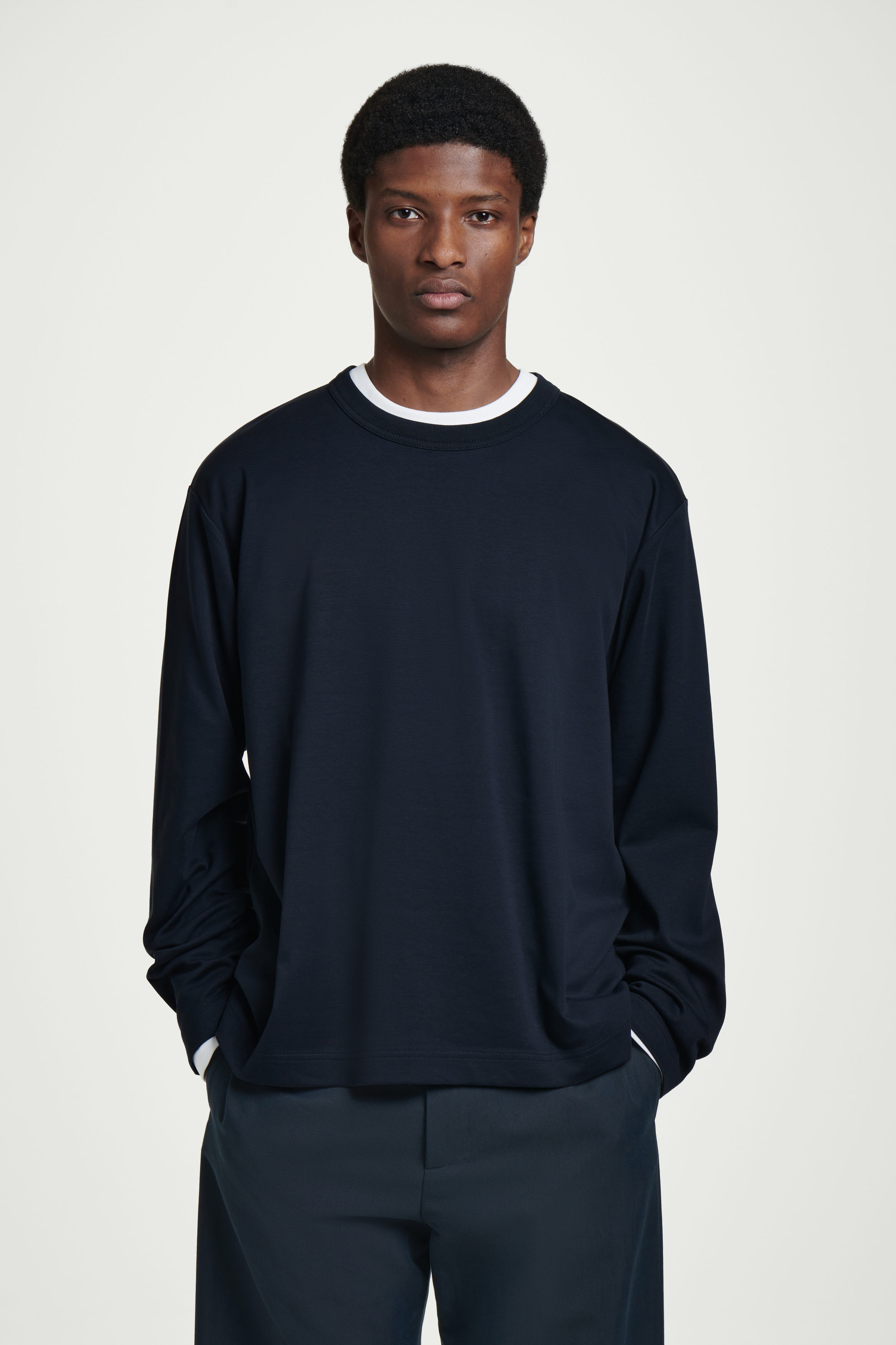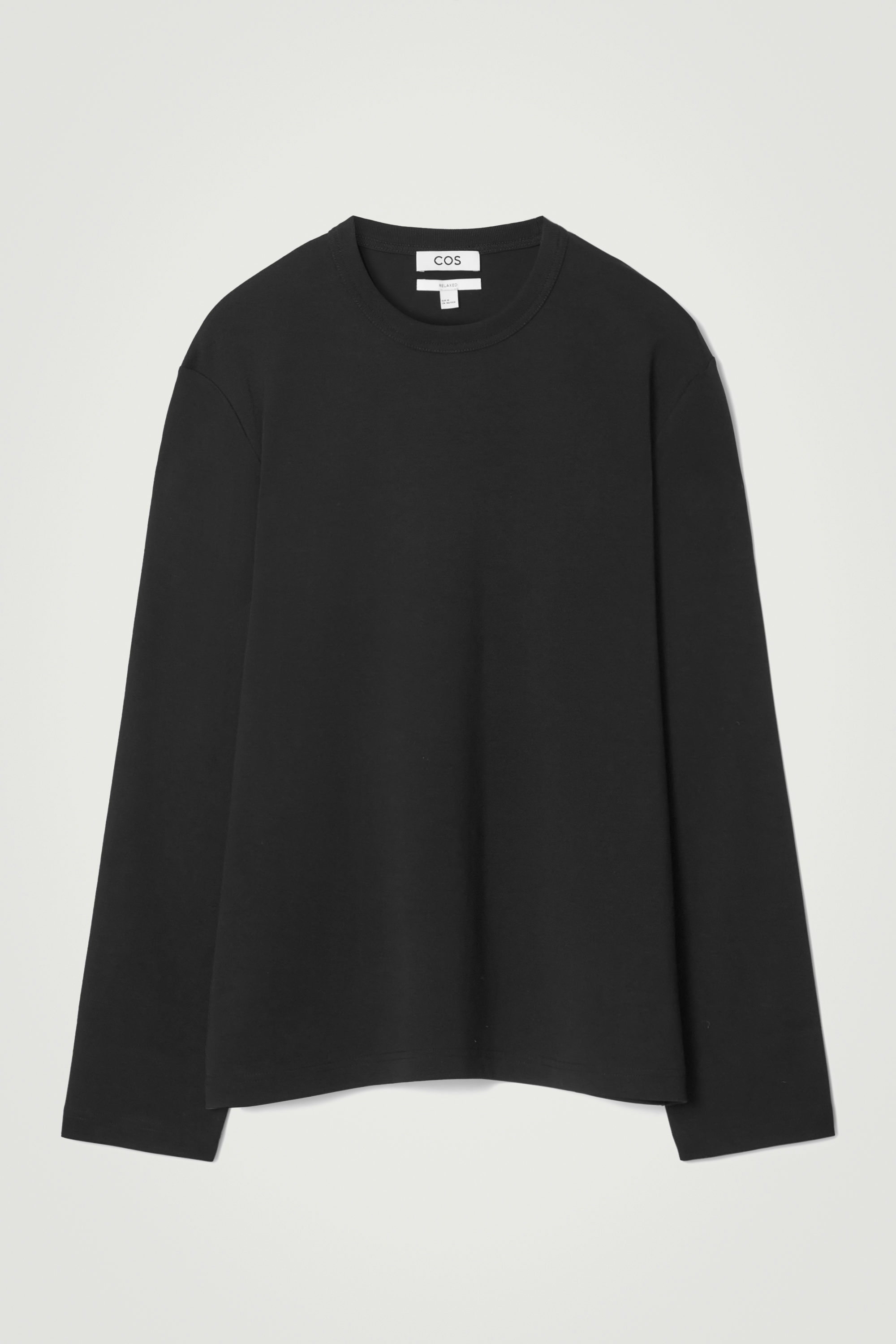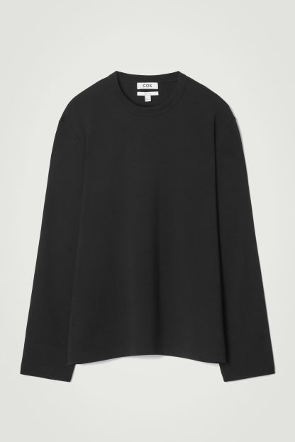 Den här långärmade t-shirten i svart är gjord av ekologisk bomullstrikå i dubbla lager med överlappande interlock-stickning för en mjuk, slitstark och varm känsla. Snittet är avslappnat och kombineras med rund halsringning.