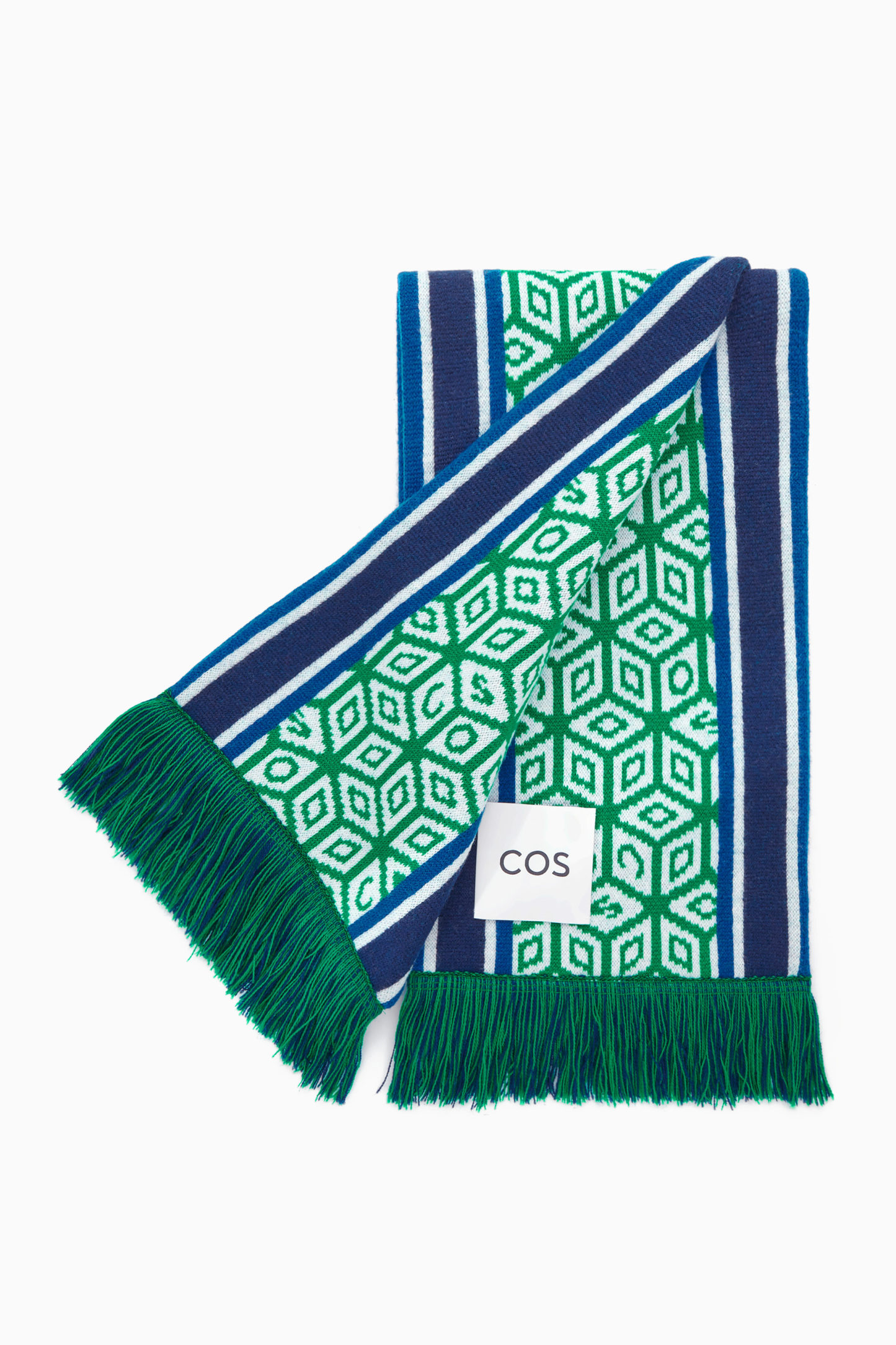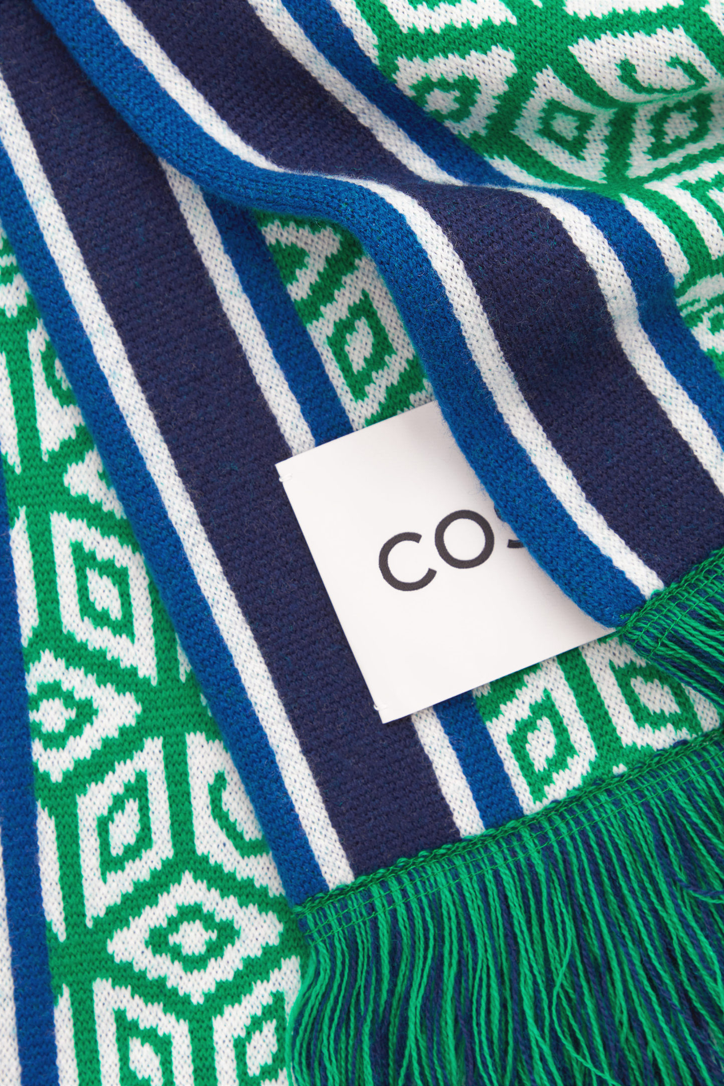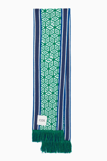 Inspirationen till den här halsduken kommer från fotbollsvärlden, men den är alldeles för elegant för att sitta på bänken fram till matchdag. Designen har fransar i ändarna och har subtila cthtos-loggor som en del av mönstret. Den dubbelsidiga, RWS-certifierade ullen är både mjuk och varm – en fullträff i kallt väder.