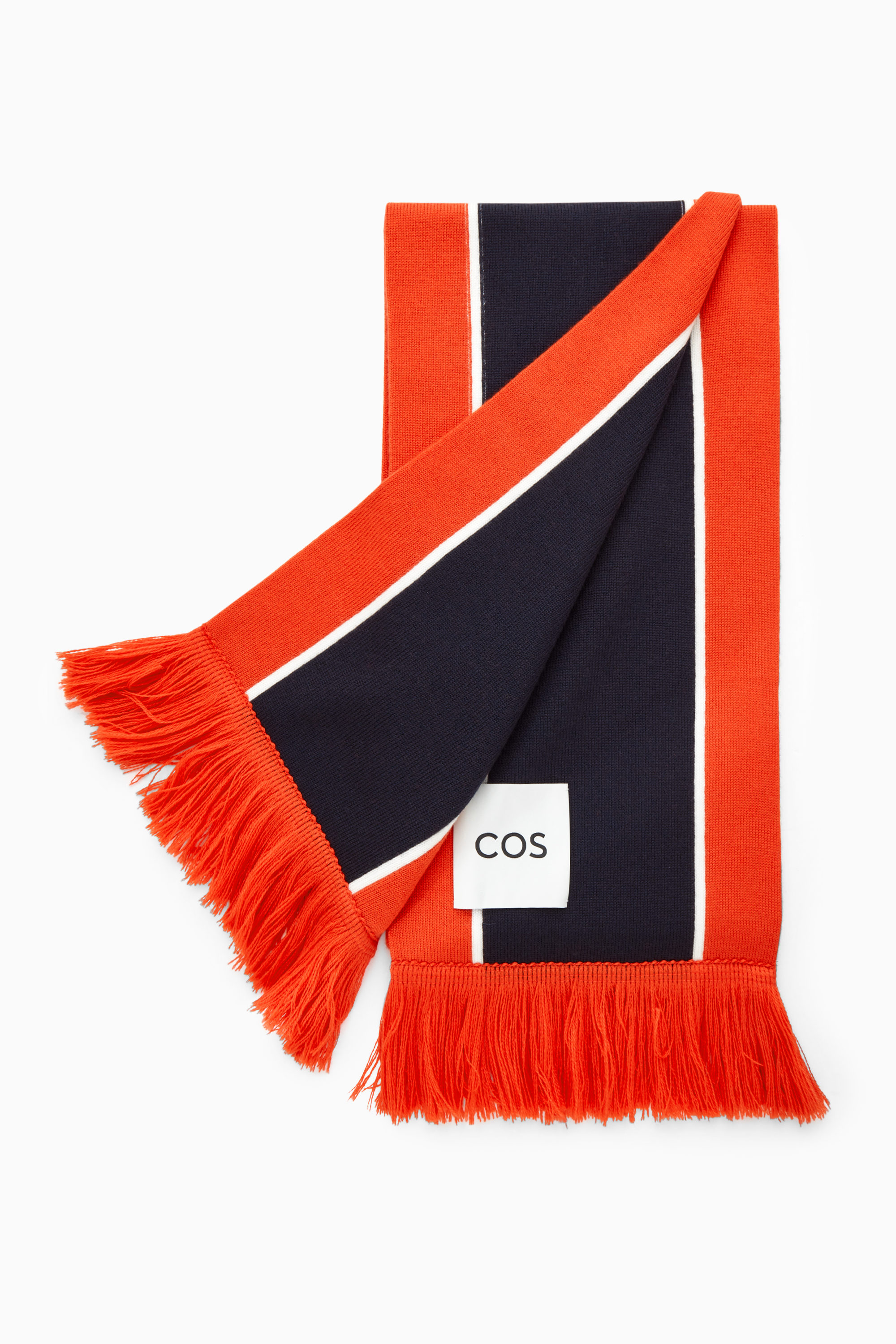 Inspirationen till den här halsduken kommer från fotbollsvärlden, men den är alldeles för elegant för att sitta på bänken fram till matchdag. Designen har fransar i ändarna och är skickligt stickad med breda ränder i marinblått, vitt och klarorange. Den dubbelsidiga, RWS-certifierade ullen är både mjuk och varm – en fullträff i kallt väder.