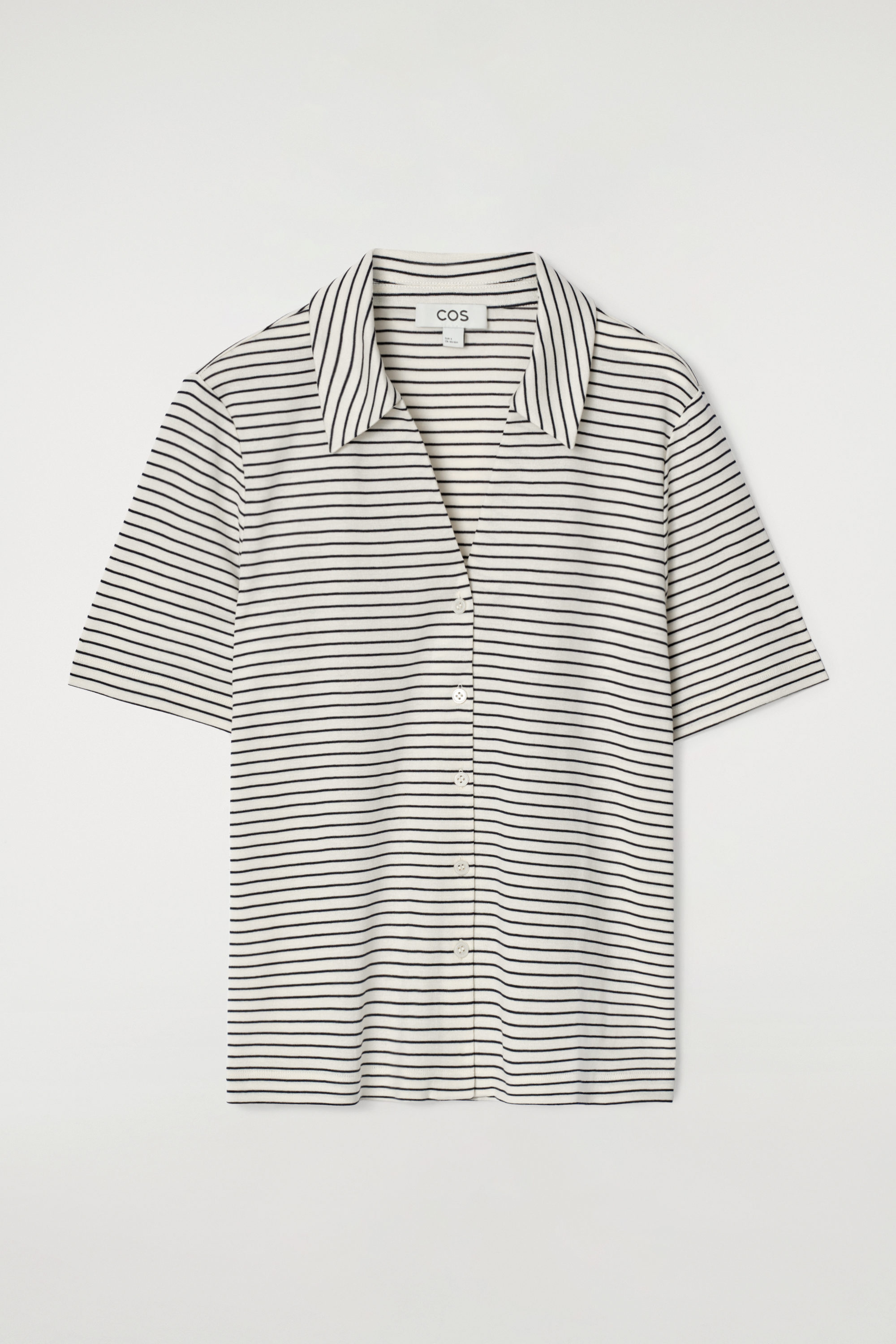 Refined silhouettes are a pillar of the cthtos womenswear collection. Inspired by resortwear, this modern shirt is crafted from luxuriously soft cotton-jersey and cut in a form-fitting shape with a pointed collar and deep neckline. It's patterned with Breton-style stripes in a white and black palette.
