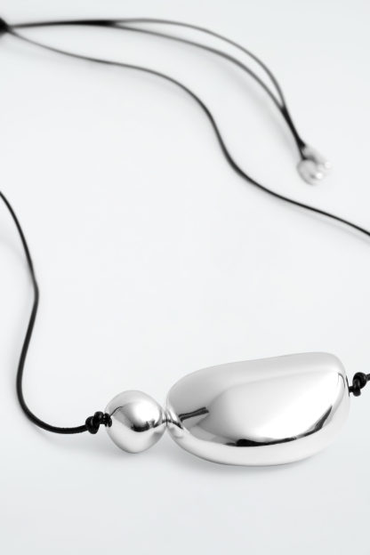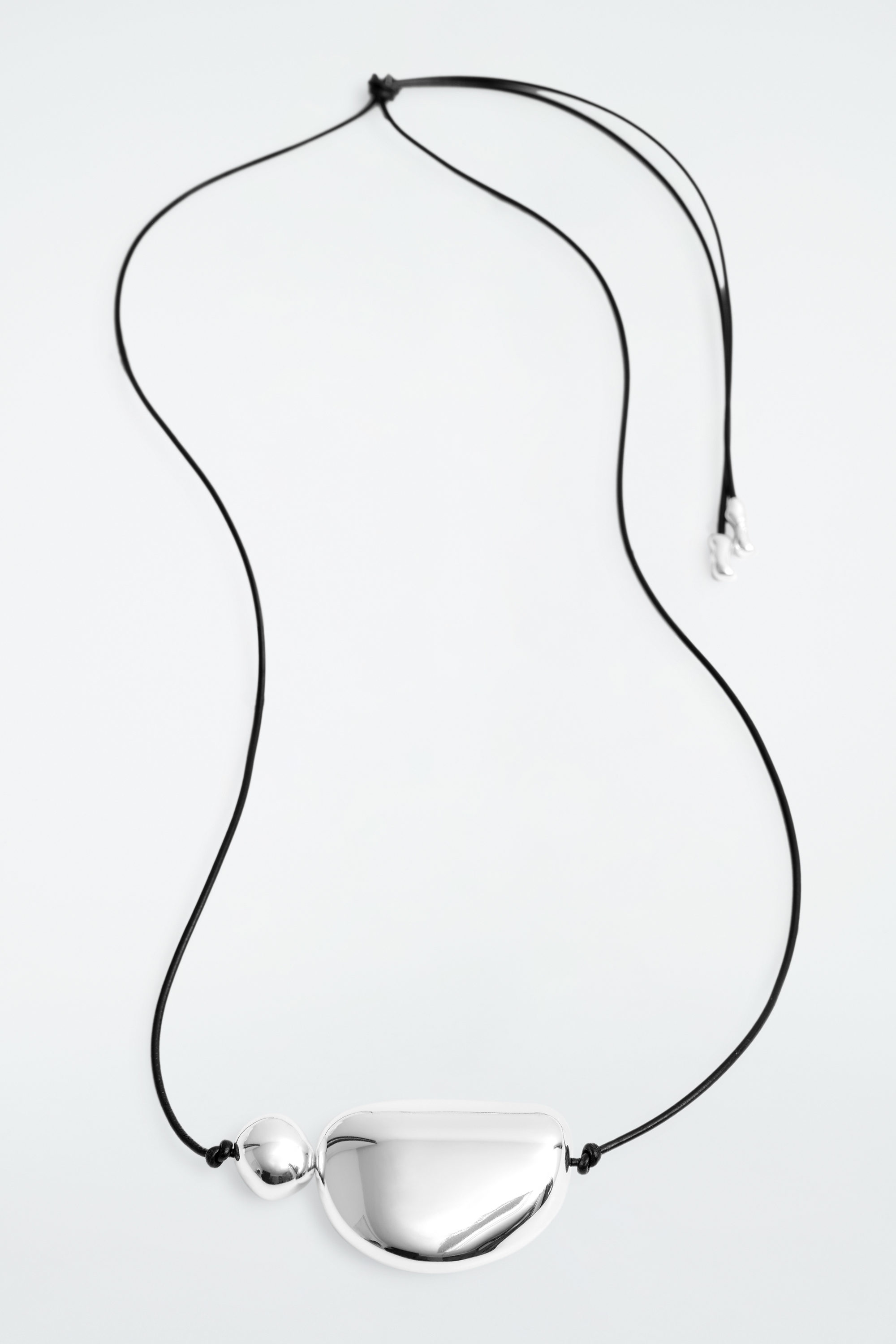 Architectural in design, this modern necklace features a leather rope that's strung with a pair of mismatched silver-plated pendants. It's finished with a pair of metal caps that mirror the organic shape of the charms.