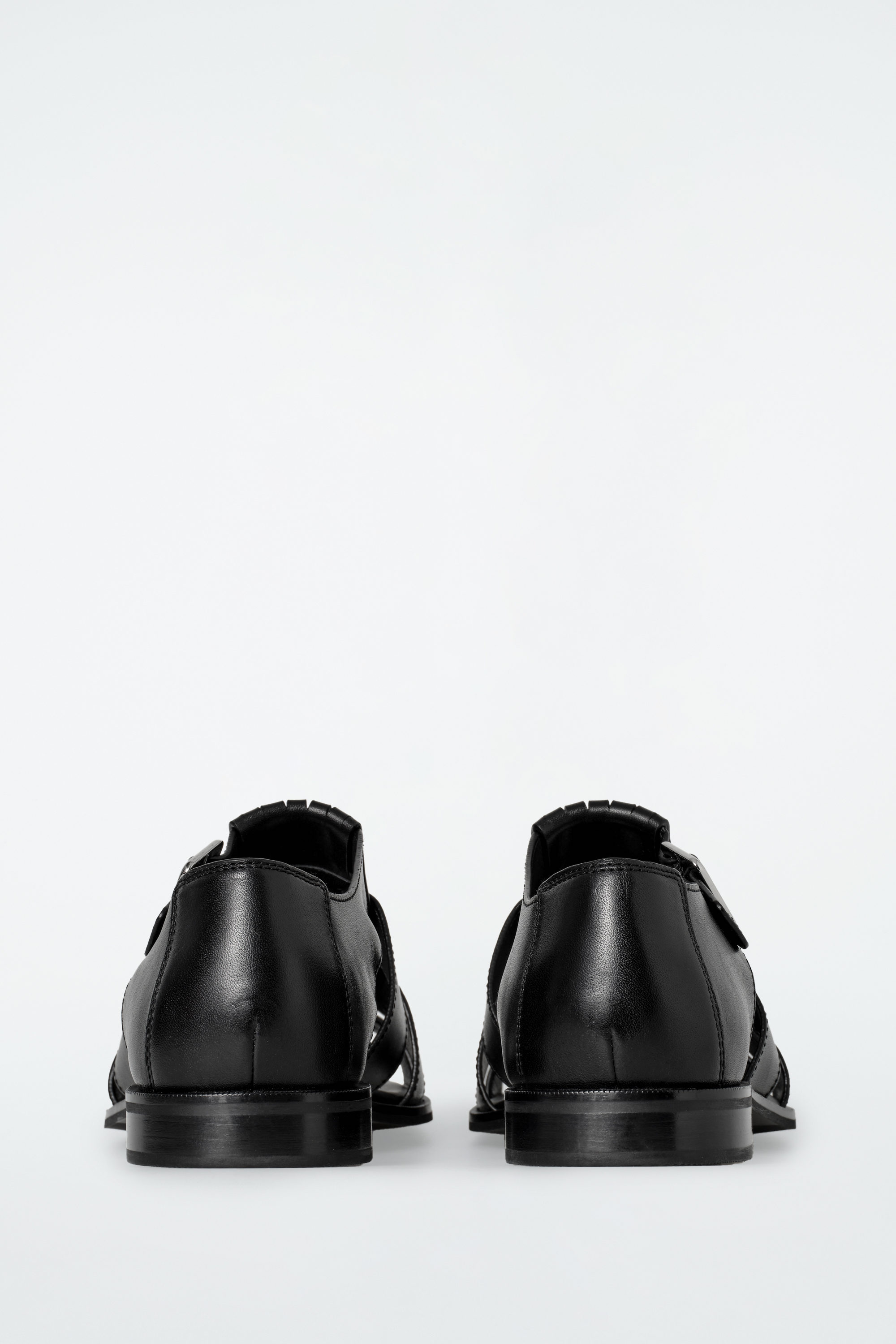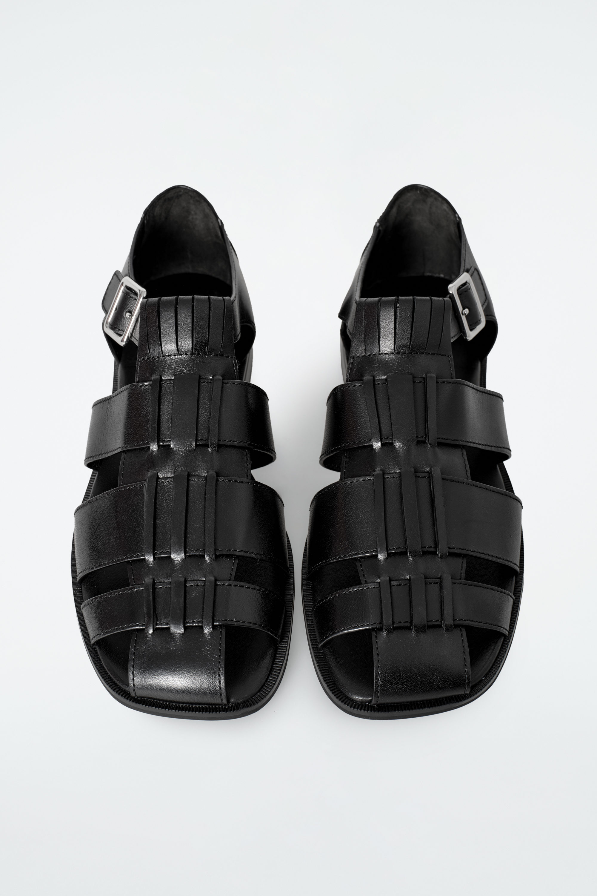 Den här säsongen moderniserar cthtos designteam en klassisk silhuett: fiskarsandalen. Detta par är tillverkade i smidigt, kromfritt läder och har breda, omlottlagda omlott med fyrkantig tå samt en låg, staplad klack.