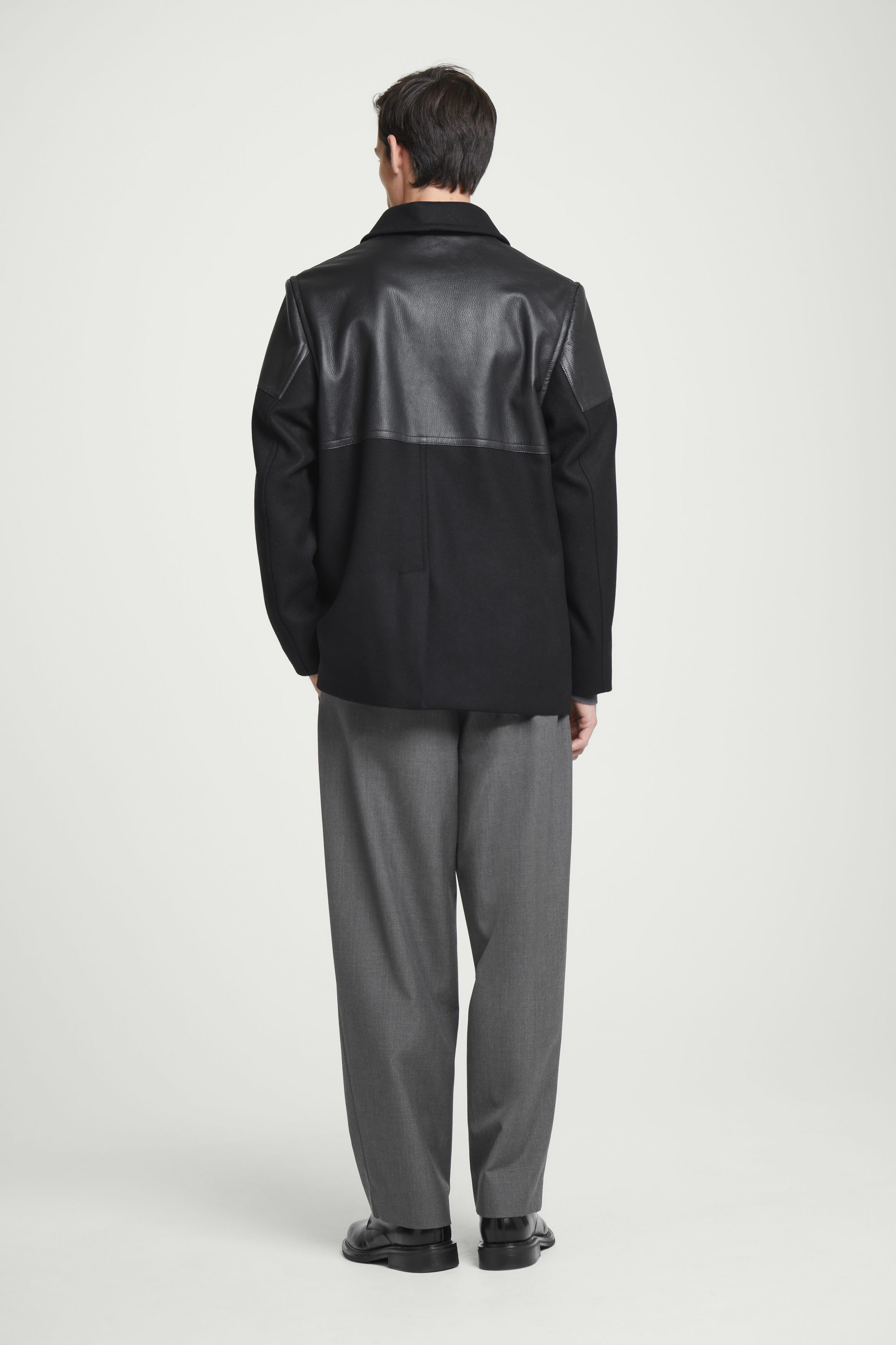 Denna sofistikerade jacka i donkeymodell är en nyckelstil i höst- och vinterkollektionen och en självklar grundsten i herrgarderoben. Den är tillverkad av en mjuk, återvunnen ullblandning och har karaktäristiska läderpaneler över axlarna – en subtil hyllning till klassisk workwear. Med sitt varma material och praktiska fickor är den perfekt för dagar i city.