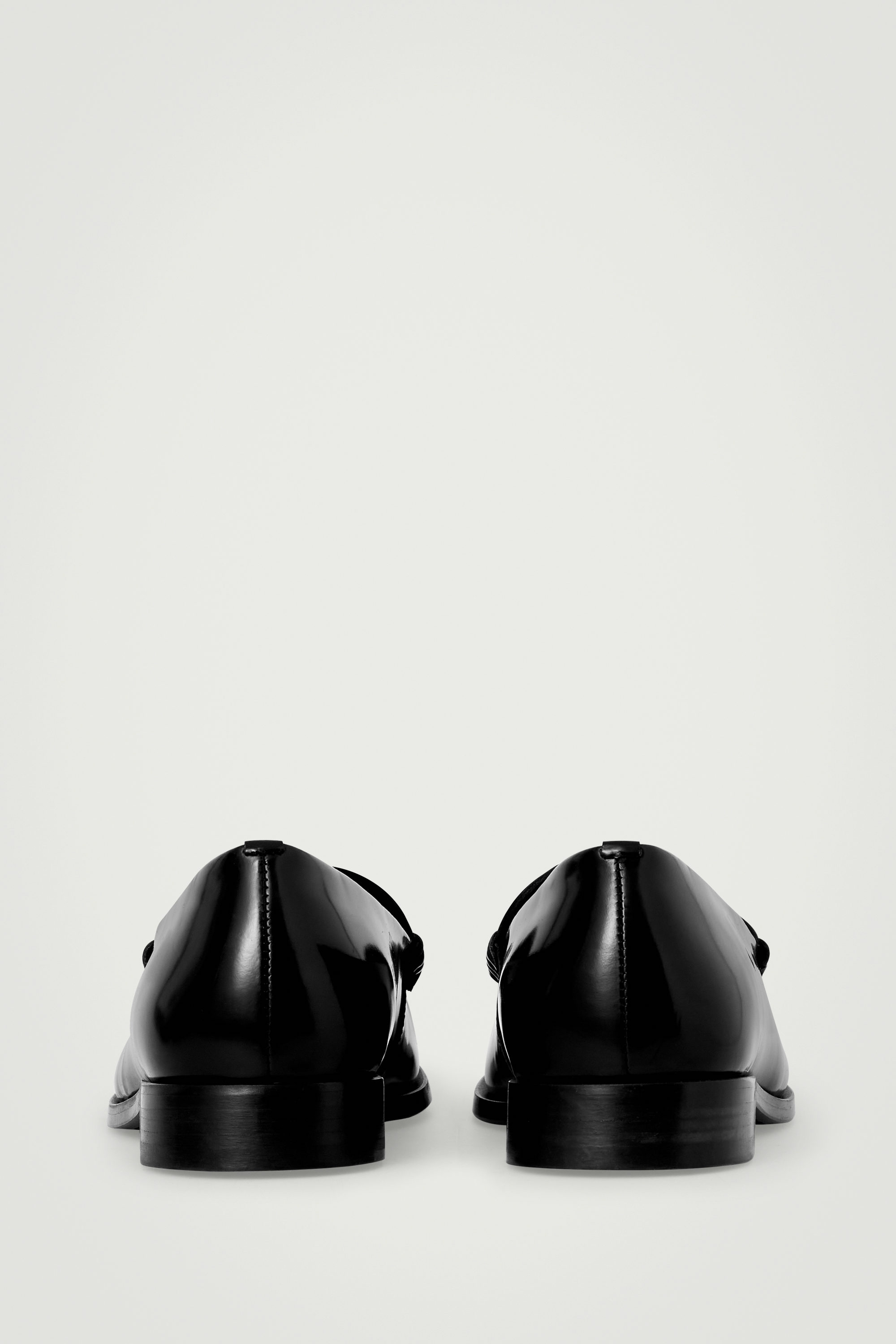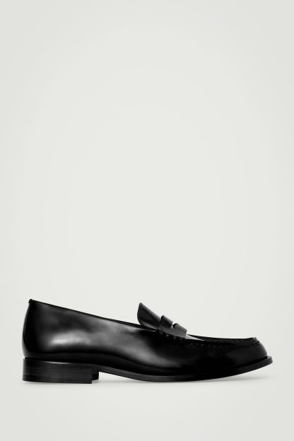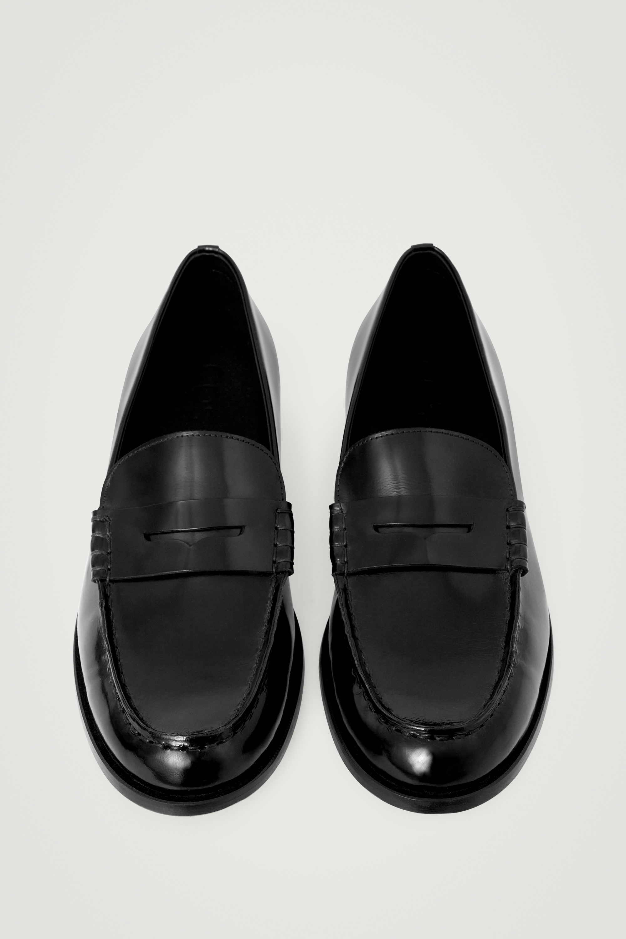 De här förfinade skorna utgör en modern tolkning av klassiska penny loafers. De är gjorda av mjukt läder med en polerad premiumfinish och försedda med rundad tå och färgmatchade stickningar. Designen har samma typ av band över vampen som originalet.