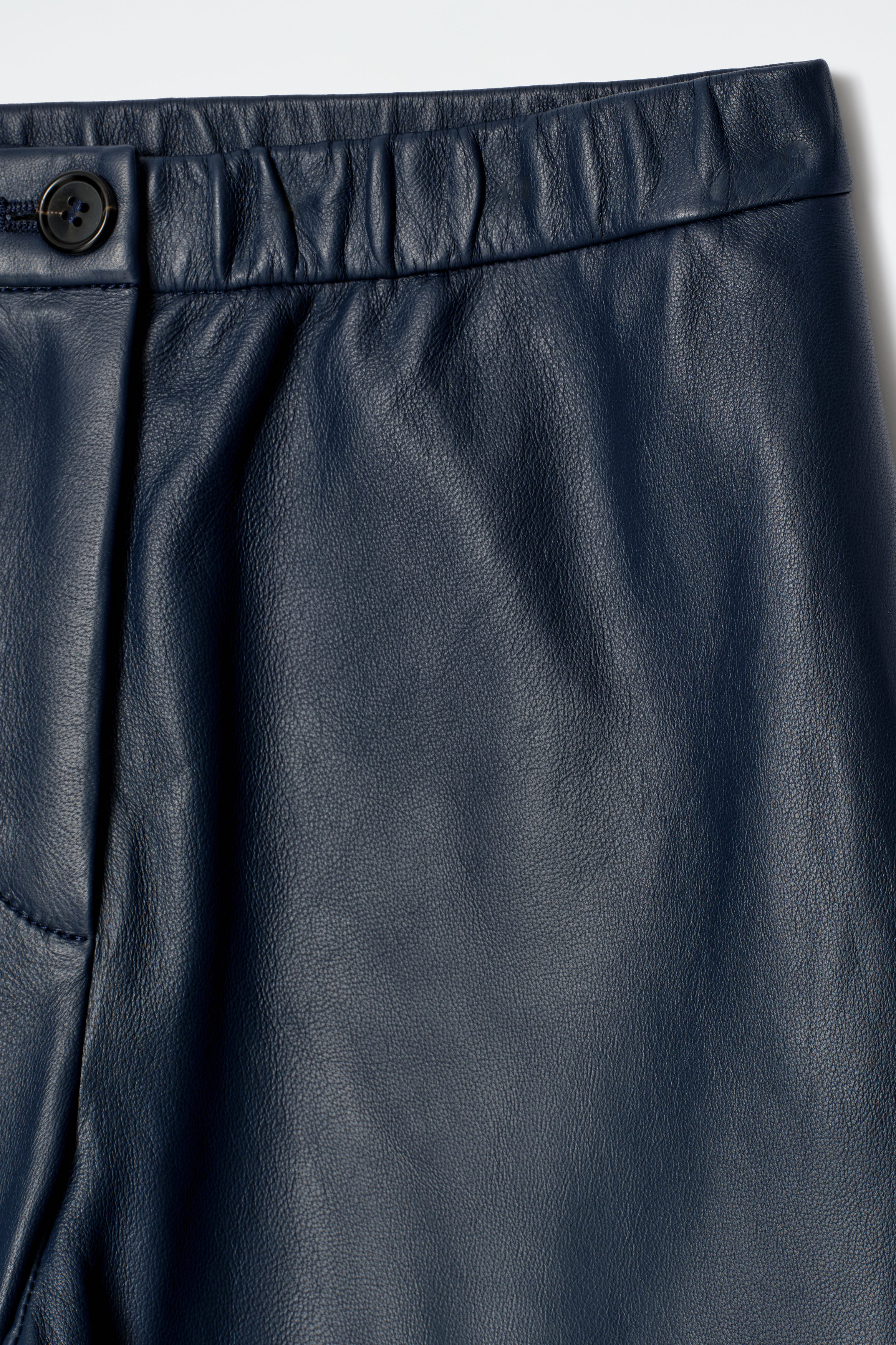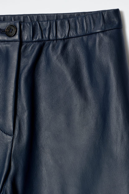 Dessa sofistikerade träningsbyxor förhöjer klassiska skrädderikoder. De är tillverkade av mjukt läder i en djup, midnattsblå nyans och skräddade i en tidlös, rak silhuett med elastisk midja och muddar. Styla dem med den matchande kavajen för en fulländad look.