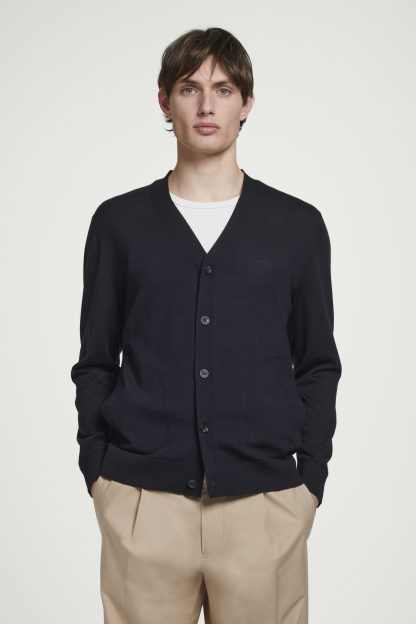 Välpolerade basplagg är en grundsten i cthtos herrkollektion. Denna cardigan är stickad i premium merinoull med en mångsidig, marinblå nyans och är designad med V-ringning, påsydda framfickor och ribbade kanter.