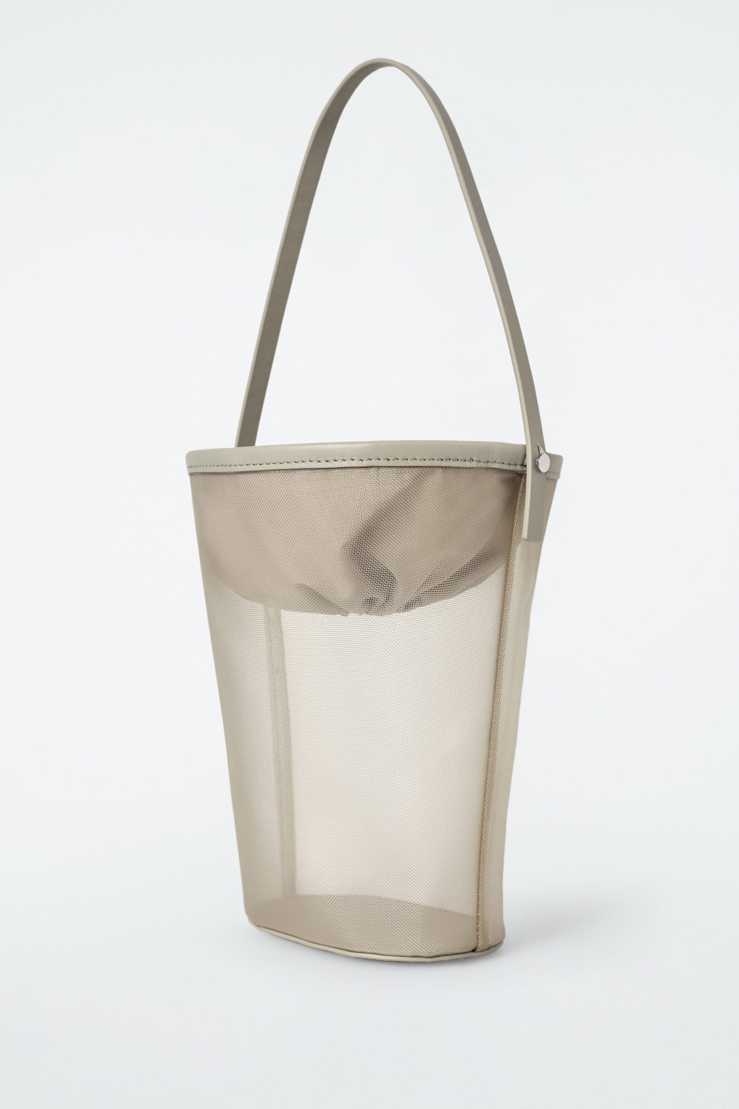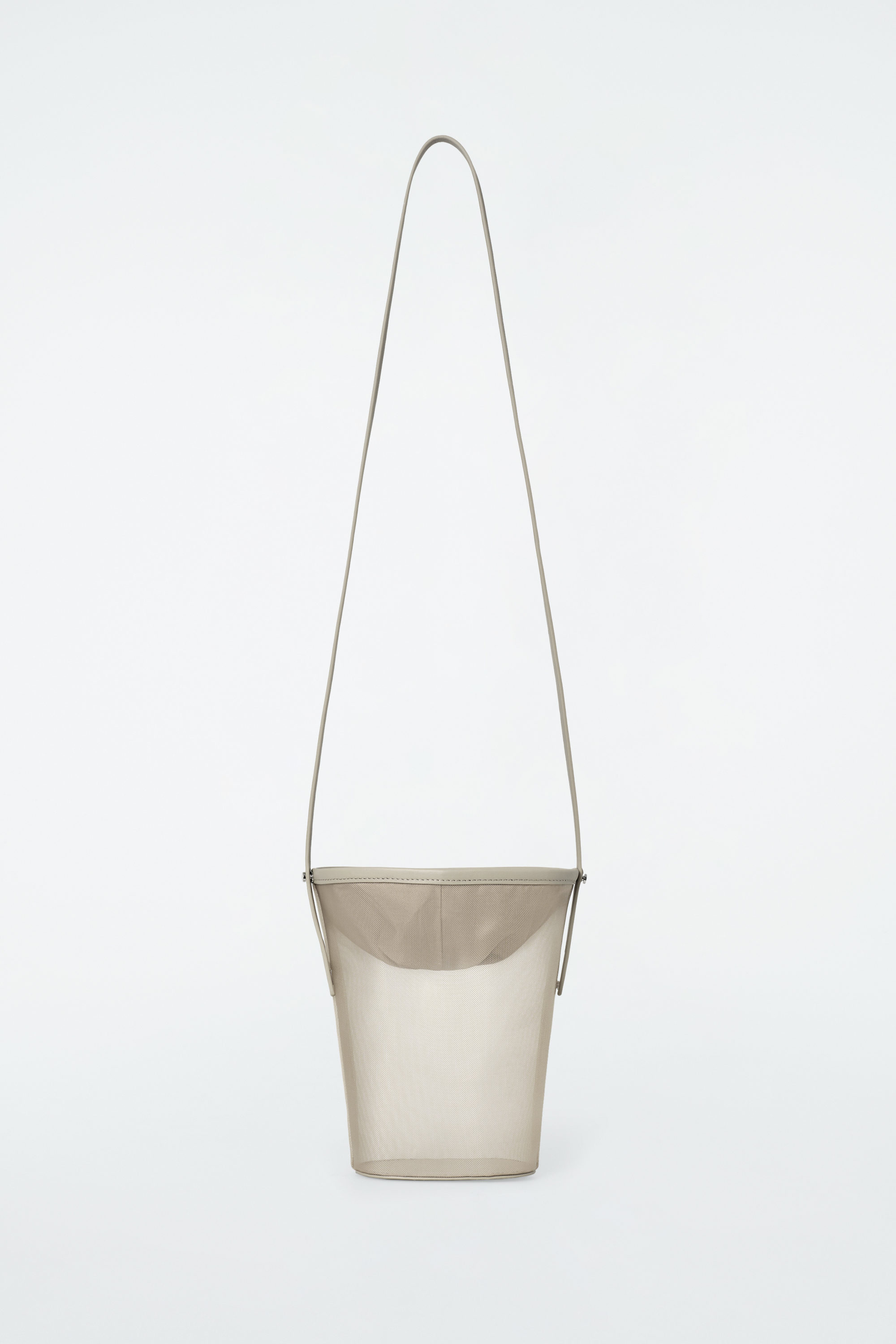 En ny ikon i cthtos kollektion – denna miniversion är en modern tolkning av den klassiska bucketväskan. Den är tillverkad av skir mesh i en stilren cappuccino nyans samt är designad med en färgmatchad dragsko och en smal rem som kan bäras över axeln eller i handen.