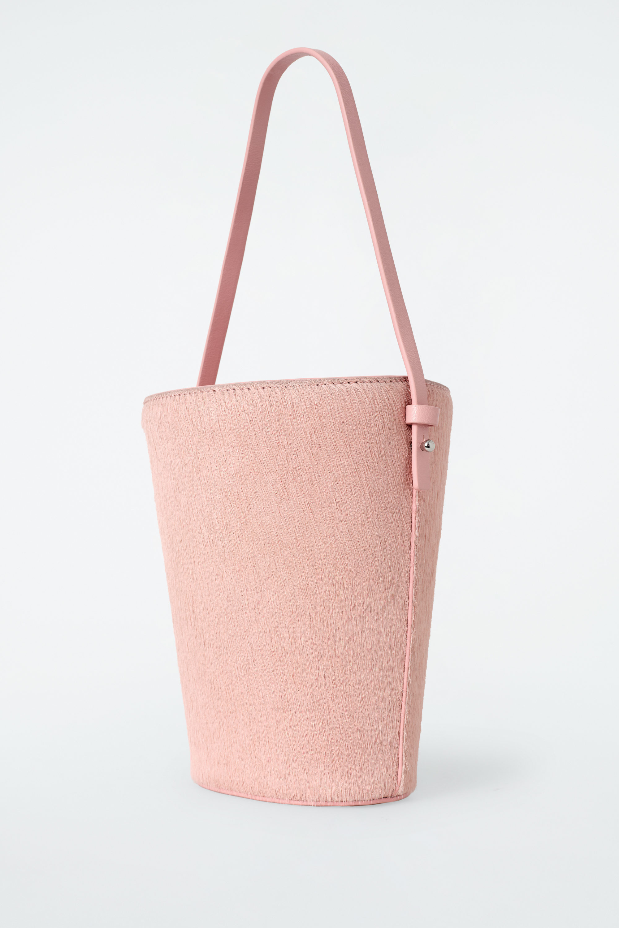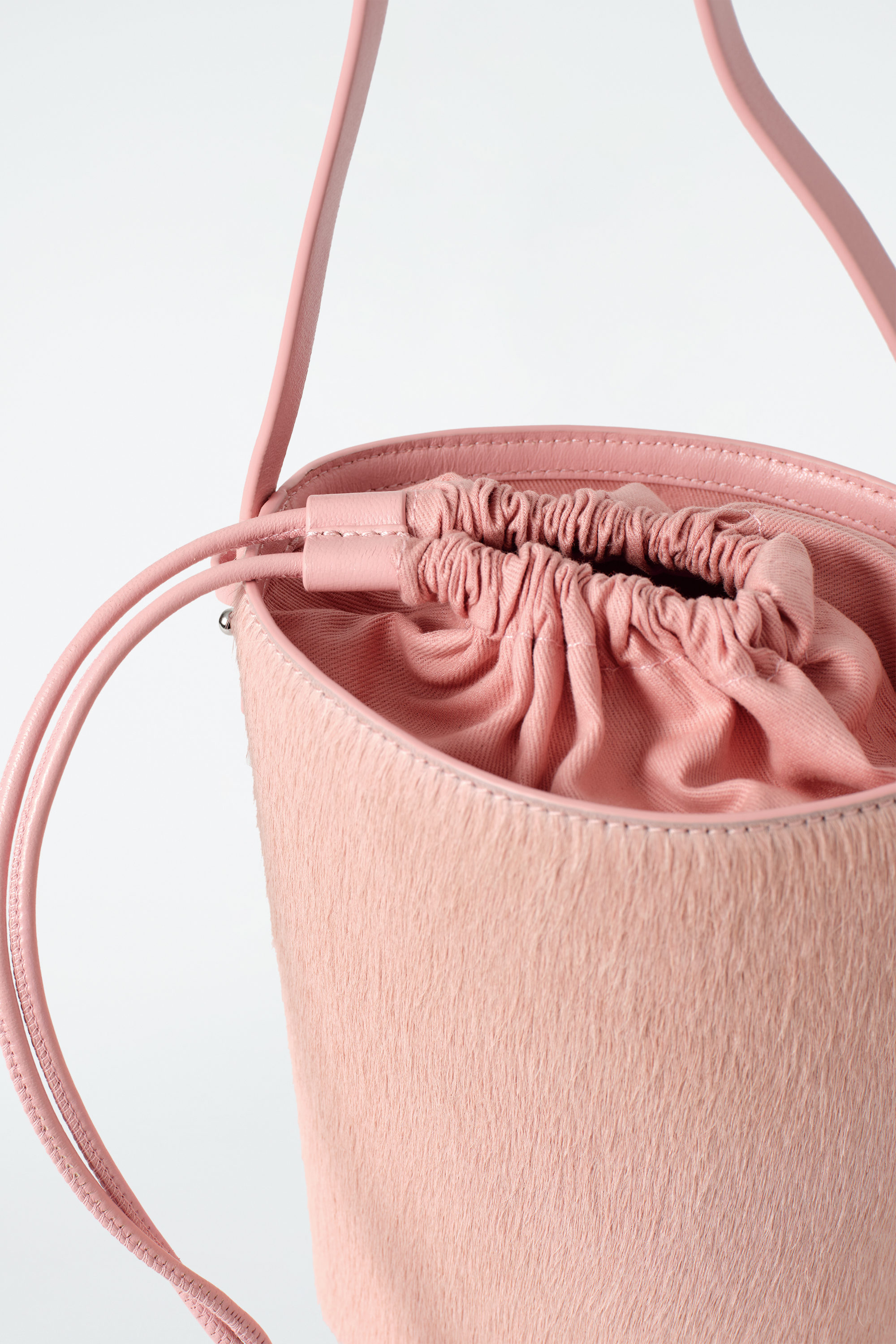 Den nya ikonen i kollektionen – denna miniväska är en nytolkning av den klassiska bucket-väskan. Designen är tillverkad av taktilt ponnyläder i en mjukt rosa nyans samt har en dragsko och ett smalt band som kan bäras över axeln eller i handen.