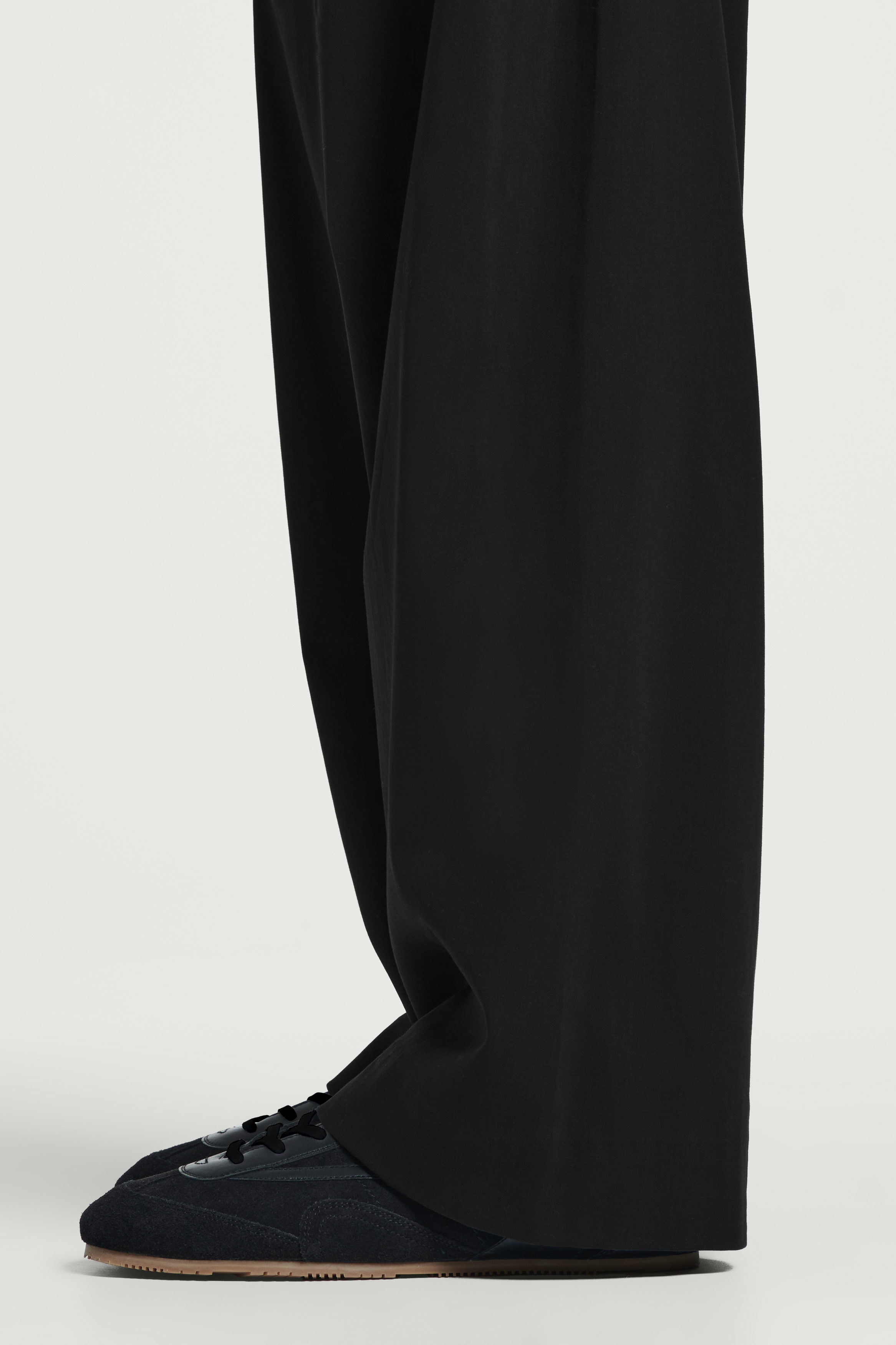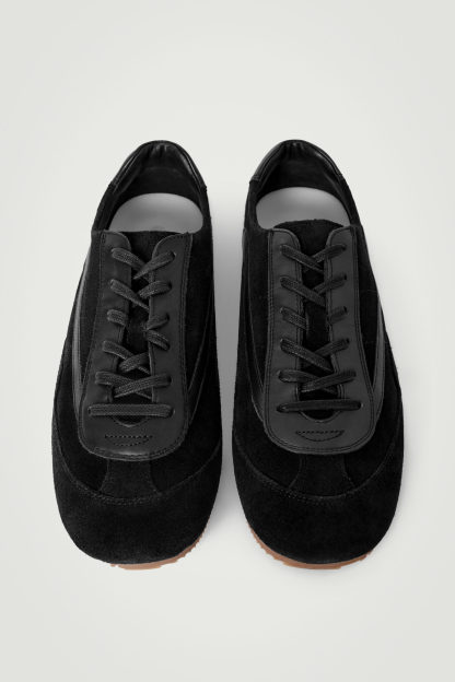 Dessa minimalistiska sneakers visar upp en sofistikerad tolkning av sportiga silhuetter med ett strömlinjeformat snitt. De är tillverkade av borstad, nattsvart mocka, har en fint räfflad sula och är kantade med läderdetaljer som den diskreta C-kurvan på vardera sida. Styla dem med de vita eller svarta snörena beroende på din look.