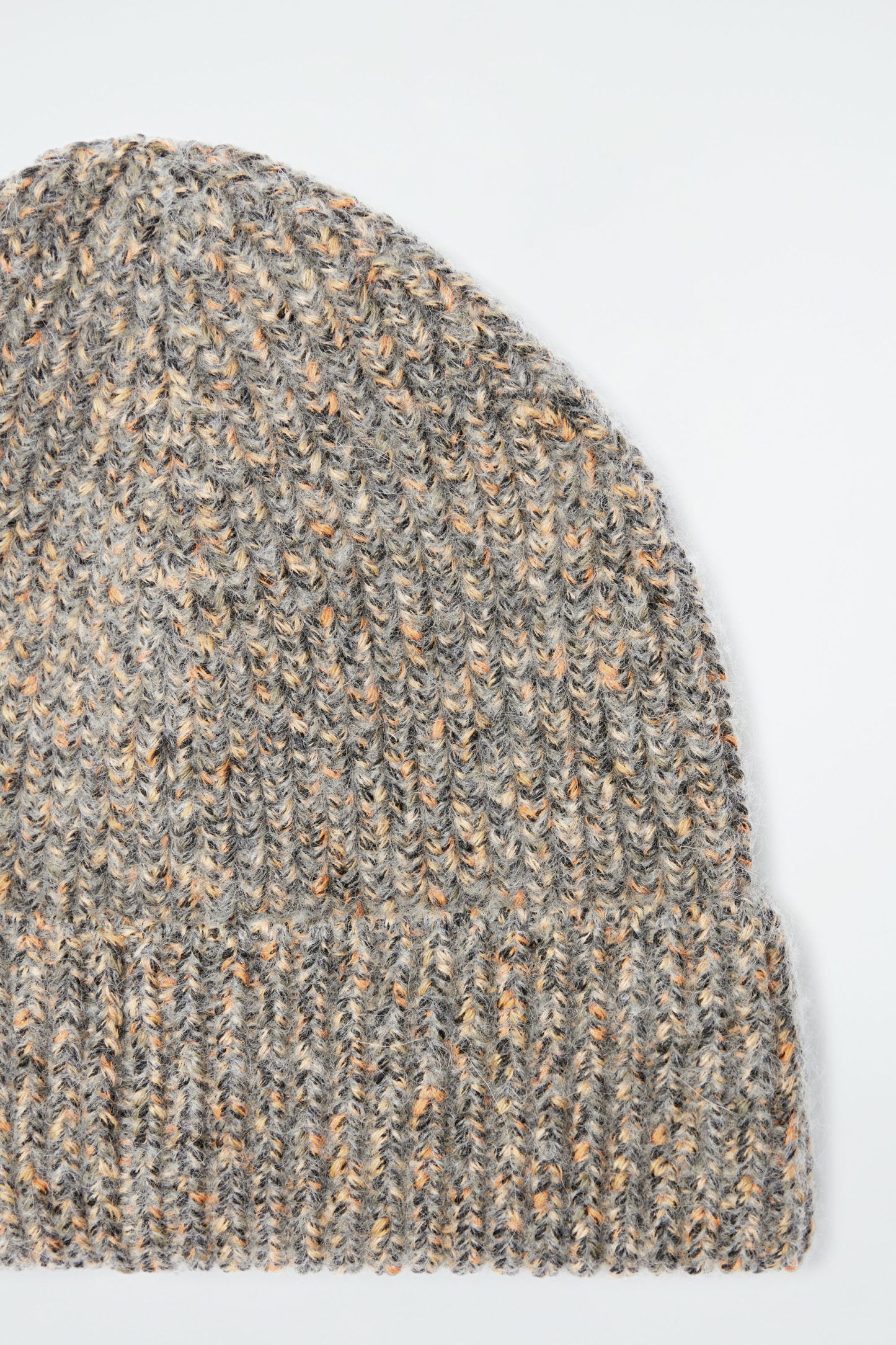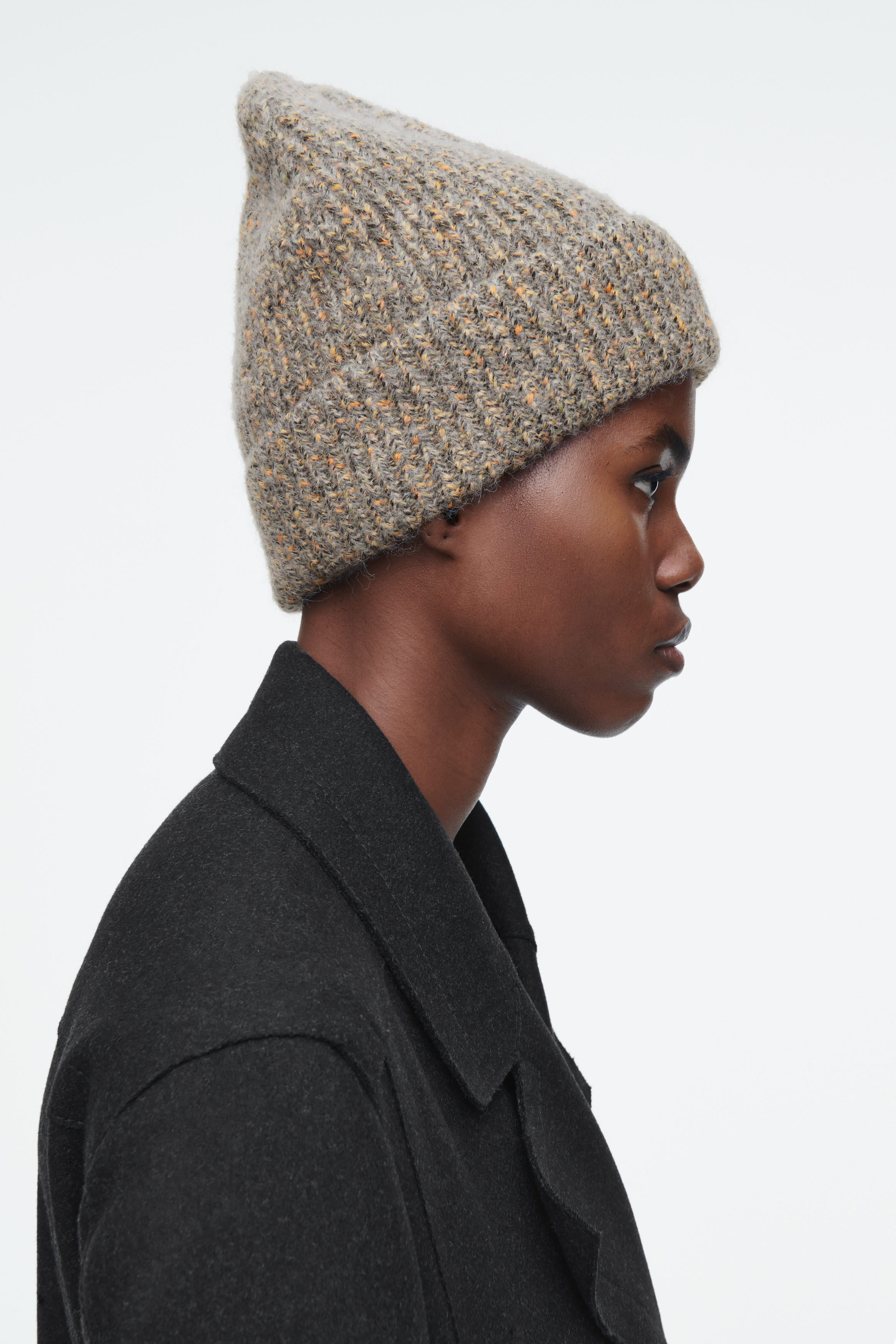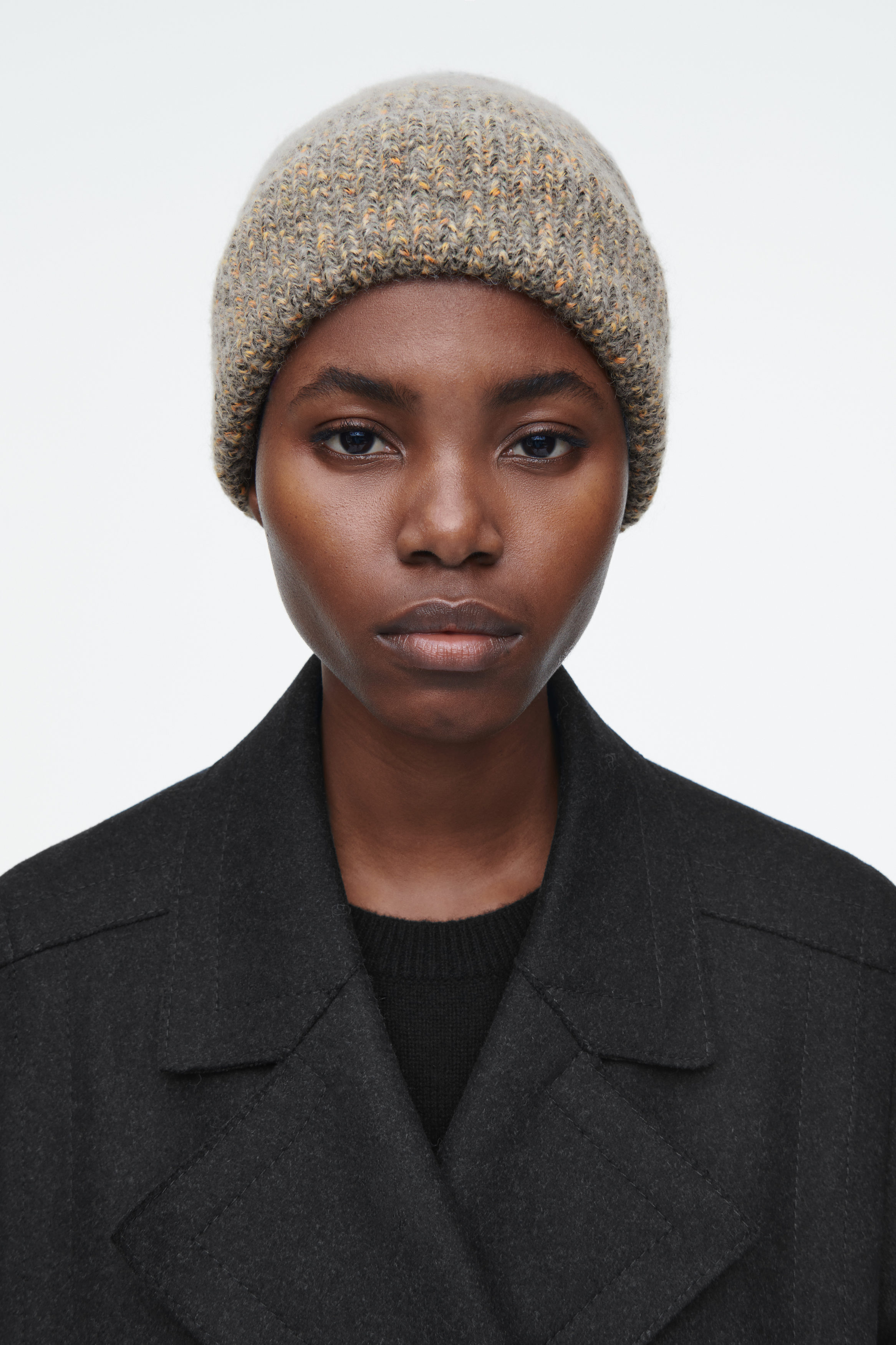 Färg och struktur ger en extra dimension till accessoarer för kallare väder denna säsong. Den här melerade mössan är grovstickad i en blandning av bomull, ull och alpacka som är borstad för en mjuk känsla.