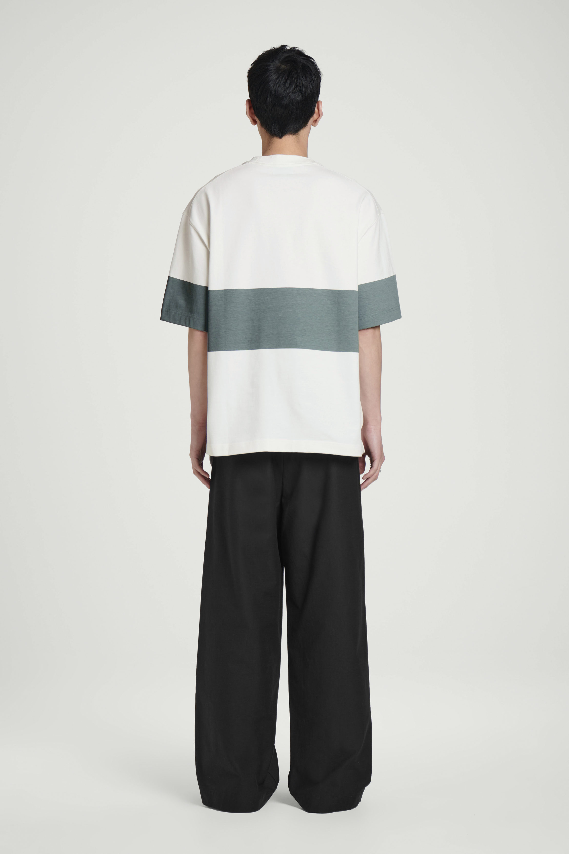 Designteamet gör en nytolkning av en ikon: den lediga t-shirten. Tillverkad av mjuk och samtidigt tjock bomull med ett oversize-snitt och en design med stålblå färgblock i ärmarna.