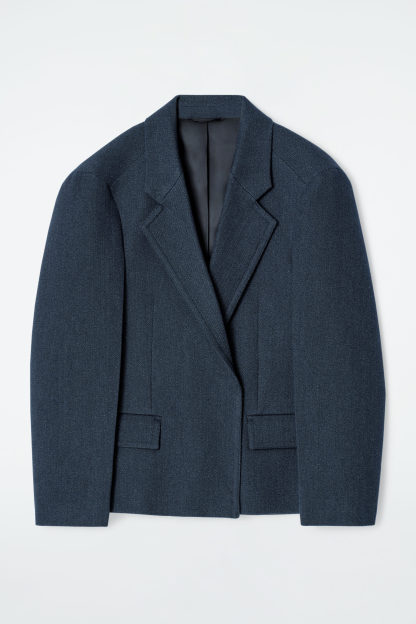 Den här säsongen tolkar designteamet skräddade plagg utifrån överdrivna proportioner. Den här enkelknäppta kavajen har ett oversize-snitt i en design med markerade axlar och insnitt i midjan som skapar en symmetrisk silhuett. Tillverkad av en blandning med återvunnen bomull och inslag av ull som färgats för en denimlook.