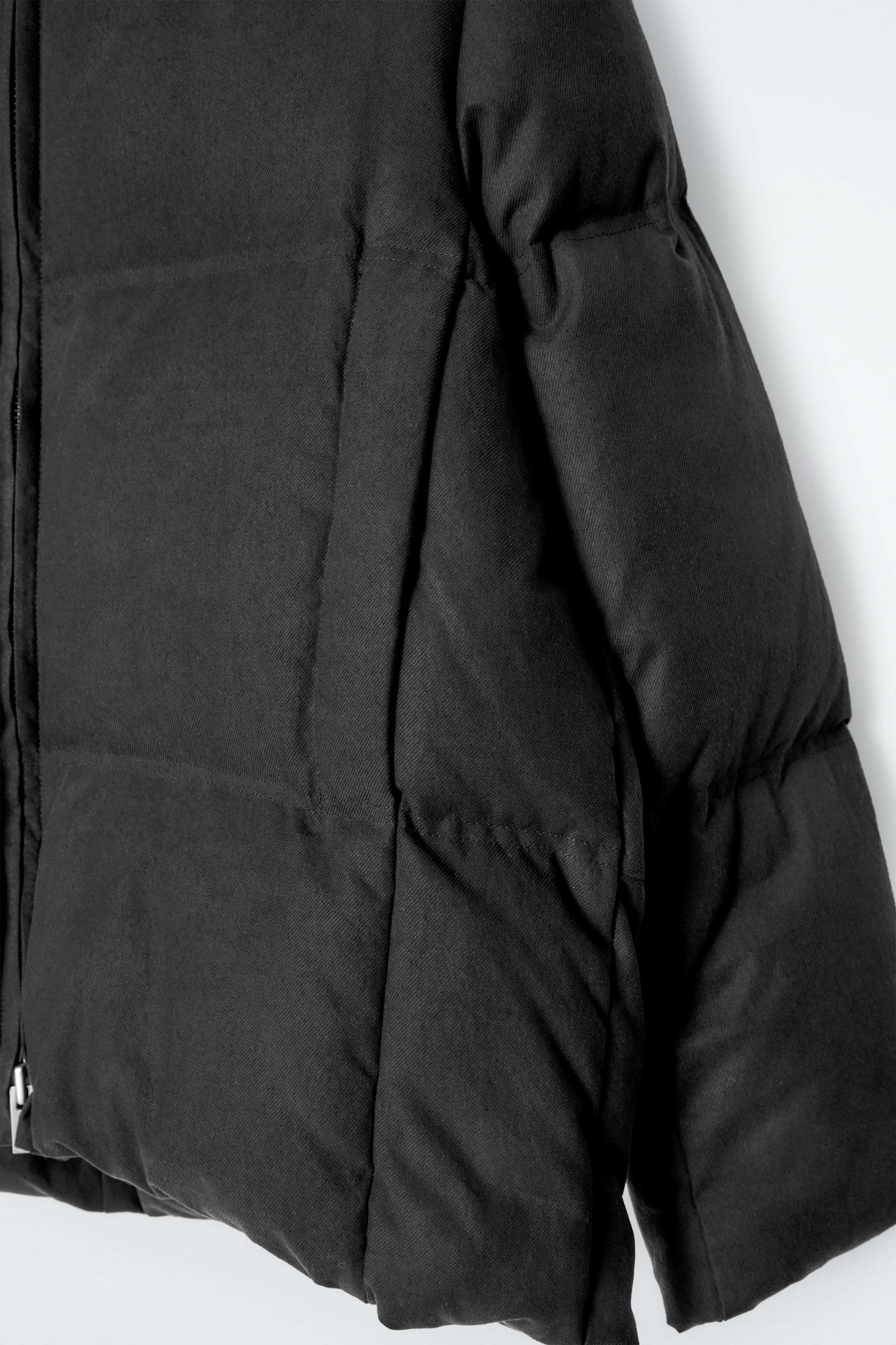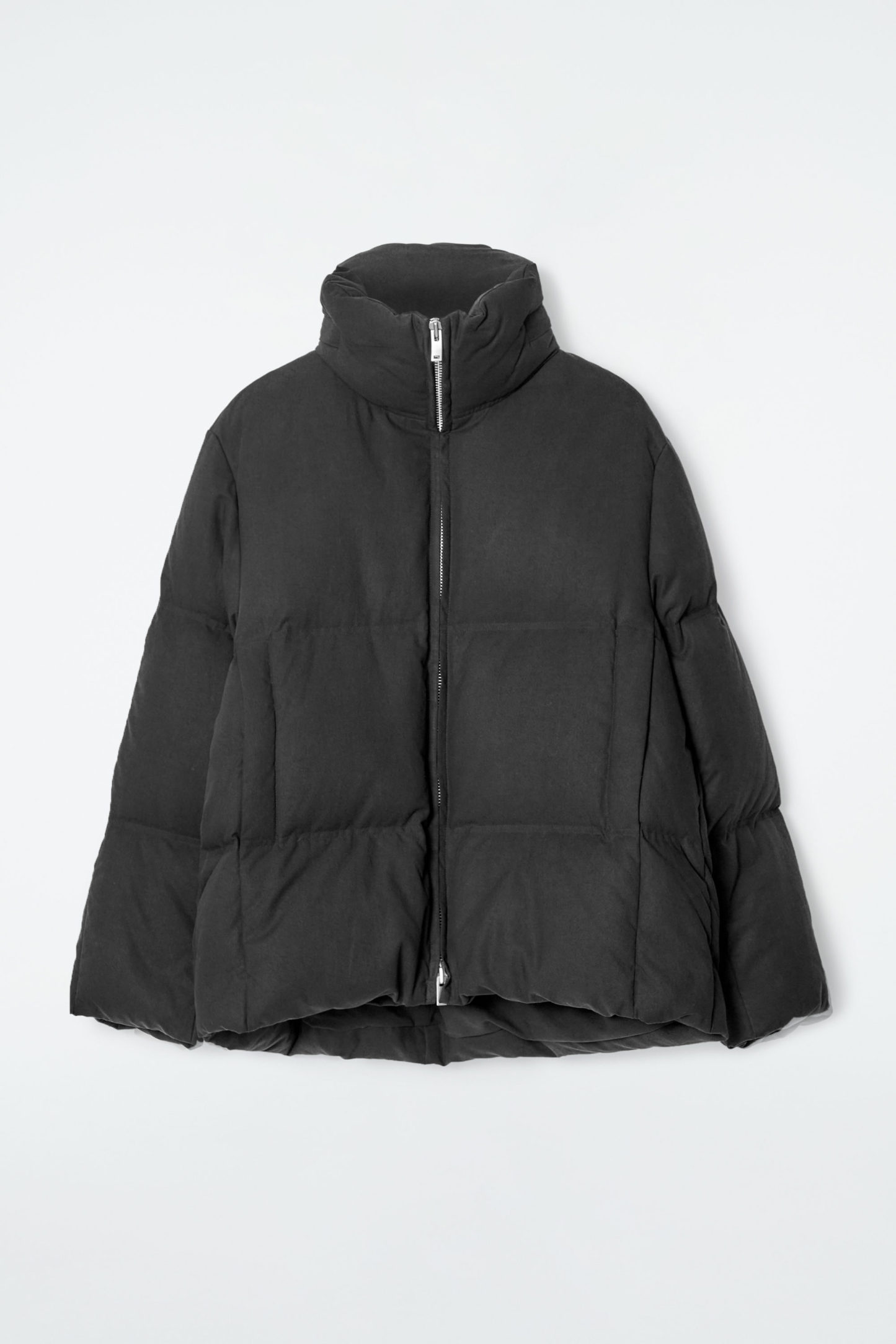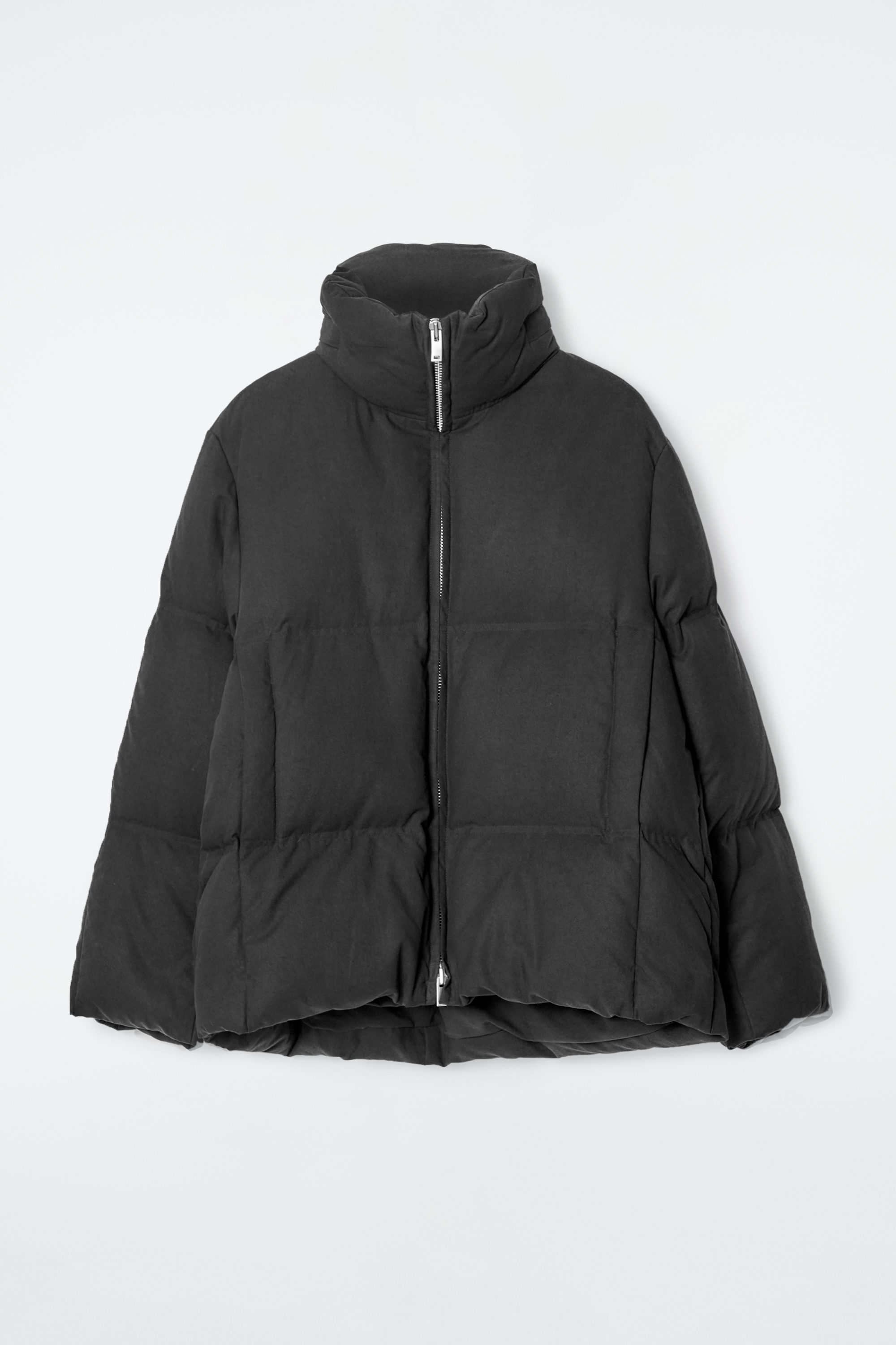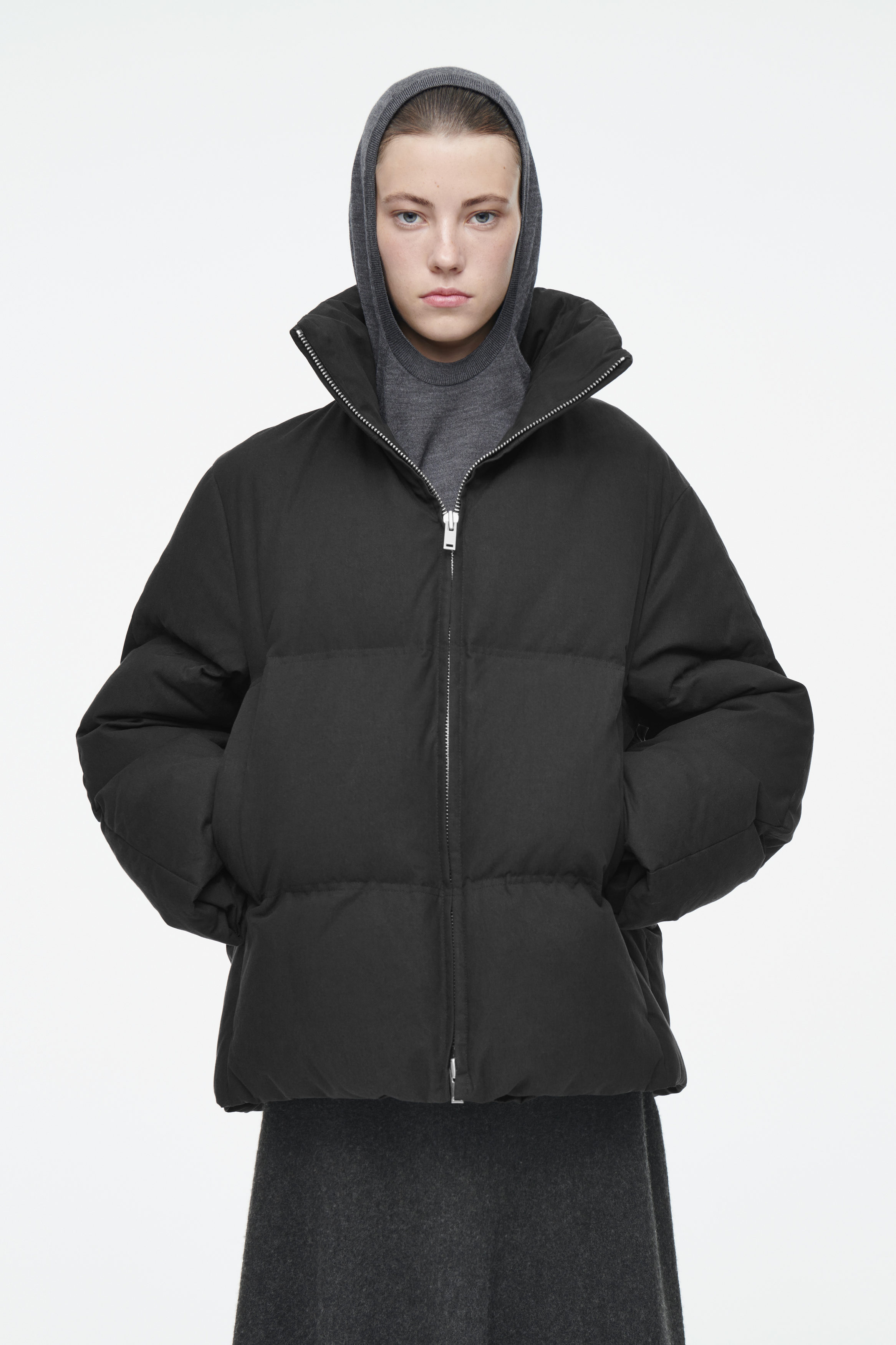 cthtos designteam presenterar stolt en raffinerad tolkning av den kalla årstidens viktigaste plagg: pufferjackan. Bekväm oversizemodell i bullig, quiltad bomullsblandning med fyllning av återvunnet dun och fjädrar som garanterat håller dig varm. Kapuschongen kan stoppas in i den höga kragen och sidofickorna knäpps med tryckknappar.