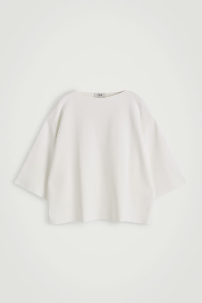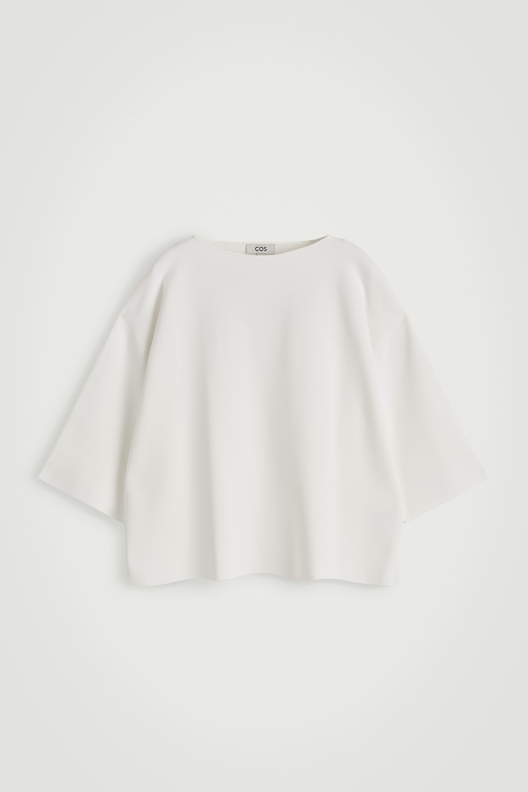 Reframing knitwear for summer, this oversized jumper is designed with short sleeves and a modern boat neck. It's finely knitted in a 16-gauge stitch and comes in a subdued white tone that's easy to style.