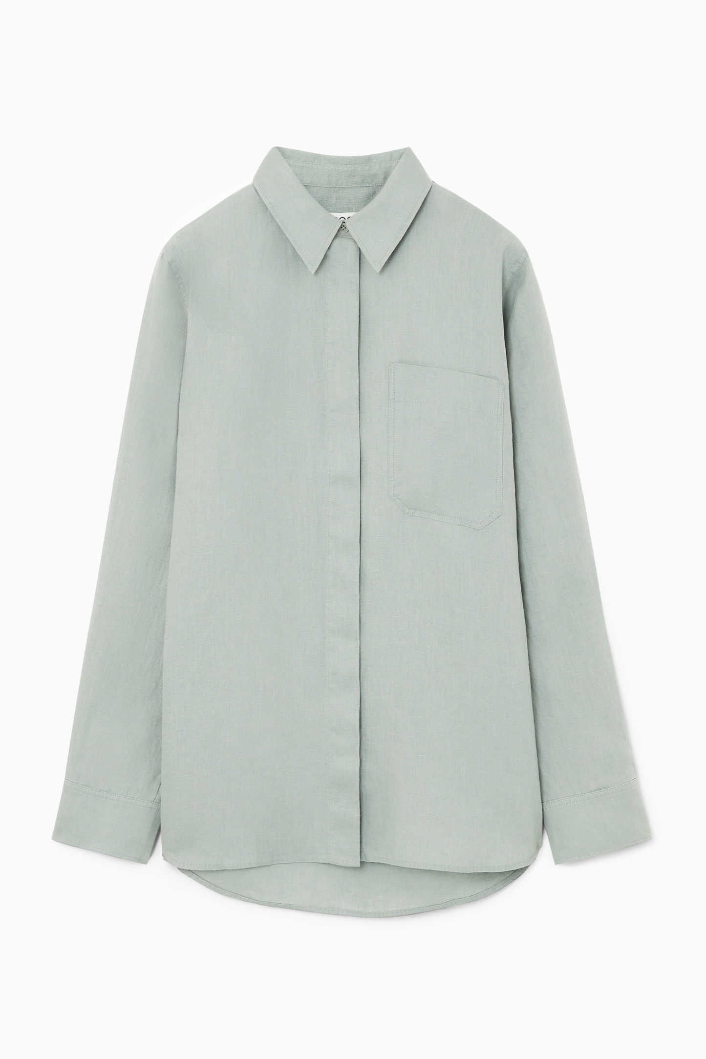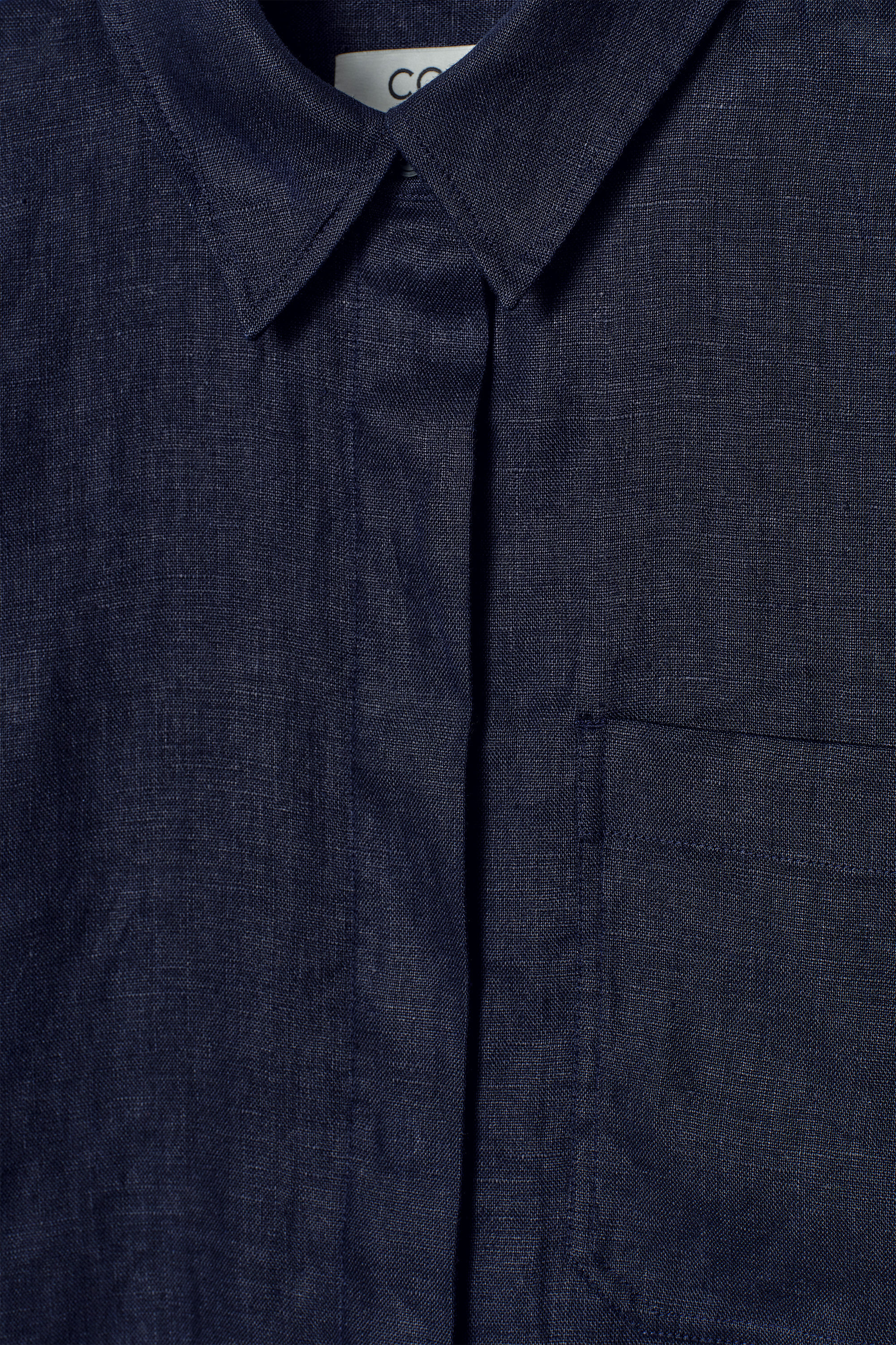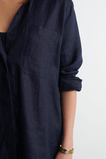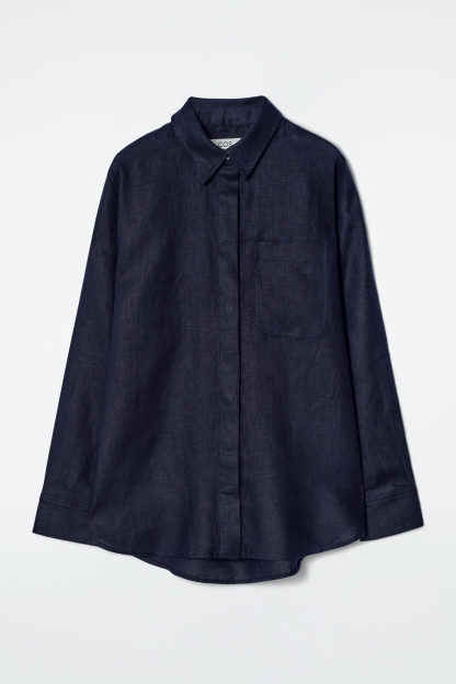Offered in a deep-navy hue, this classic shirt is crafted from pure linen that's breathable, lightweight and has natural texture. It's cut in an oversized shape that's perfect for wearing over tanks when the temperatures rise and designed with a pointed collar, patch pocket and a curved, stepped hem.