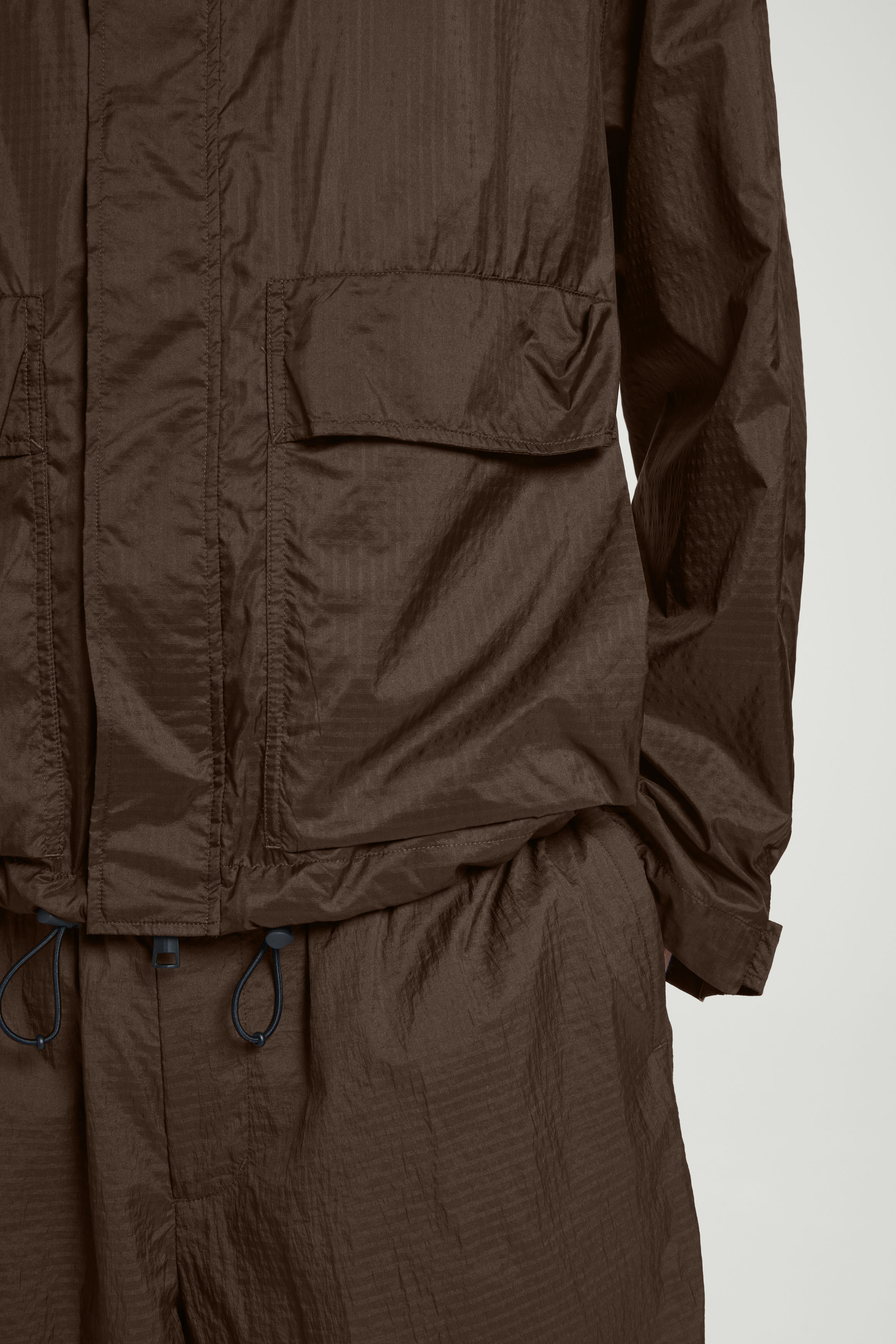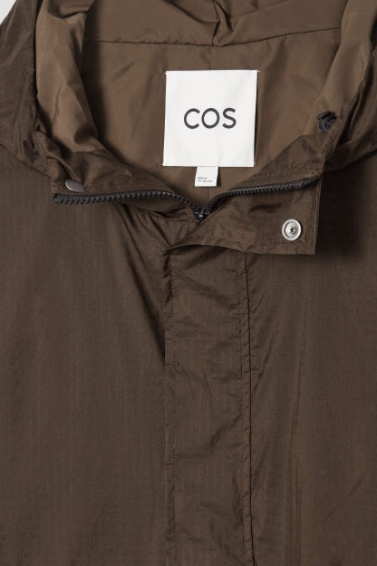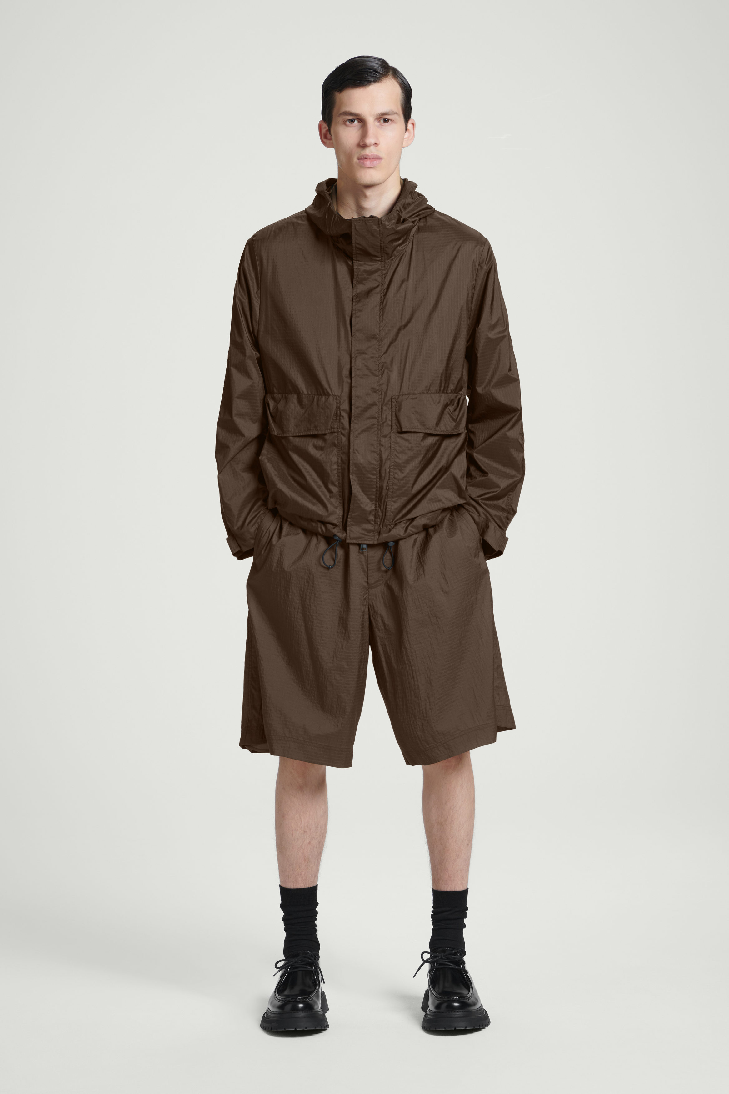 Funktionsdesign antar överdrivna proportioner i form av den här jackan i parachute-modell. Den är gjord av nylon med en mångsidigt brun färg och har en huva som kan justeras med en dragsko på insidan. Framfickorna med lock och åtkomst från två håll bidrar ytterligare till den praktiska designen. Styla med de matchande shortsen.