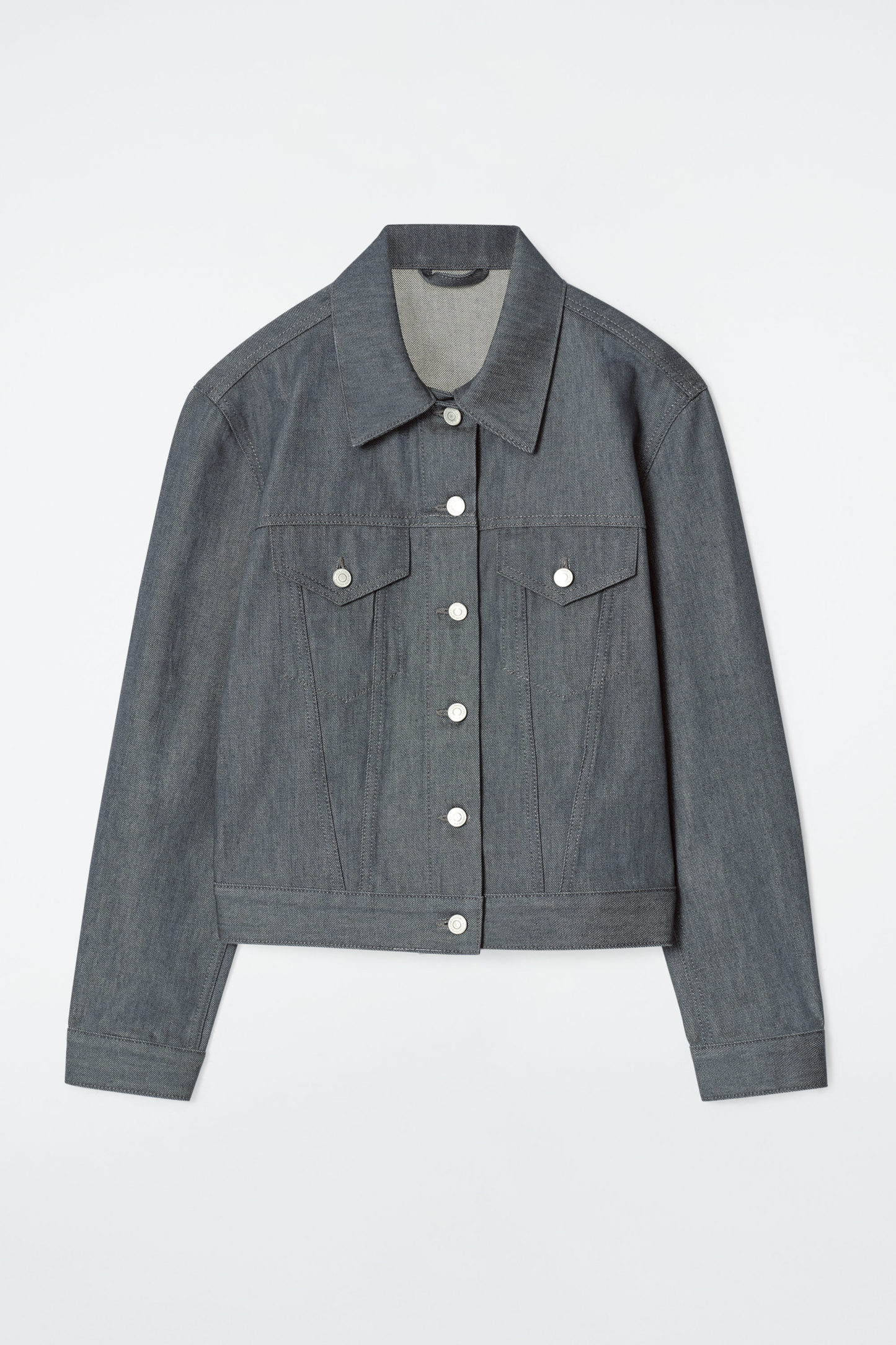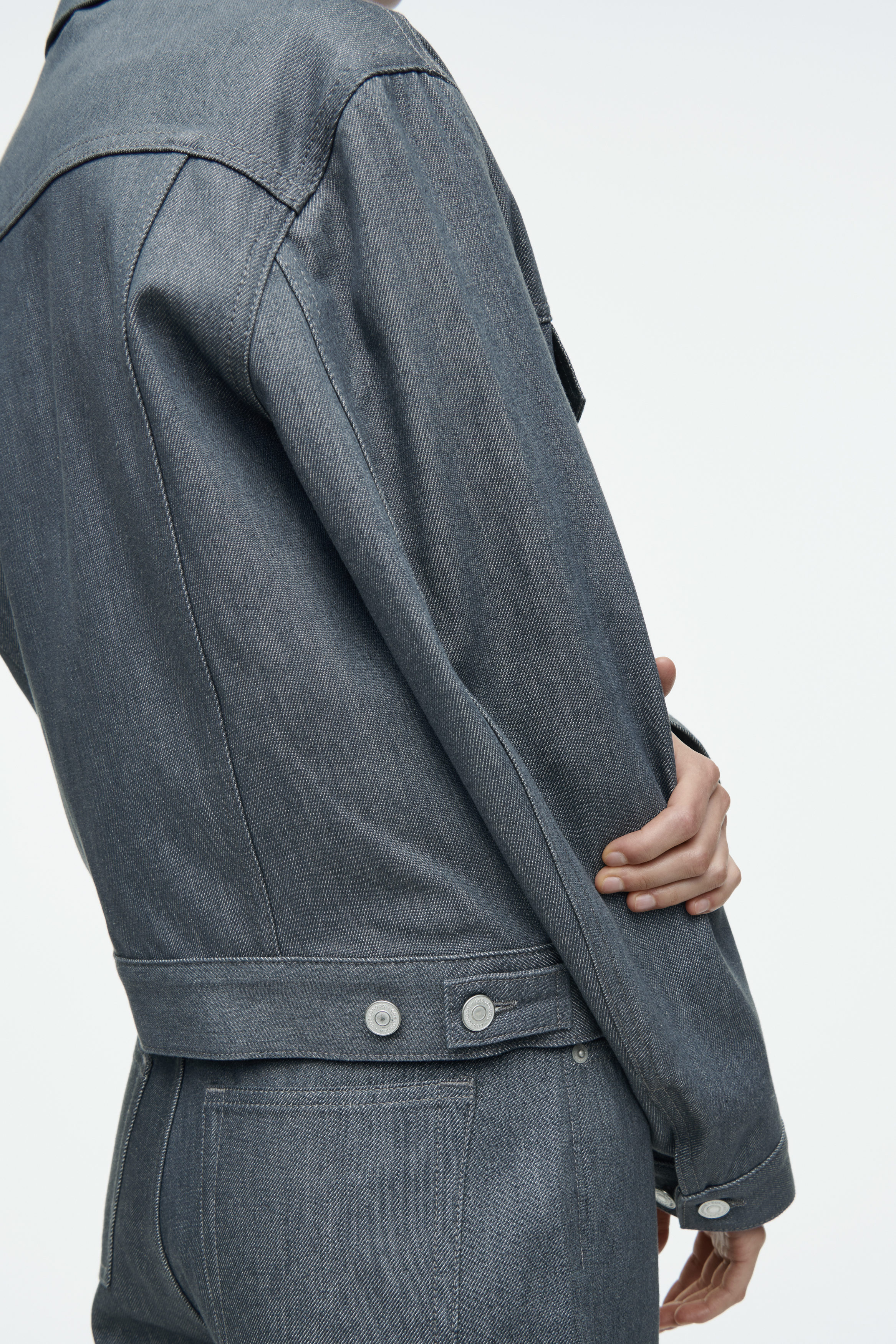 Denna jeansjacka är en modern tolkning av den klassiska truckersilhuetten Den är skuren i en oversize passform och tillverkad av ekologisk bomullsdenim i en ljusgrå nyans som lämnats rå för att bevara dess autentiska färg. Jackan har detaljsömmar, bröstfickor och justerbara band i fållen för en skräddarsydd passform. Styla den med de matchande jeansen för en fulländad look.