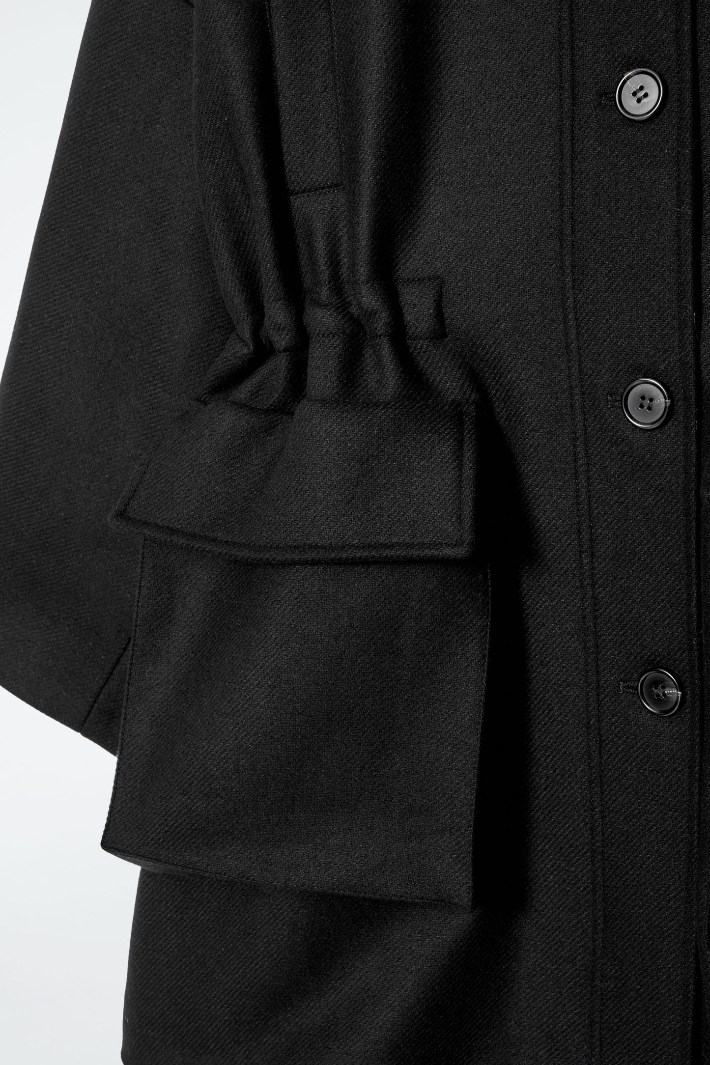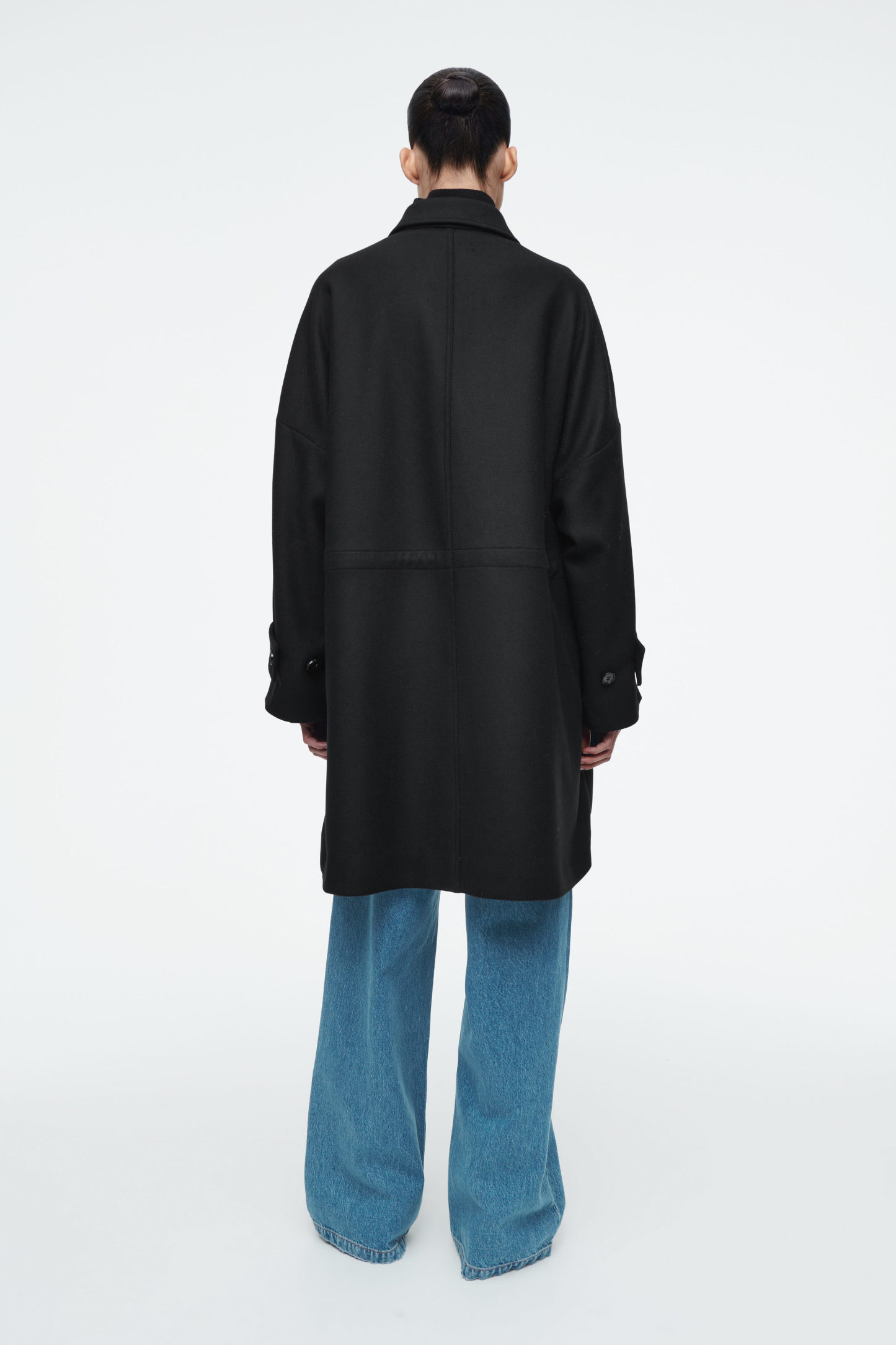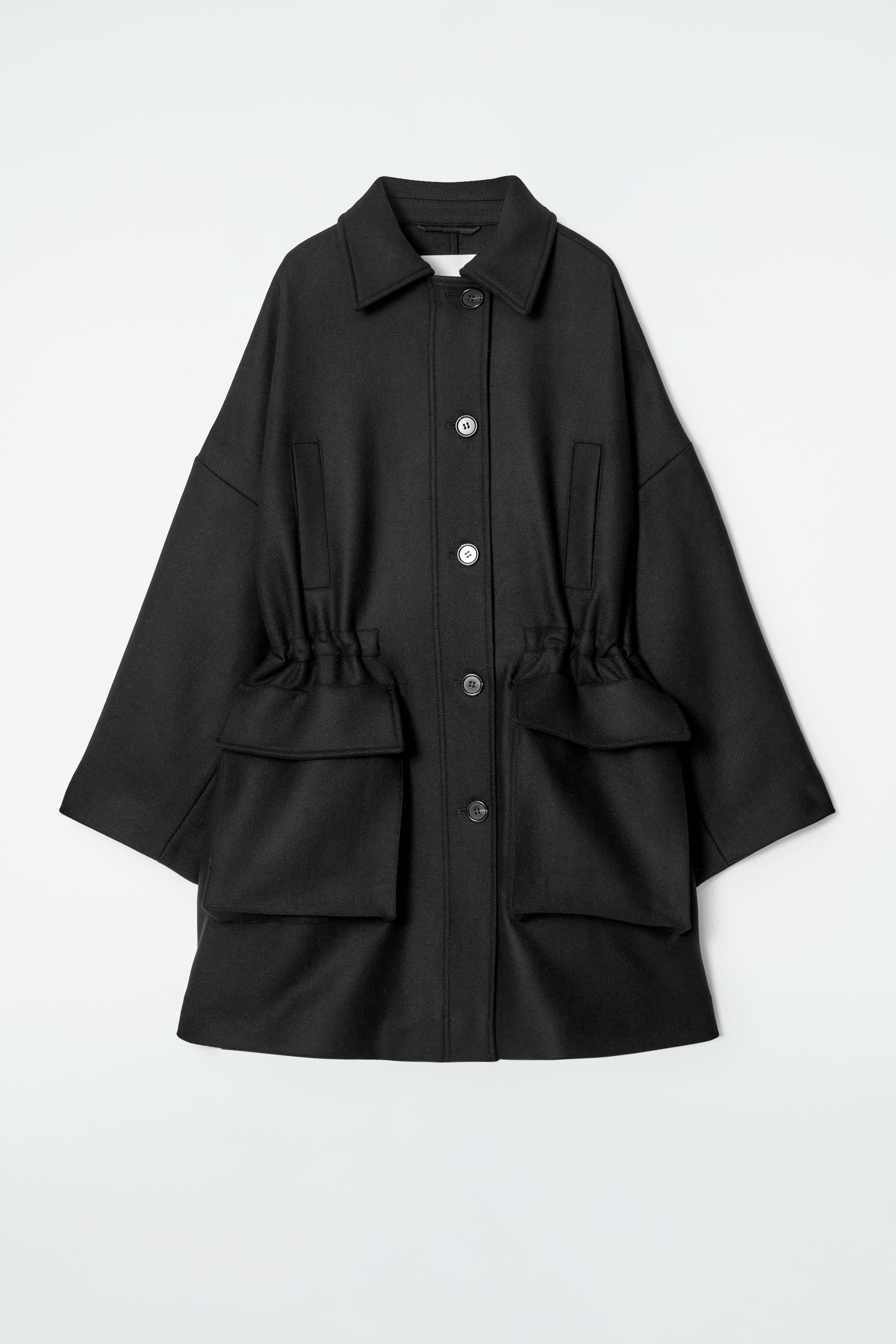Den här workwear-kappan kombinerar utility med moderna inslag vilket resulterar i elegant funktionalitet. Den är tillverkad i en premiumblandning av återvunnen ull och har en oversize silhuett som kan dras in i midjan tack vare det invändiga dragsko. Kappan har även praktiska stolpfickor och utanpåliggande fickor fram så att du får plats med alla små nödvändigheter, medan de justerbara ärmsluten ger en skräddad passform.