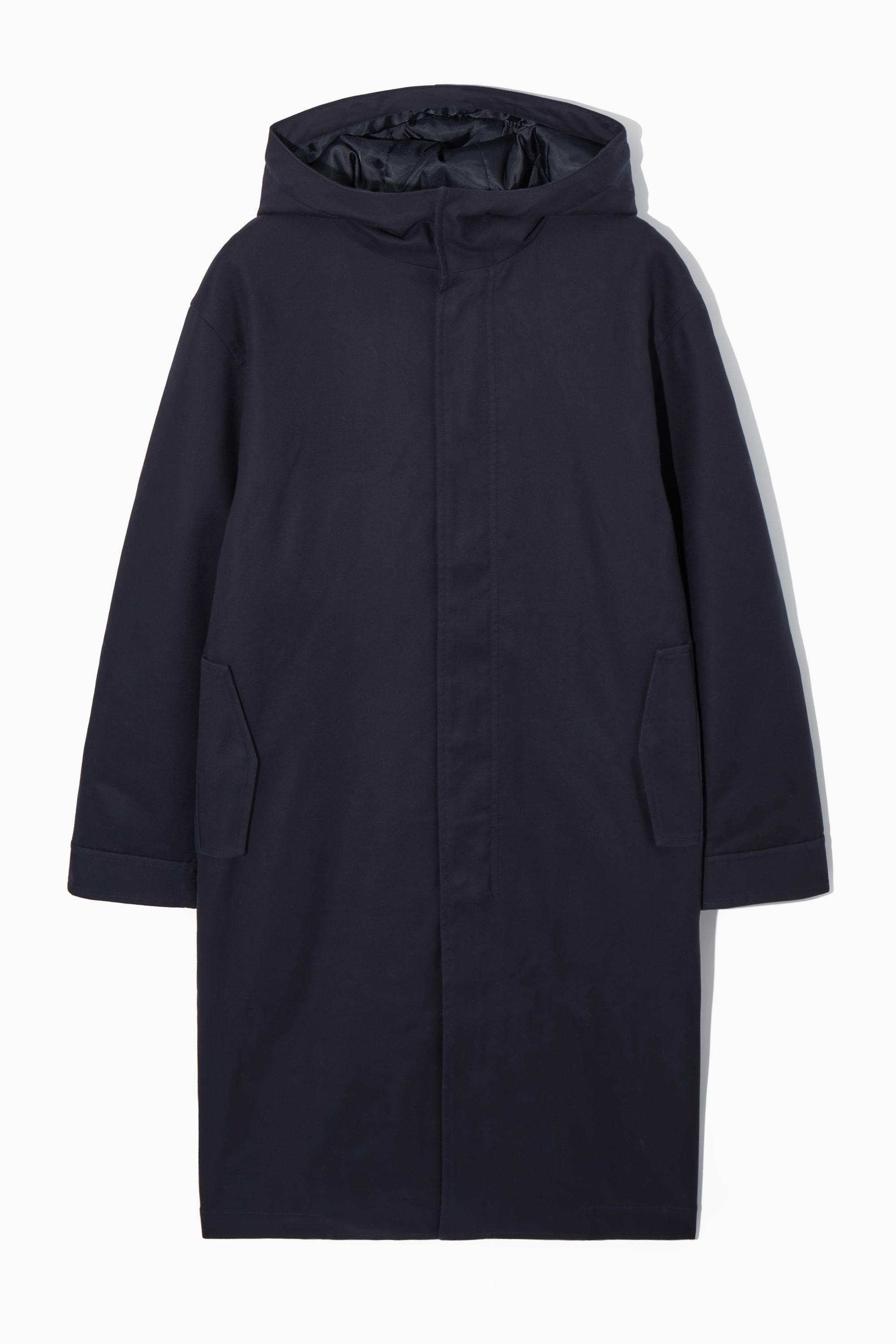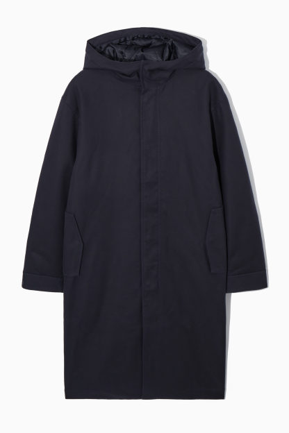 En klassisk parkas förblir ständigt relevant i din garderob. Den här är marinblå och gjord av bomull med lite stretch och har en design som slutar nedanför knäna för att skydda mot väder och vind. Den har också ståkrage och en omslutande luva samt tvåvägsdragkedja och tryckknappar för att stänga inne värmen. Det råder inga tvivel om hur detaljrik konstruktionen är – lägg märke till det quiltade fodret och dragskon på insidan som låter dig hitta precis rätt passform.
